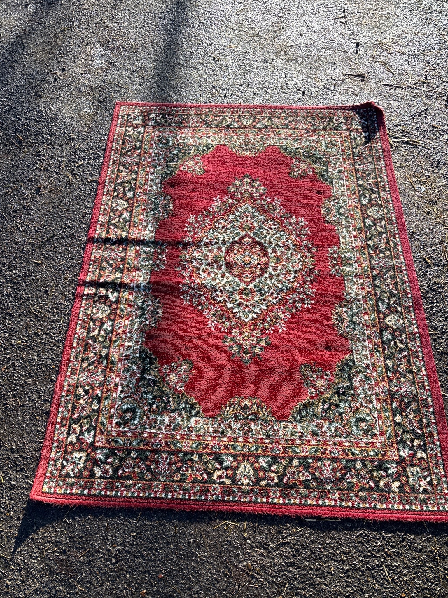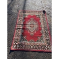 A red Persian-style rug with floral patterns, approx. 5x8 ft.