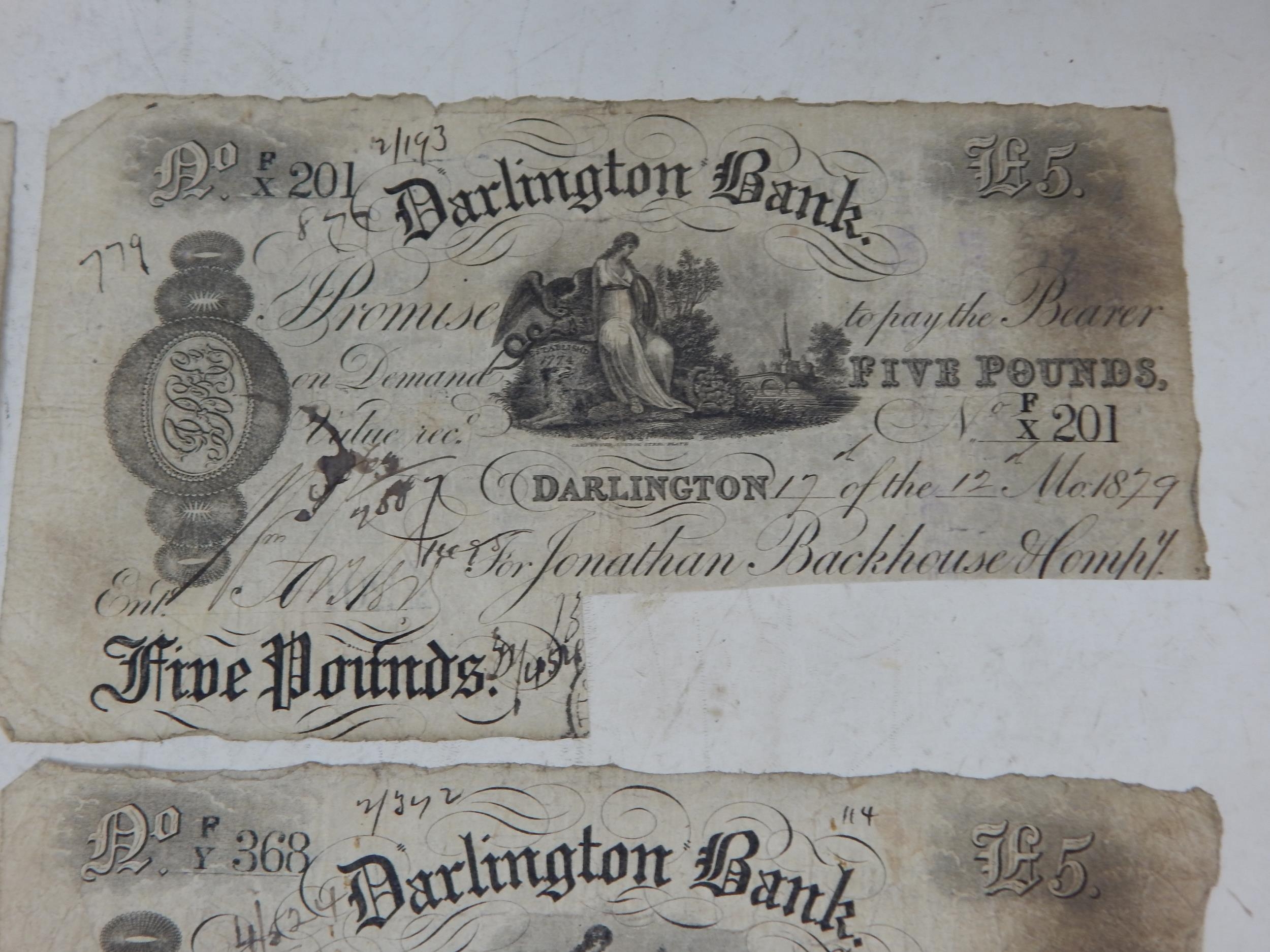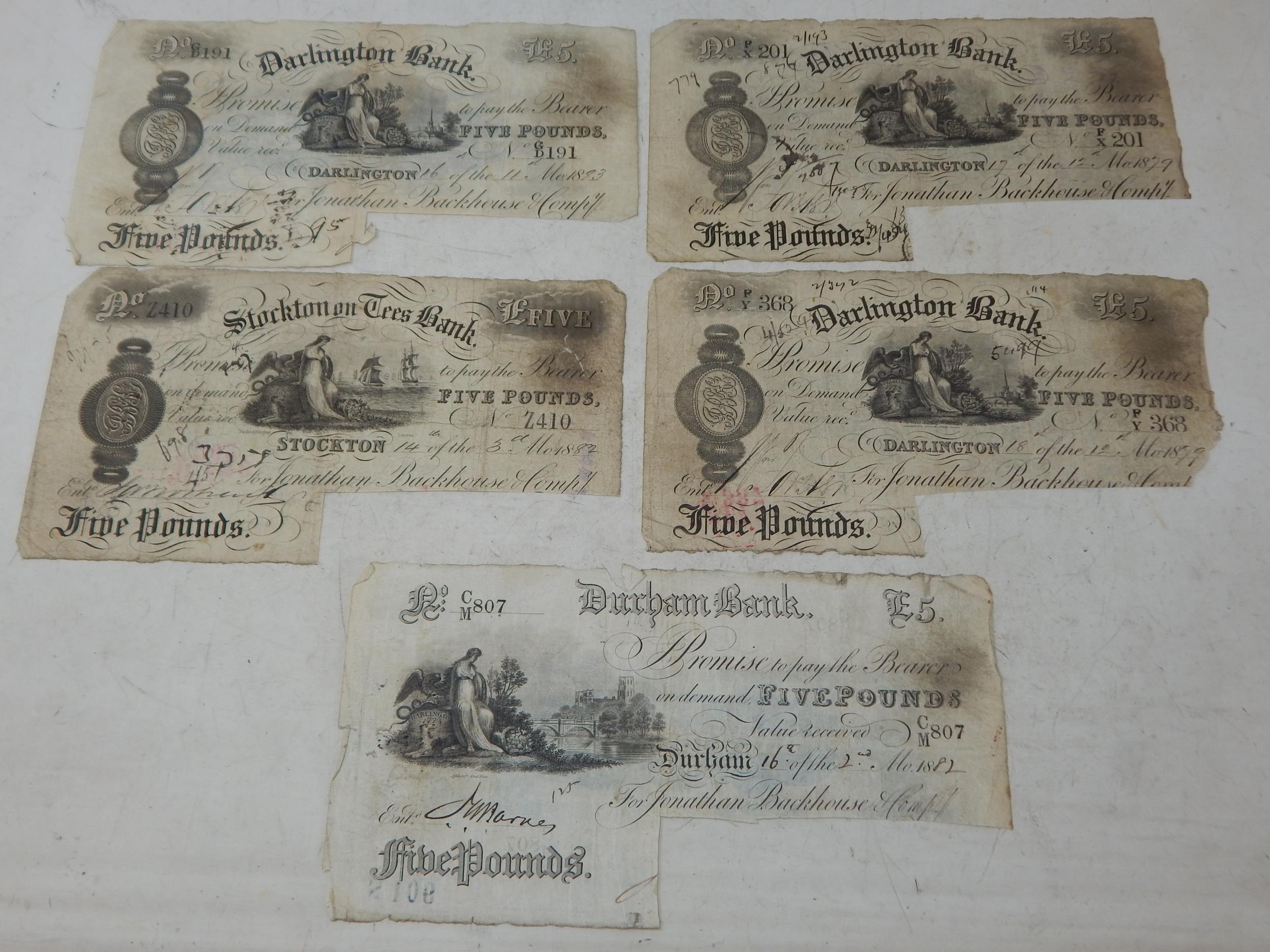 Group of 5 x Darlington Bank white £5 notes all dated 1870s -1880s (lot) Fair condition