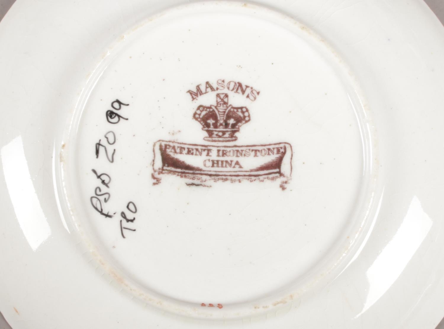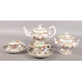 A collection of early 19th century Masons Ironstone teawares, pattern number 223. Teapot, sucrier and two cups and saucers with similar teapot stand.