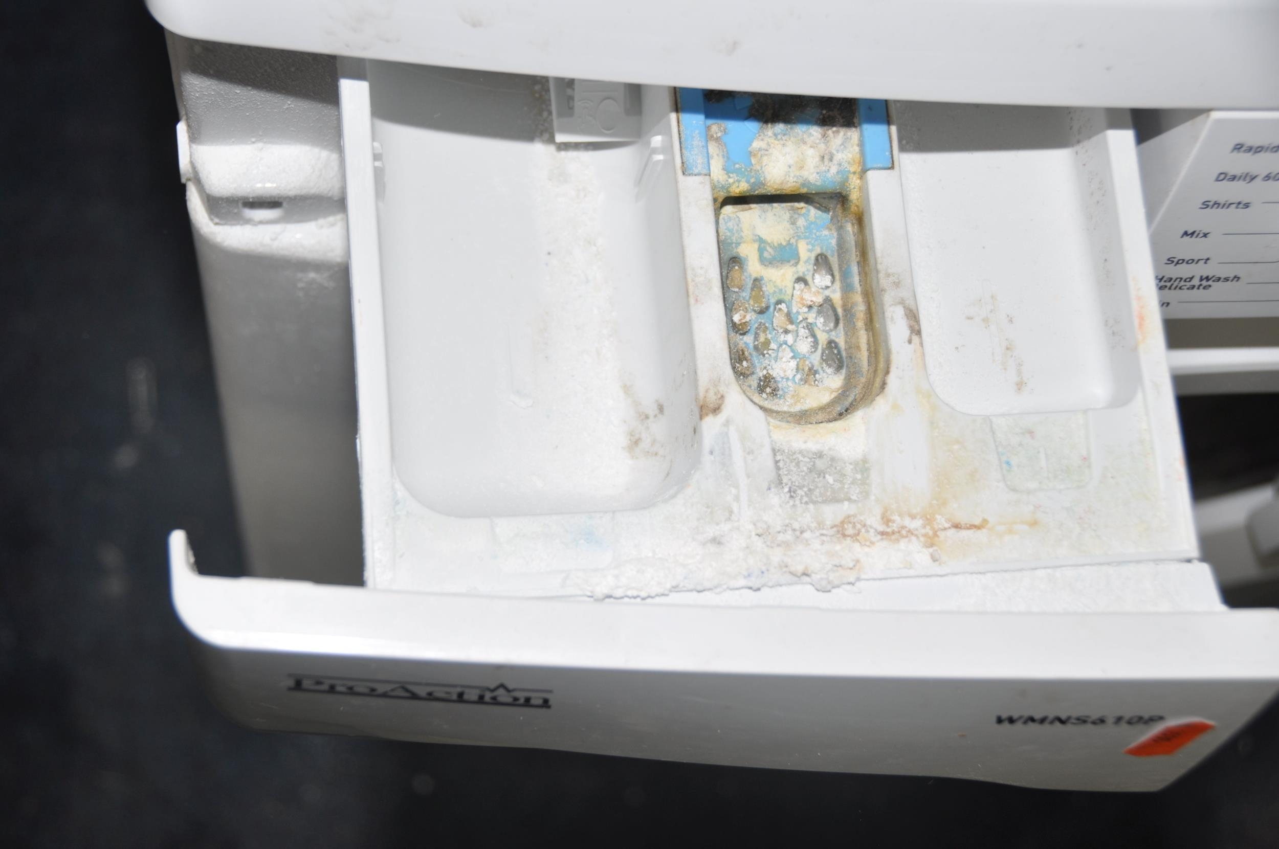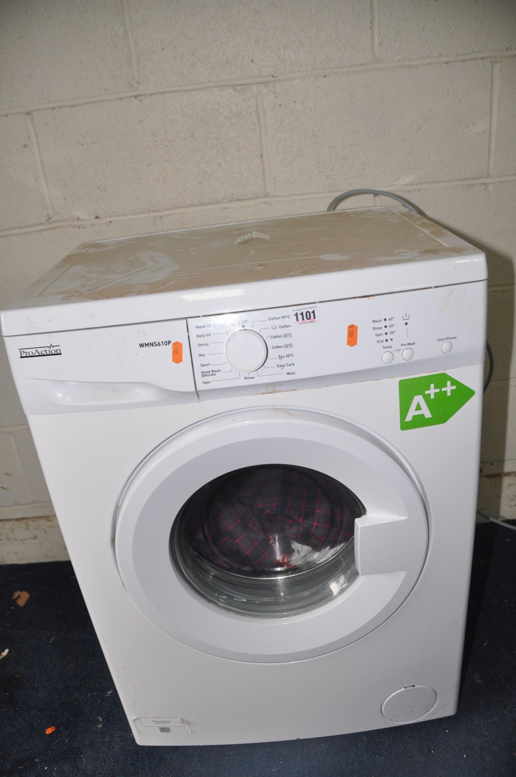 A PROACTION WMNS610P WASHING MACHINE, width 60cm x depth 50cm x height 85cm (condition - needs cleaning, washing powder residue in the tray) (PAT pass and working, spin cycle tested, no further testing) and a Goodmans hi Fi with two speakers (PAT pass and working but no cable for 2nd speaker)