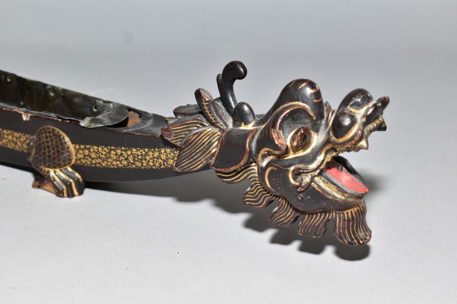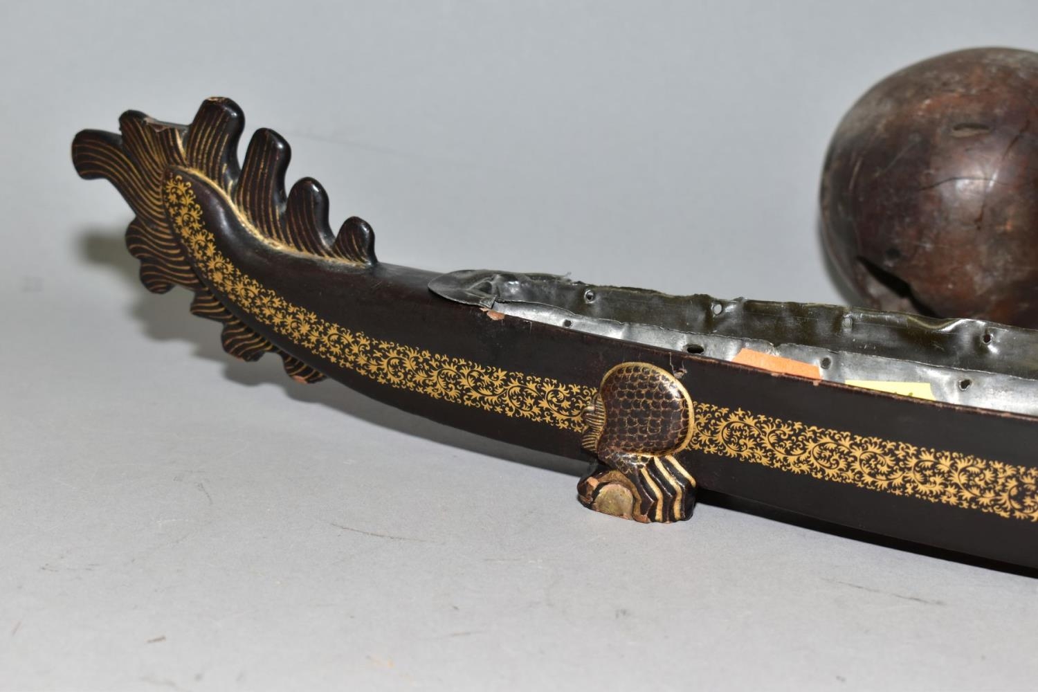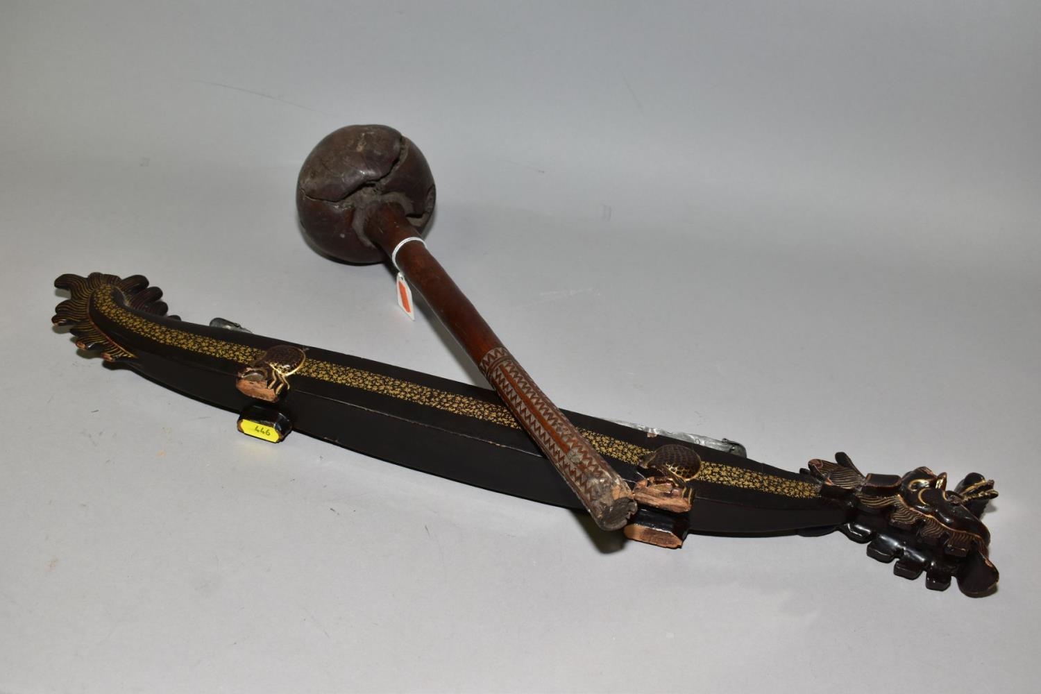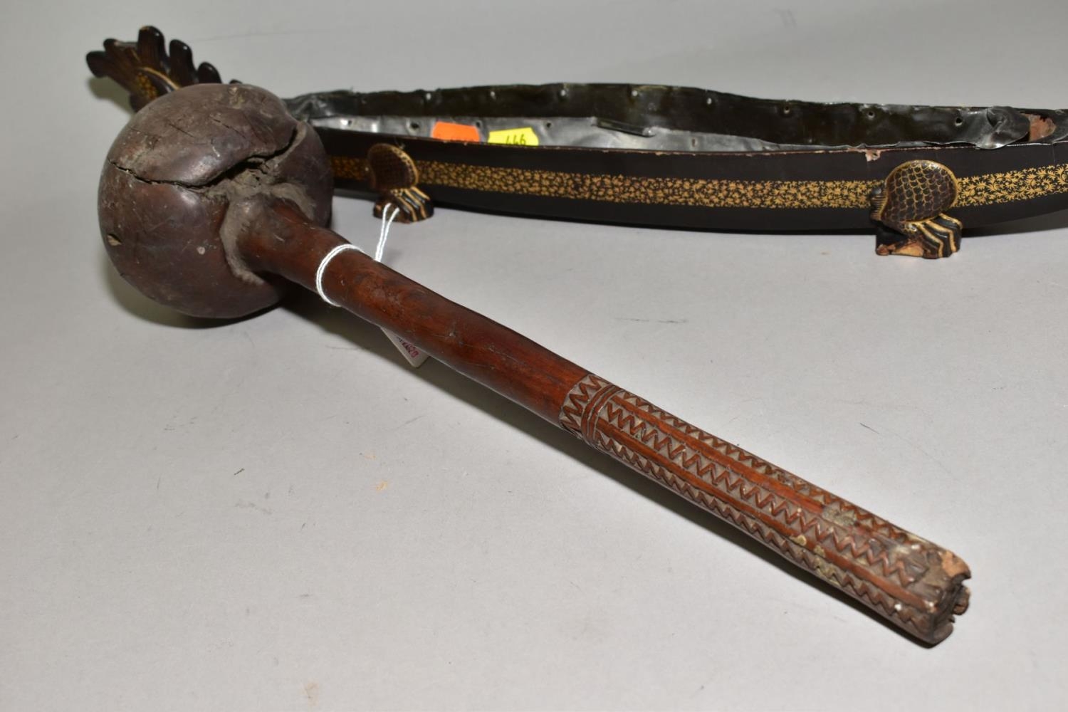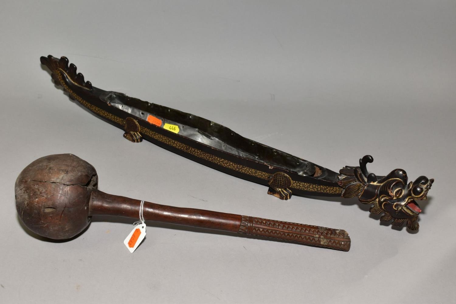 A POLYNESIAN THROWING ULA CLUB AND A 19TH CENTURY CHINESE BLACK LACQUER AND GILT DRAGON BOAT TIMEKEEPER, the club with carved handle, holes and splits to the head, length 43cm, the dragon boat with distorted metal liner, chipped nose, tail and horn, losses around rims, length 64cm (2)