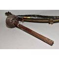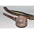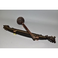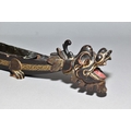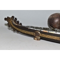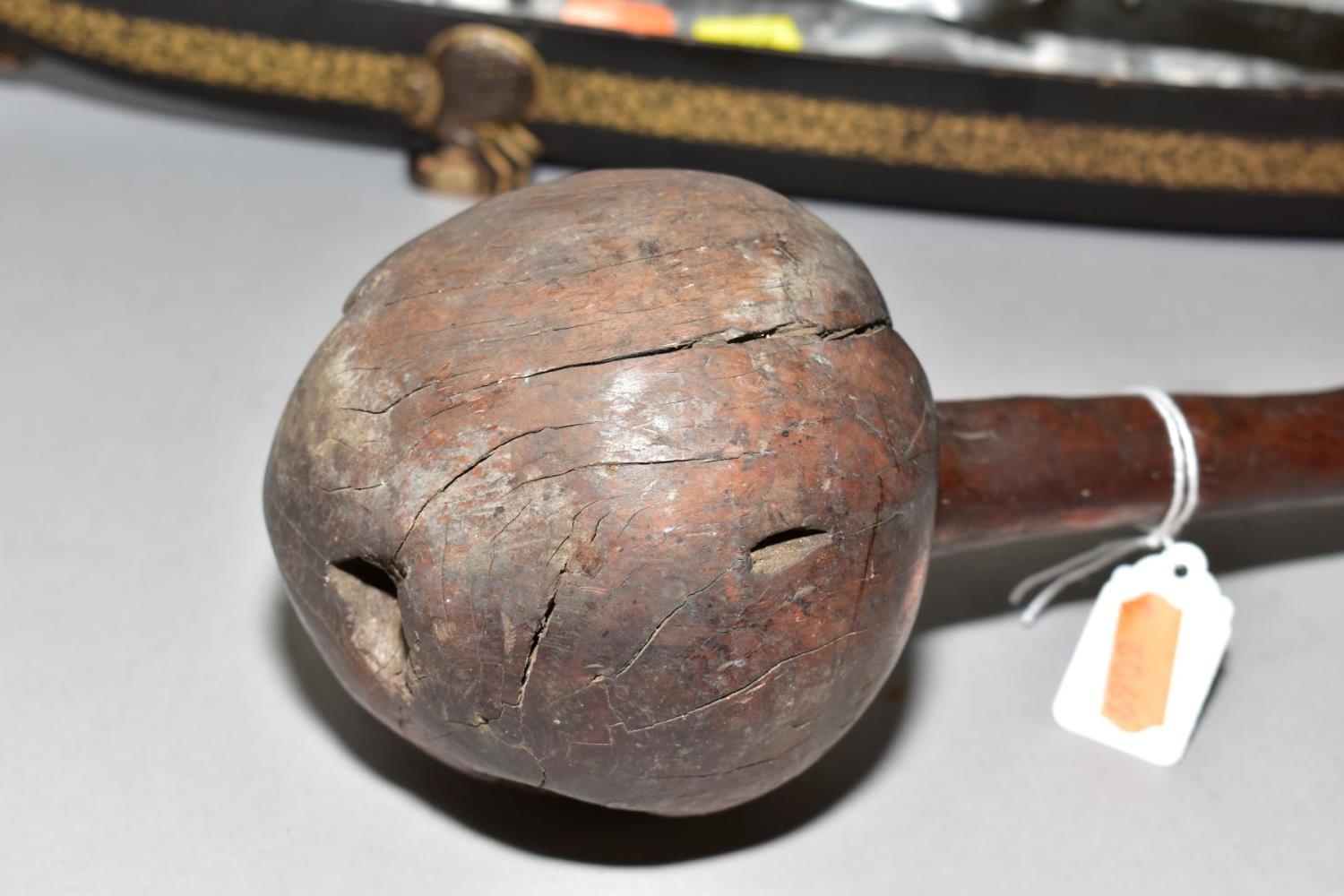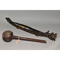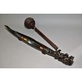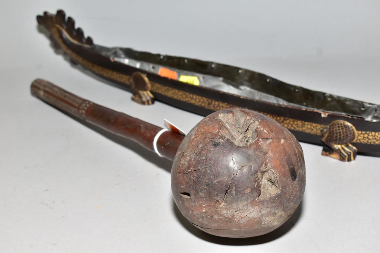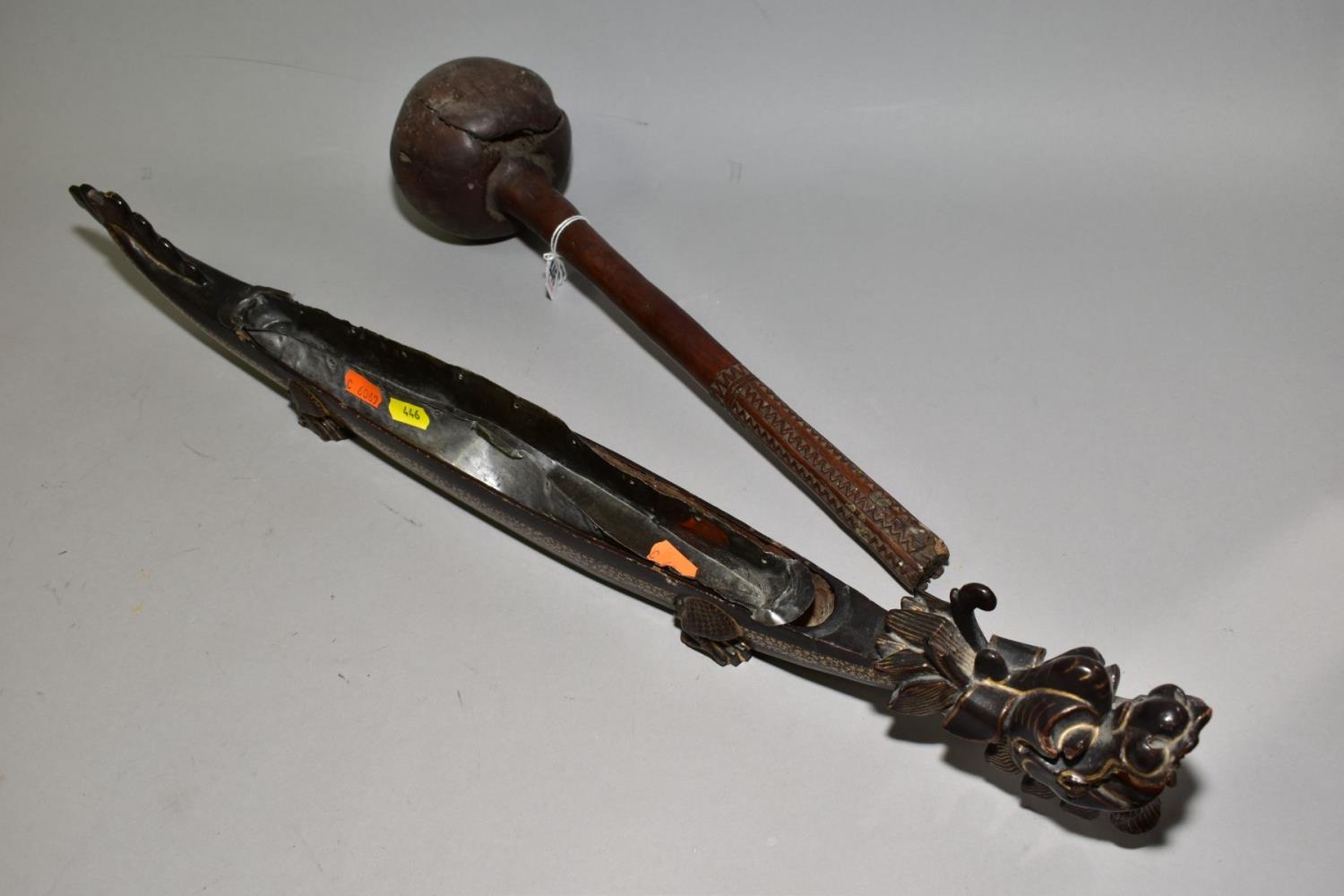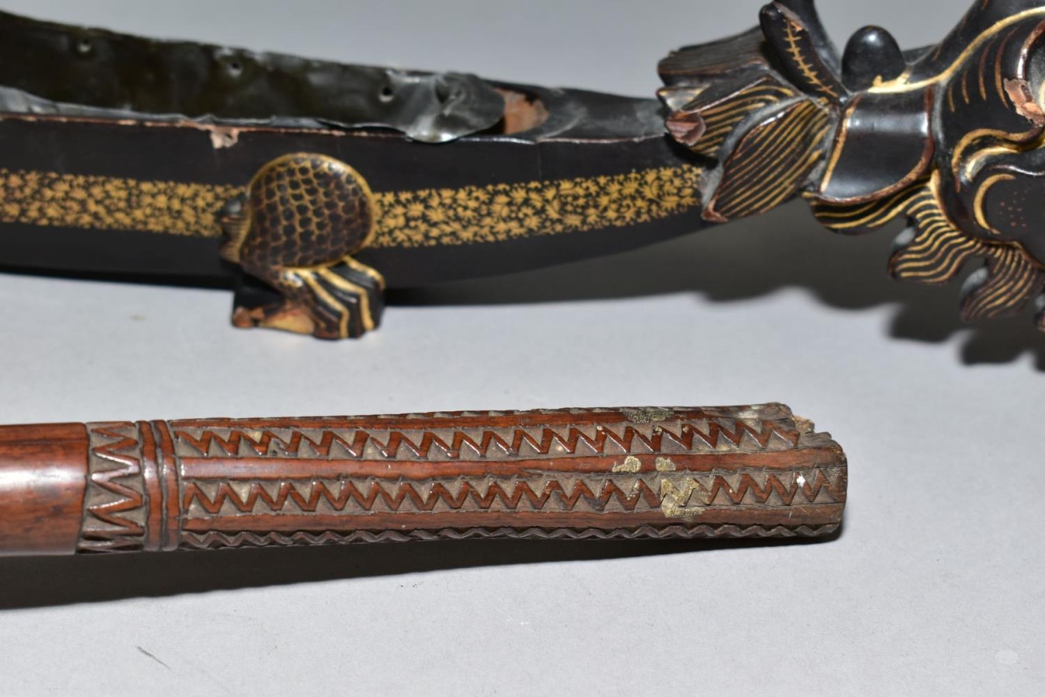 A POLYNESIAN THROWING ULA CLUB AND A 19TH CENTURY CHINESE BLACK LACQUER AND GILT DRAGON BOAT TIMEKEEPER, the club with carved handle, holes and splits to the head, length 43cm, the dragon boat with distorted metal liner, chipped nose, tail and horn, losses around rims, length 64cm (2)