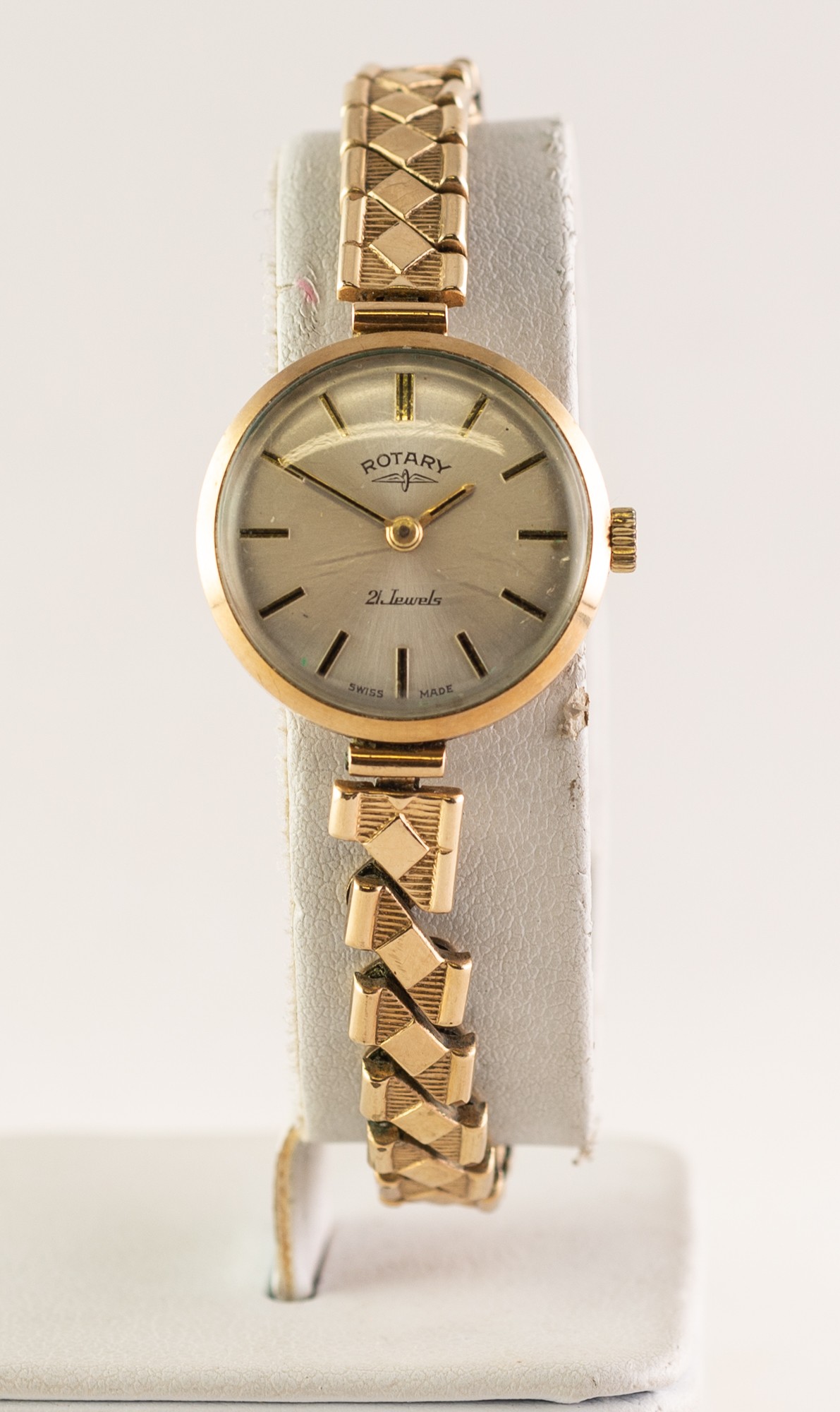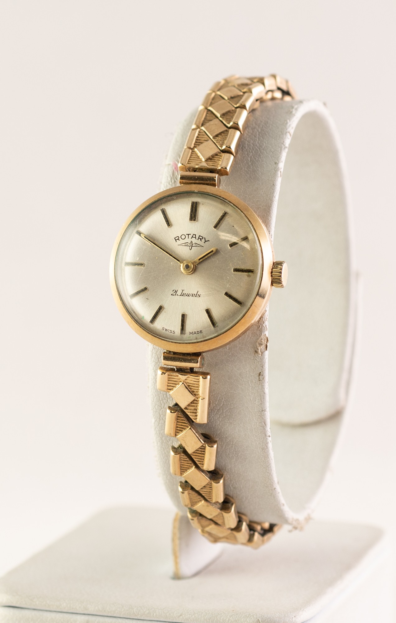 LADY'S ROTARY 9ct GOLD SWISS WRISTWATCH with 21 jewels mechanical movement, circular silvered dial with batons and the EXCALIBUR 1/5th ROLLED GOLD BACK AND FRONT EXPANDING BRACELET, London hallmark 1969, in associated maroon morocco case, (c/r good and working)