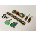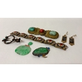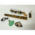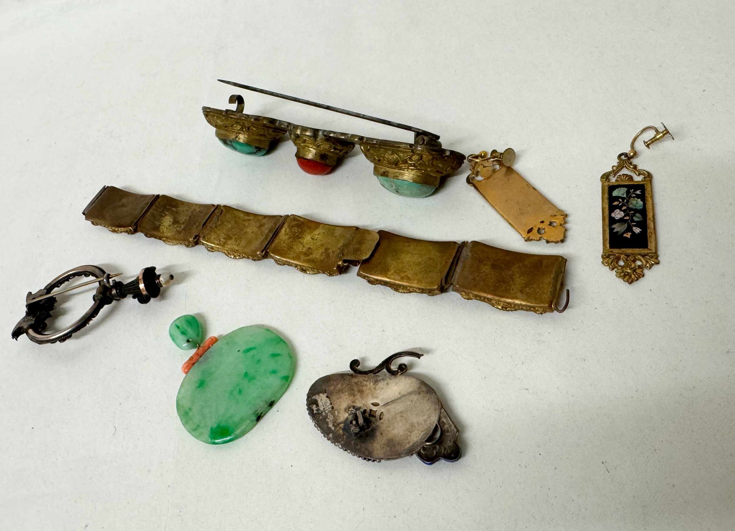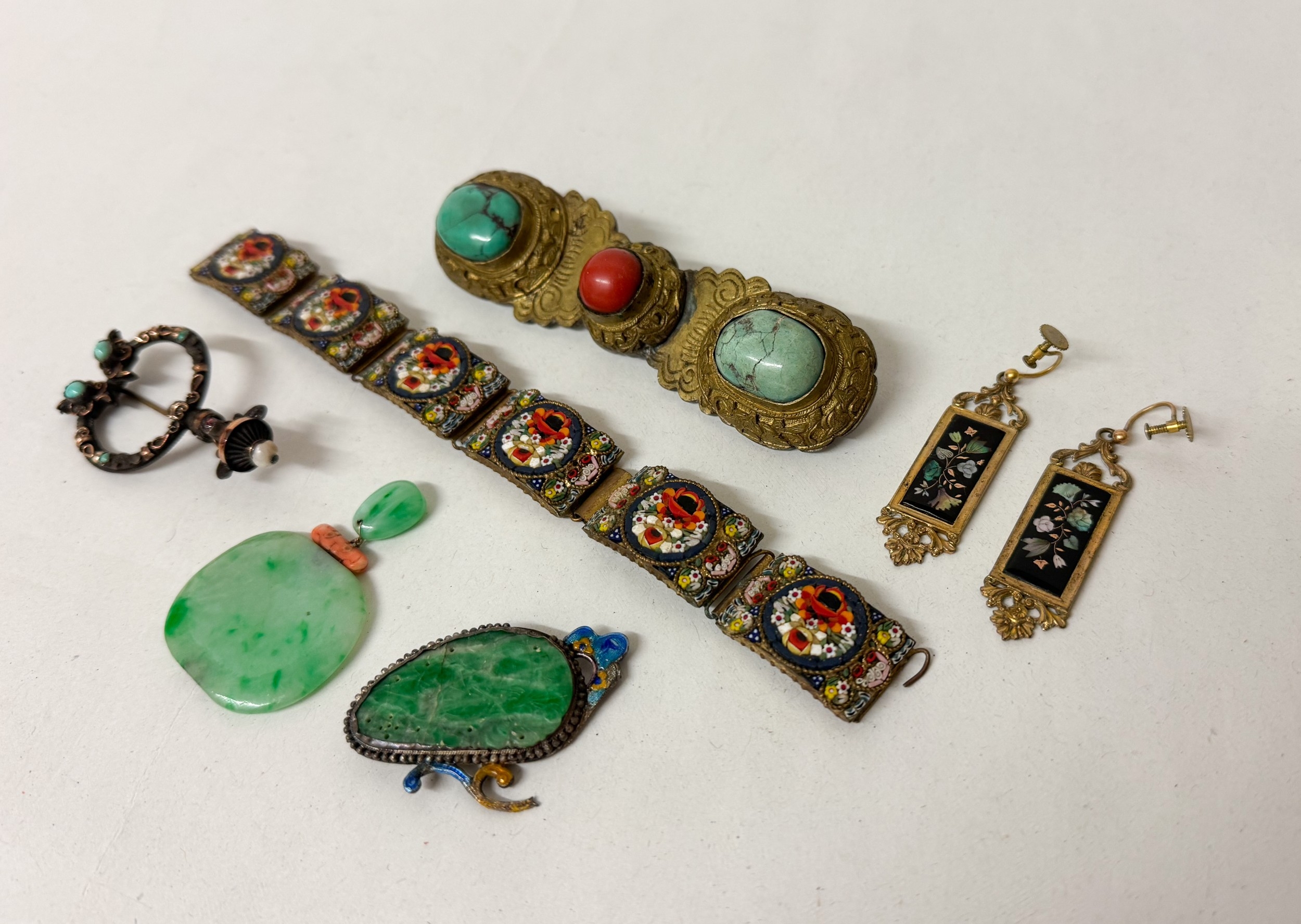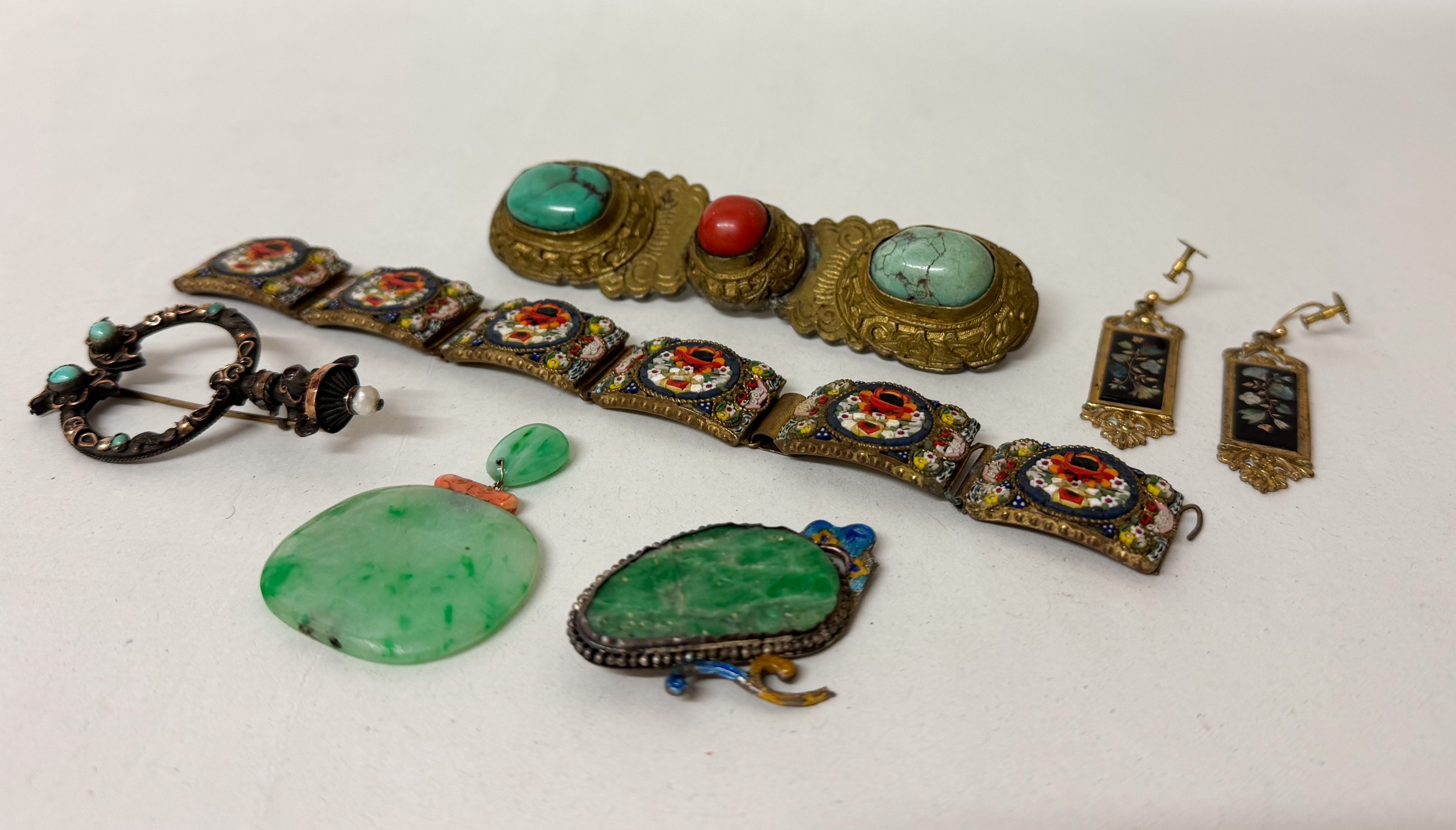 Italian micro mosaic panel bracelet, a silver and gold stone set fibula pin, Oriental Jade pieces, coral and turquoise large brooch and a pair of drop earrings.