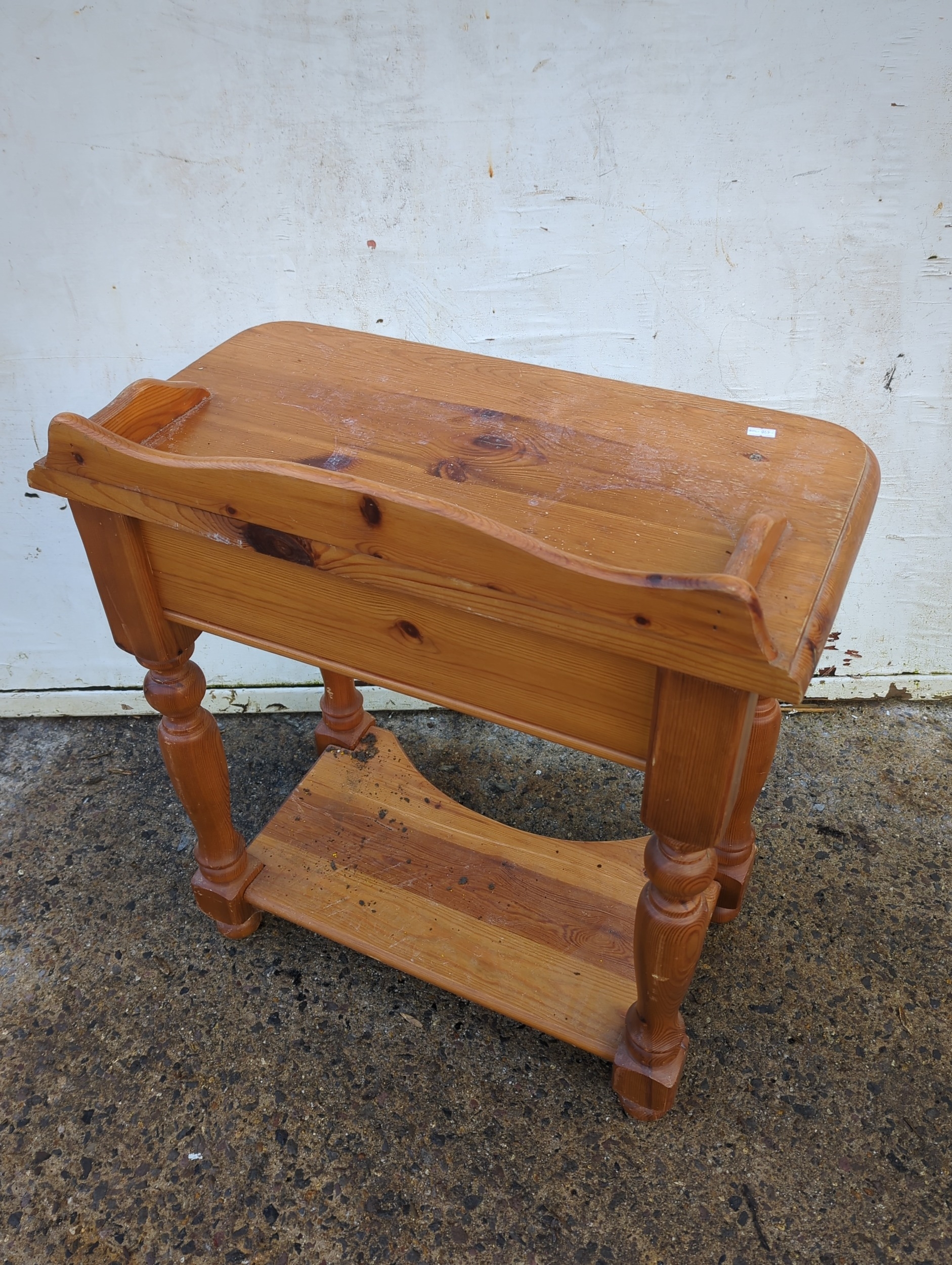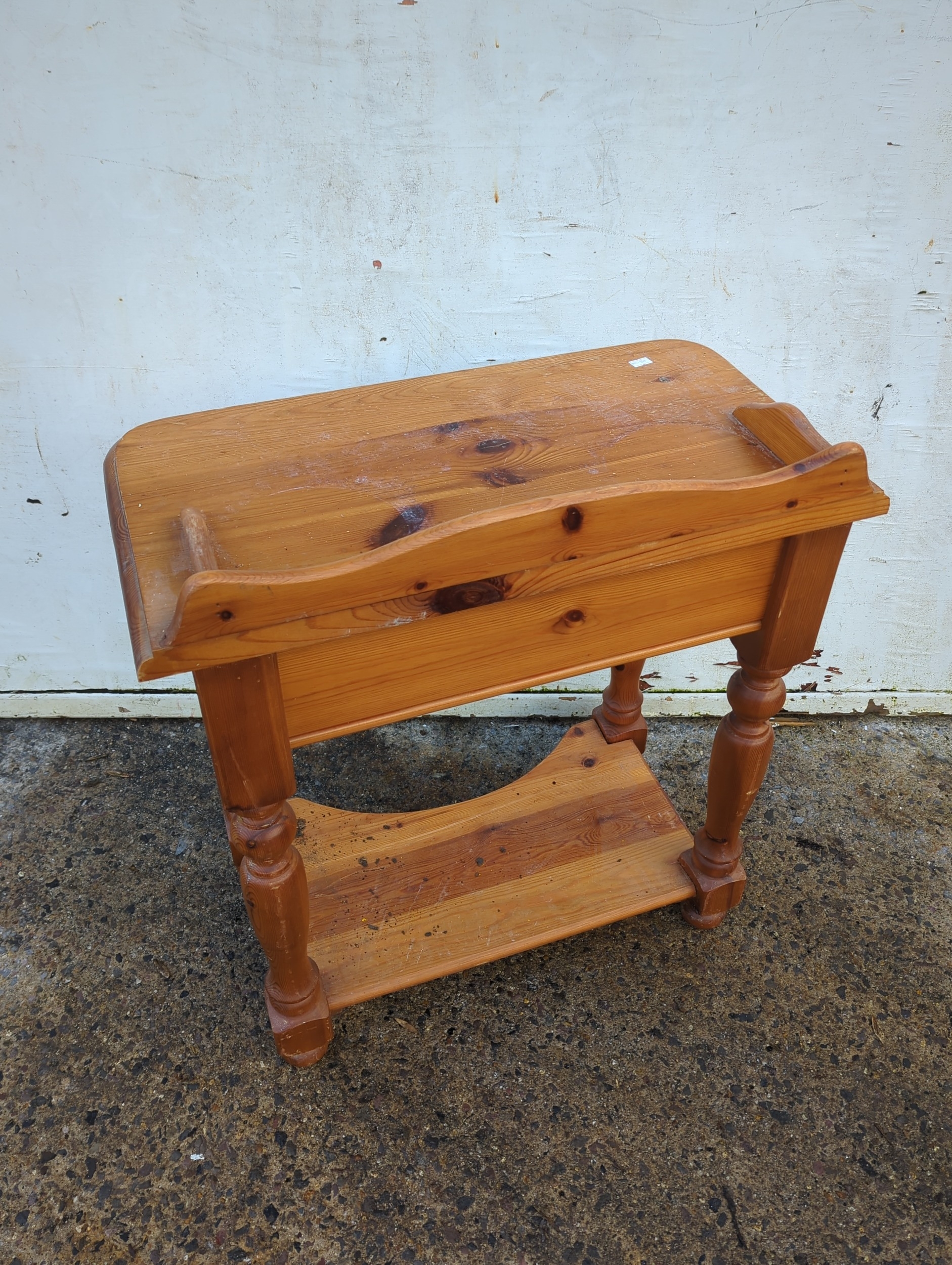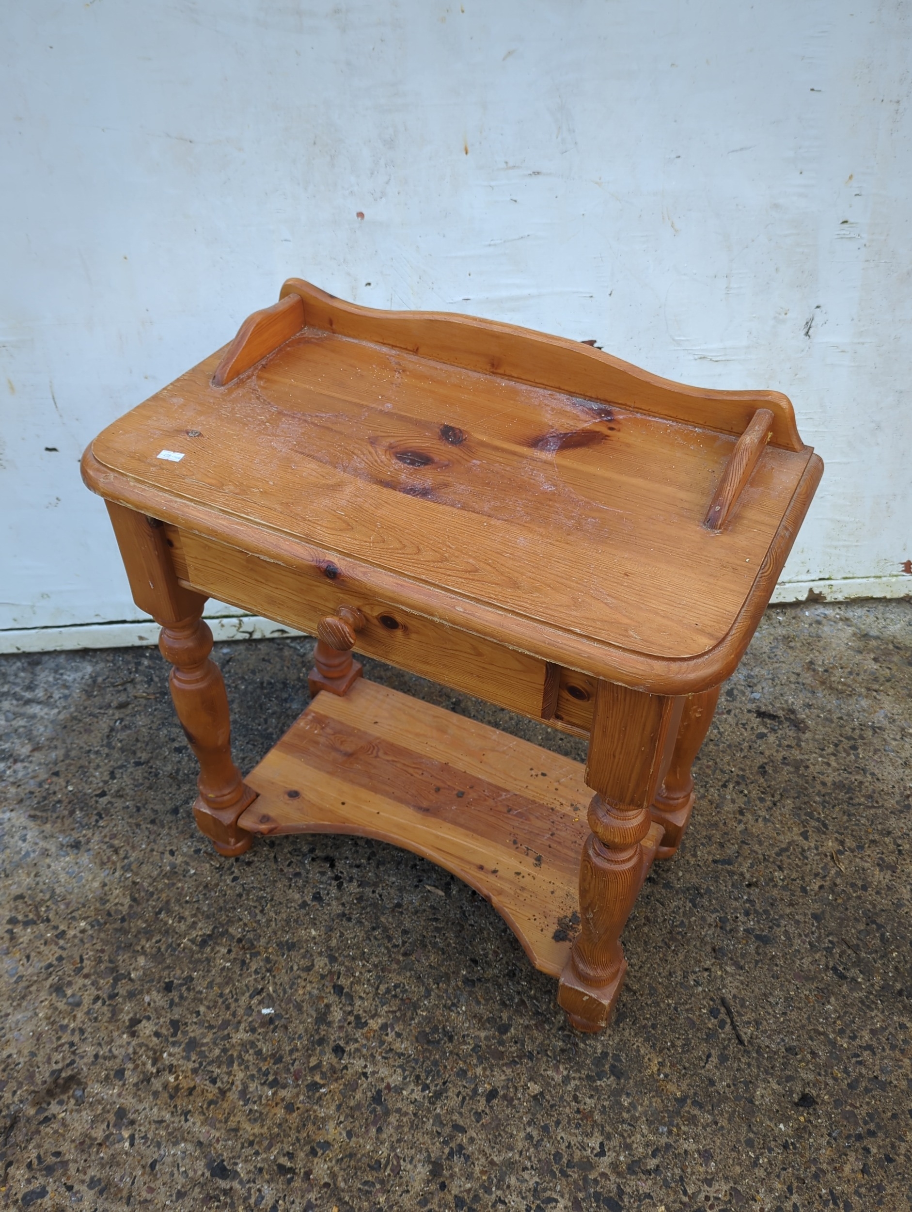This is a sturdy pine side table featuring a single drawer and elegantly turned legs. Its top surface showcases a curved edge design, adding a rustic charm to any room decor. The pine wood grain and knots are prominently visible, enhancing its natural appeal.