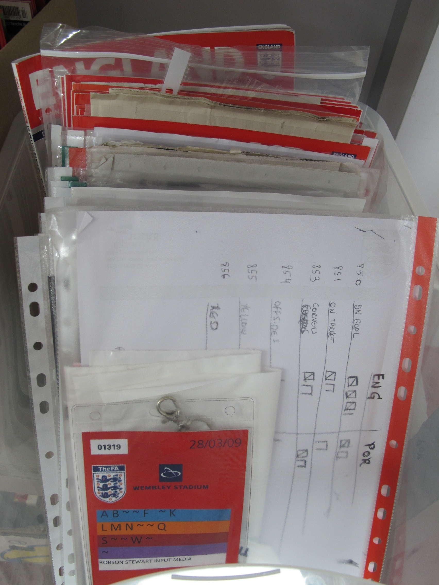 England Home Programmes 2005-2011(x 44), lanyards, post match pass, team sheets, newspapers,, etc:- One Box.