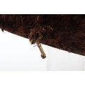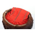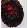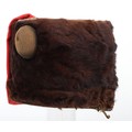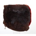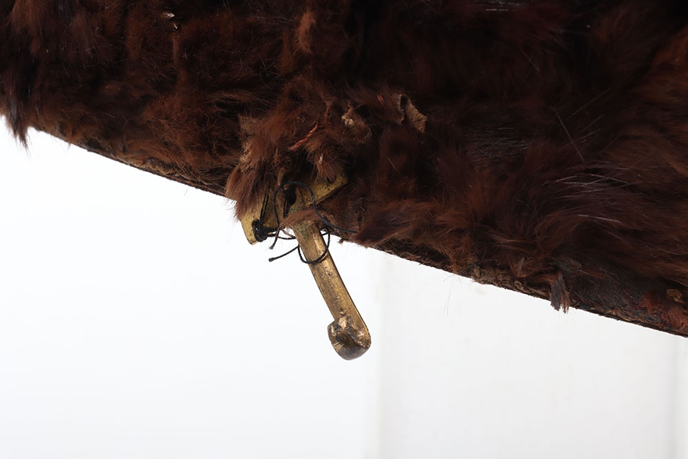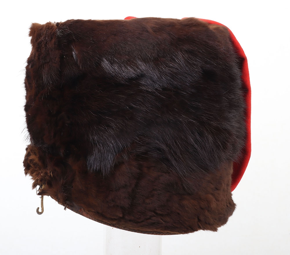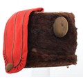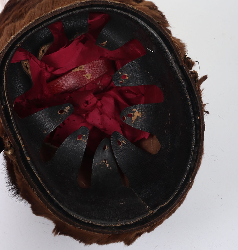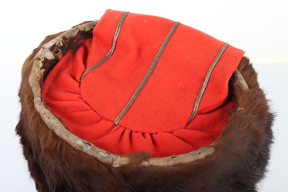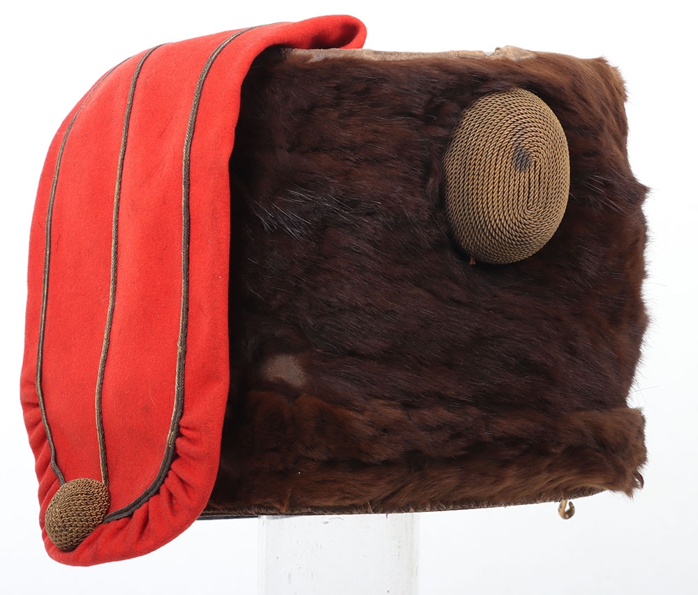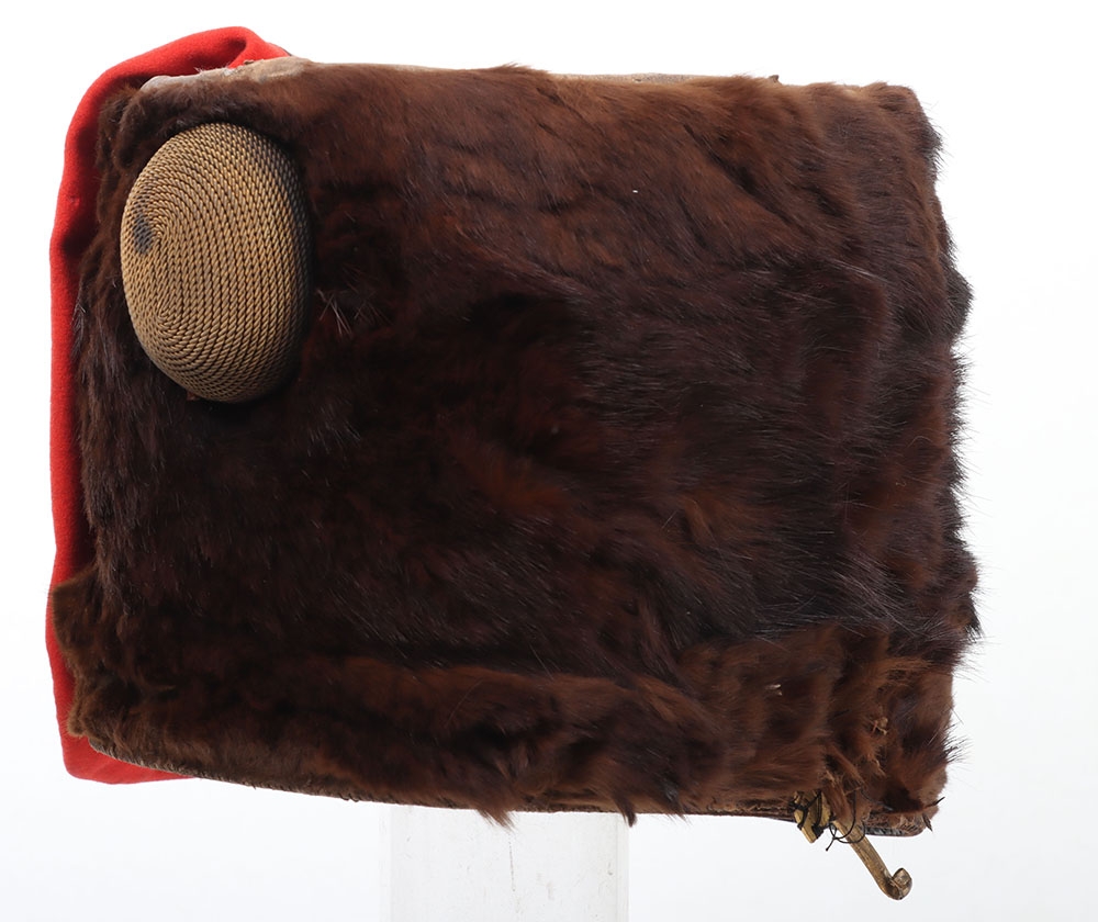 Hussar Officers Busby. Brown fur busby with scarlet bag having gilt lace and button, fitted with oval gilt cord cockade. Leather headband with crimson lining. Fur in very poor condition, internally headband and lining damaged, bag and cords not original to busby.