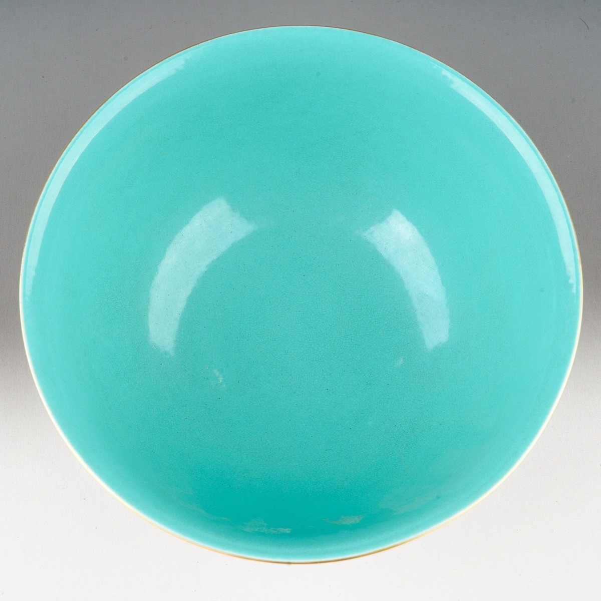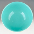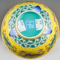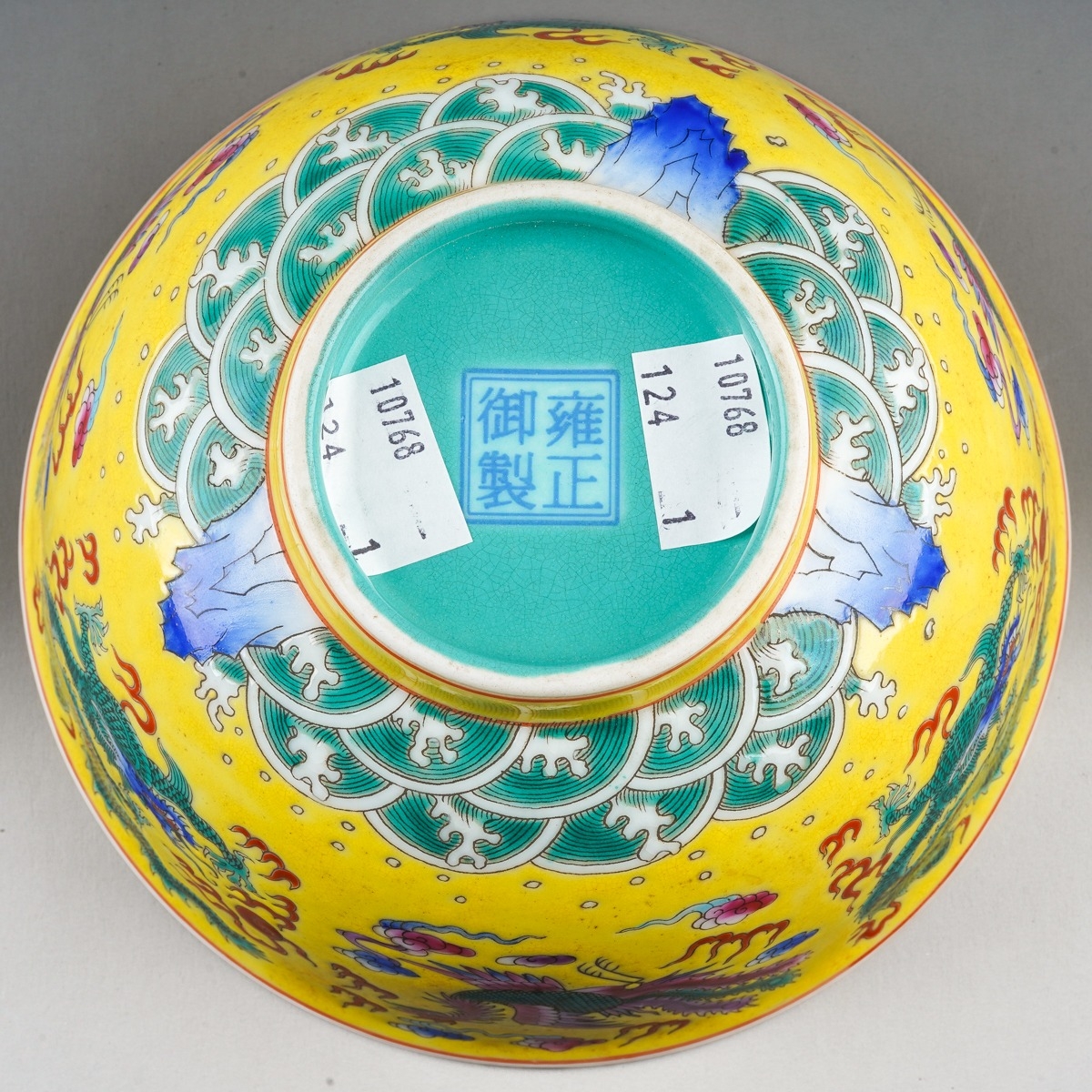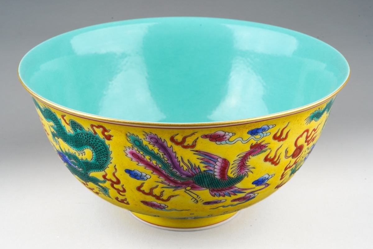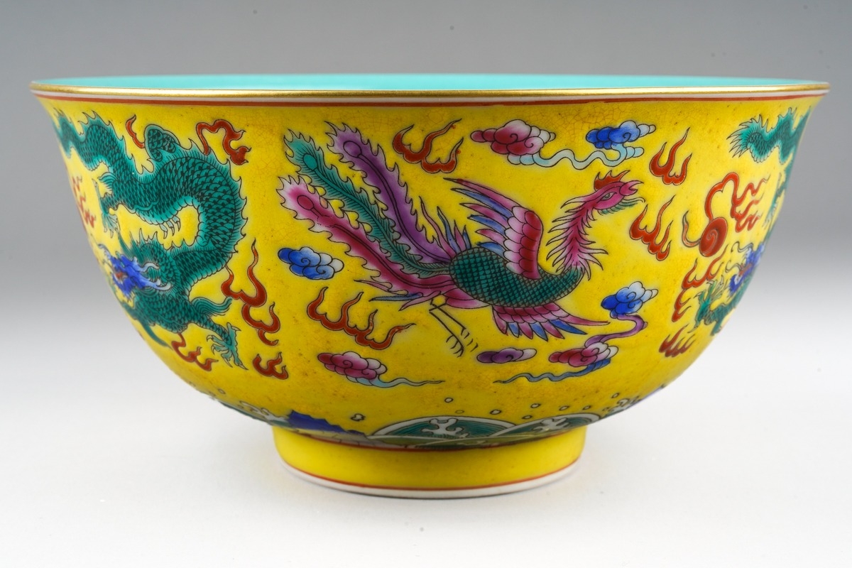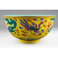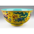 A 20th century Chinese famille rose footed bowl on a yellow ground, turquoise interior, enamelled with dragons and mythical birds above water, seal mark to base, diameter 16.5cm