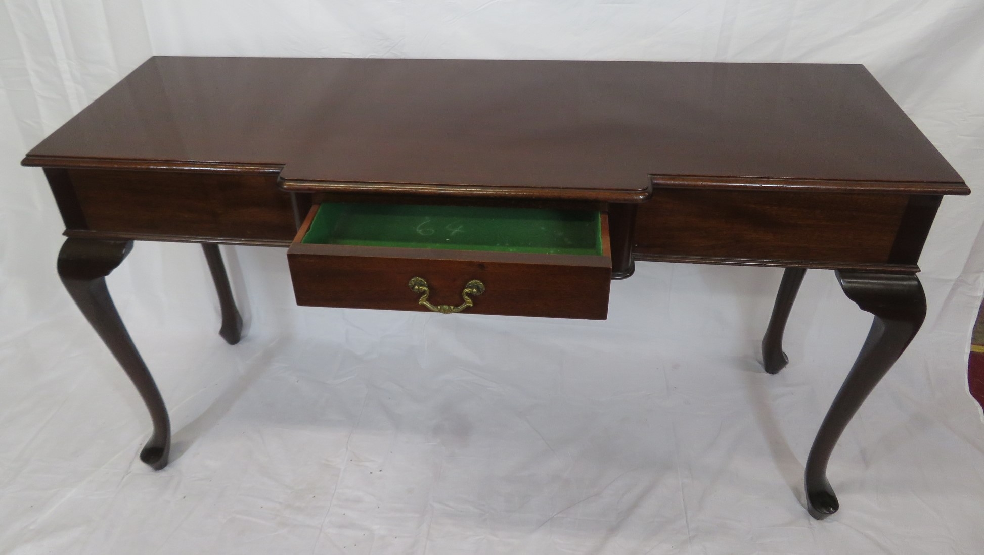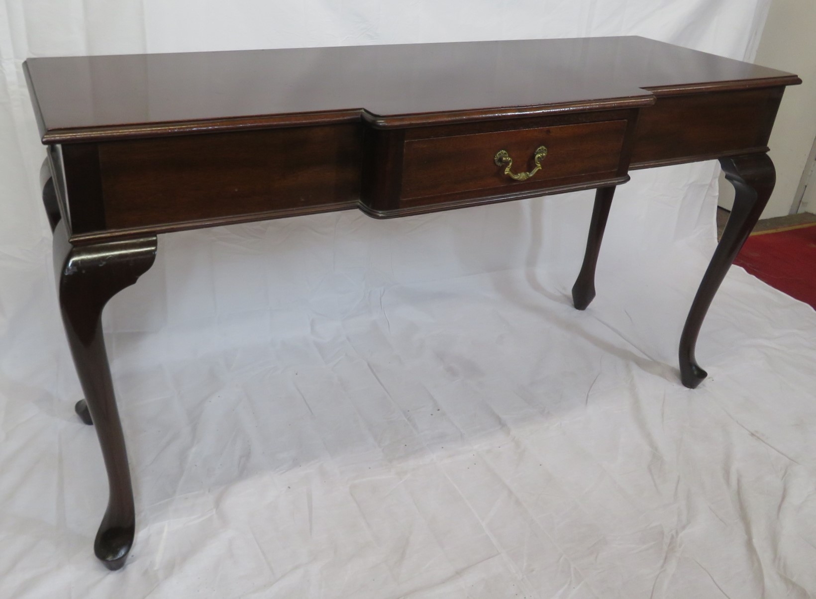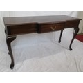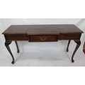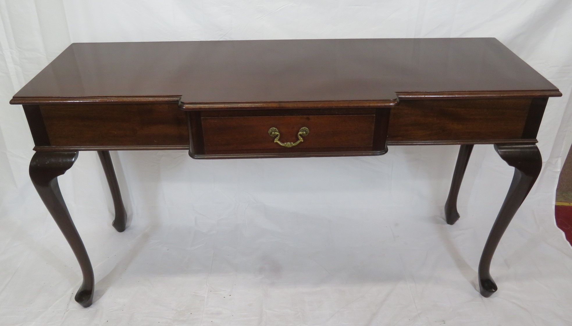 Victorian design mahogany breakfront sideboard with frieze drawer, brass drop handle, on cabriole legs with pad feet