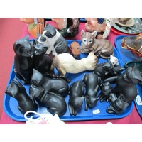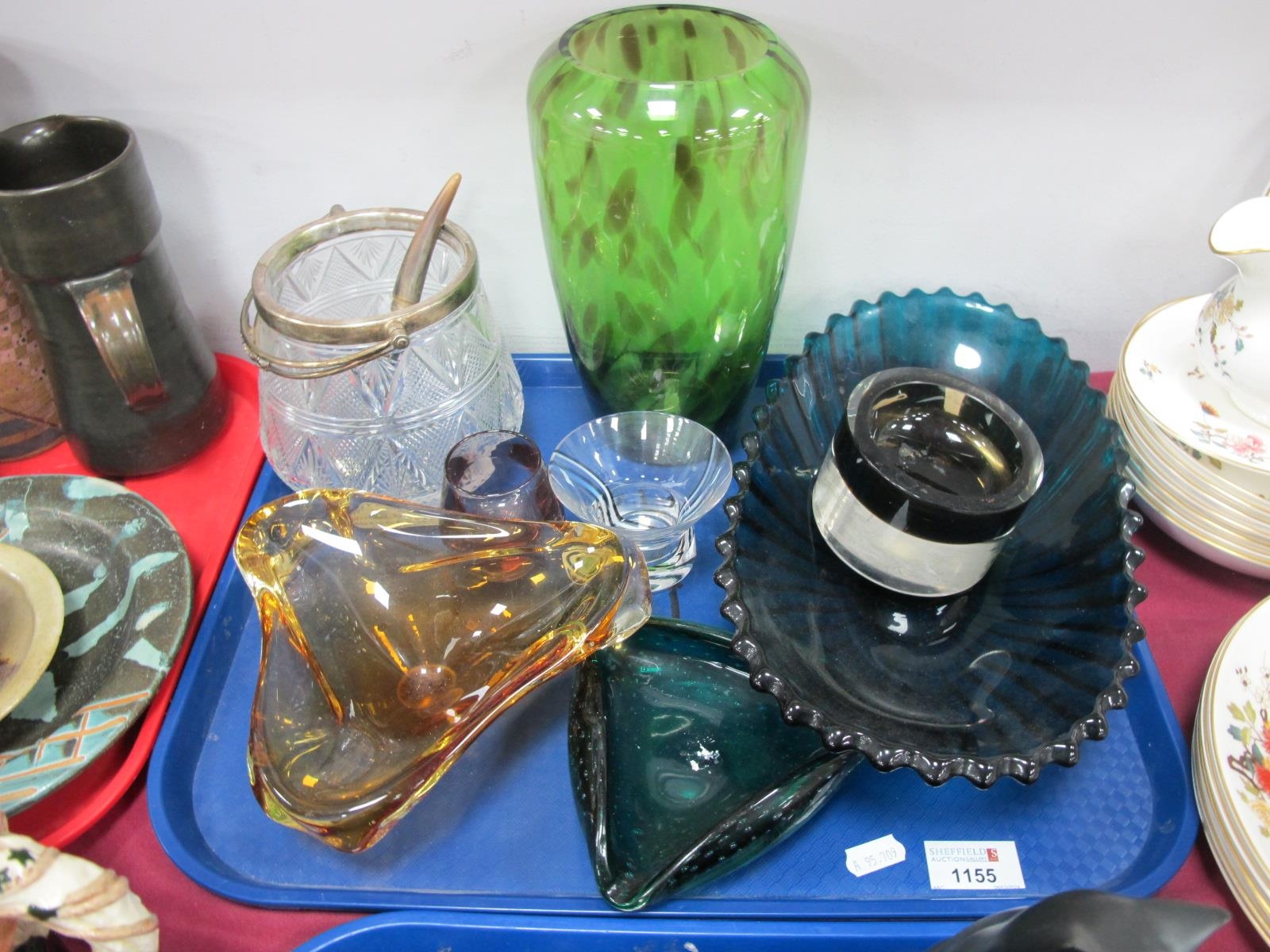 Mid XX Century Czech Triform Glass Ashtray, green streaked glass vase, 23cm high, oval blue dish, etc:- One Tray.