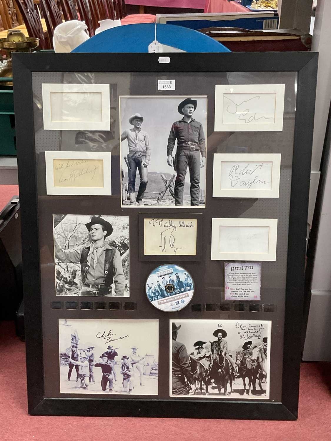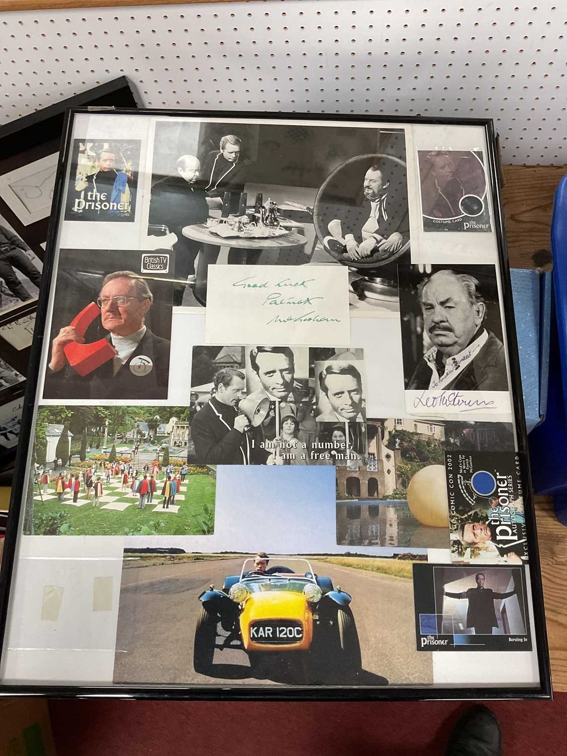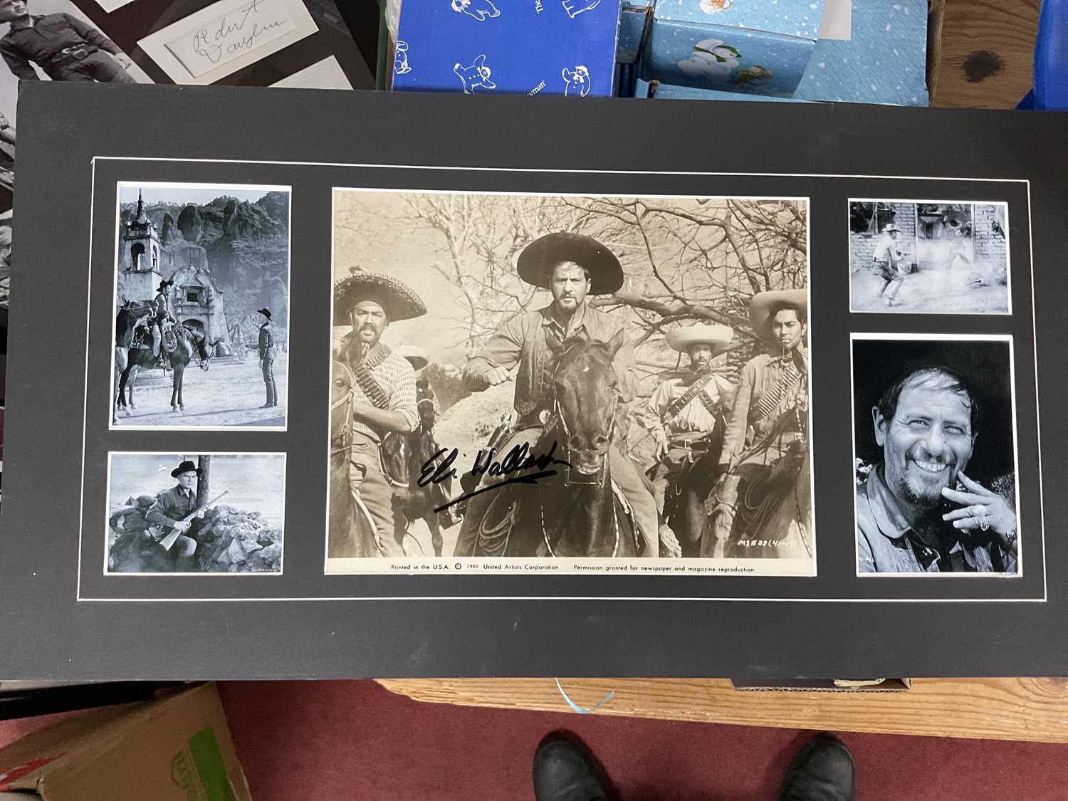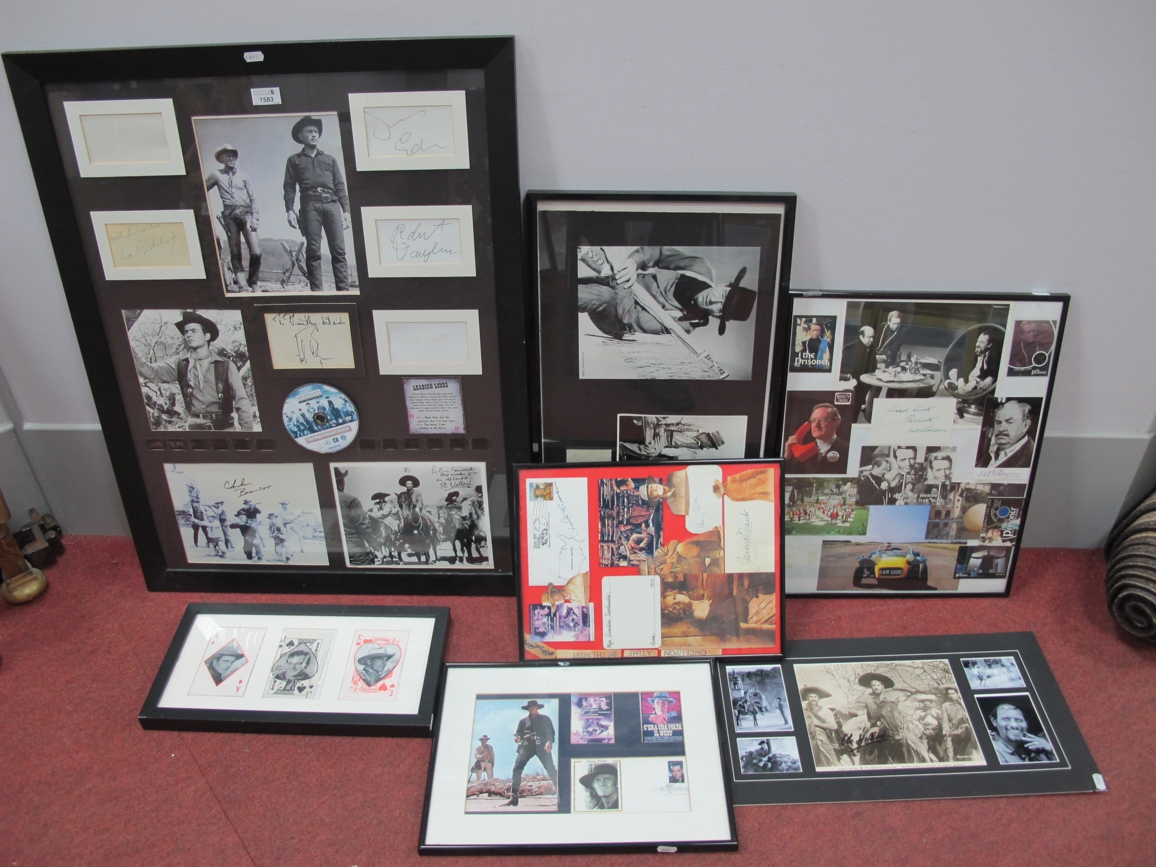 A Collection of Memorabilia: including six Western-themed framed photos with autographs, examples of “The Magnificent Seven (1960)” photos, autographs, film negatives, DVD etc (67x87cm), “Reel 1 Stars” signed by Eli Wallach with COA (55x29cm), “The Searchers (1956)” John Wayne photos and signature (66x37cm) etc, together with a custom-framed collage “The Prisoner” with autographs. Autographs unverified:- One box.