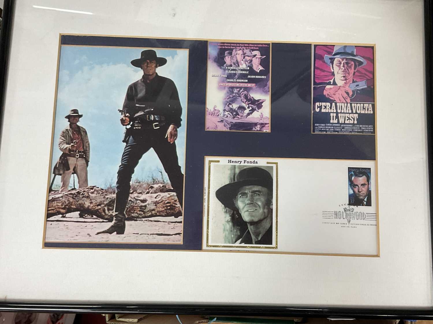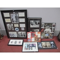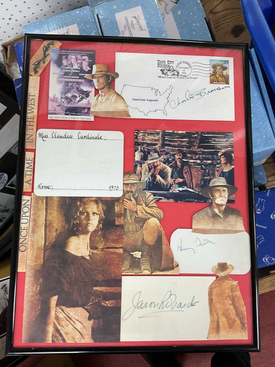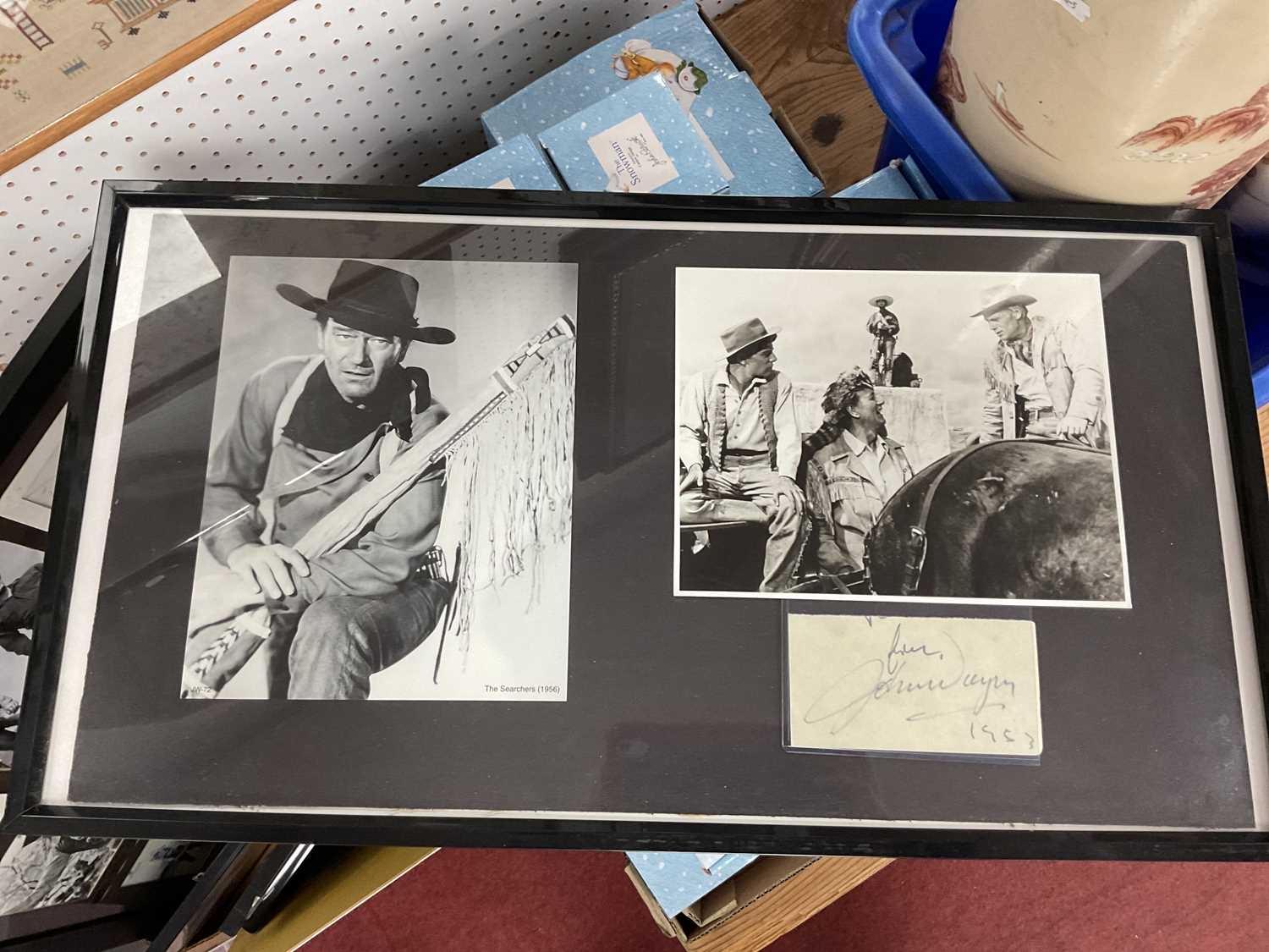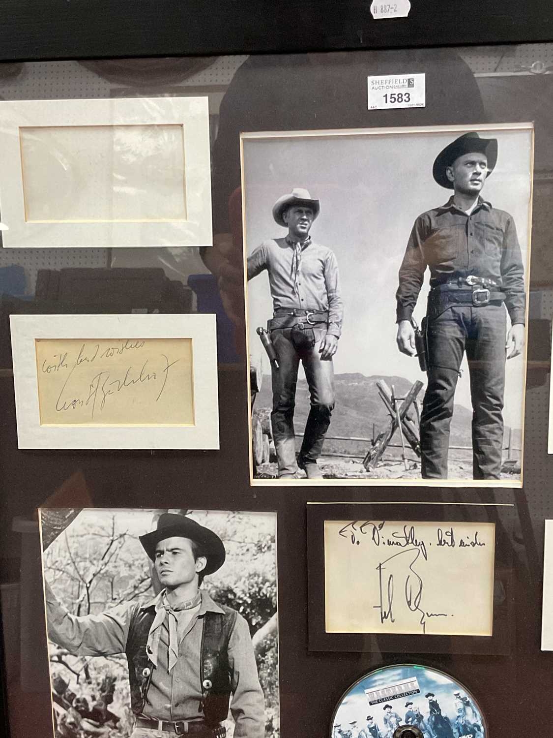 A Collection of Memorabilia: including six Western-themed framed photos with autographs, examples of “The Magnificent Seven (1960)” photos, autographs, film negatives, DVD etc (67x87cm), “Reel 1 Stars” signed by Eli Wallach with COA (55x29cm), “The Searchers (1956)” John Wayne photos and signature (66x37cm) etc, together with a custom-framed collage “The Prisoner” with autographs. Autographs unverified:- One box.