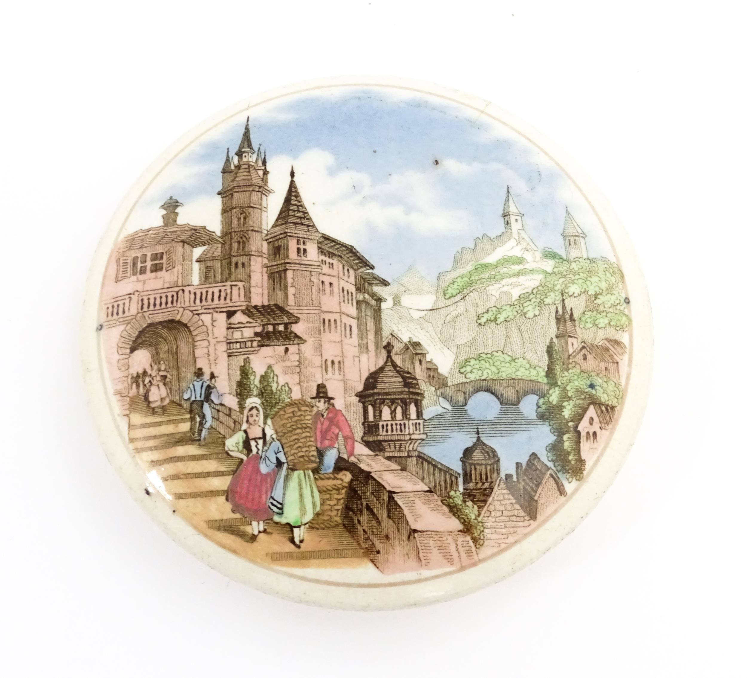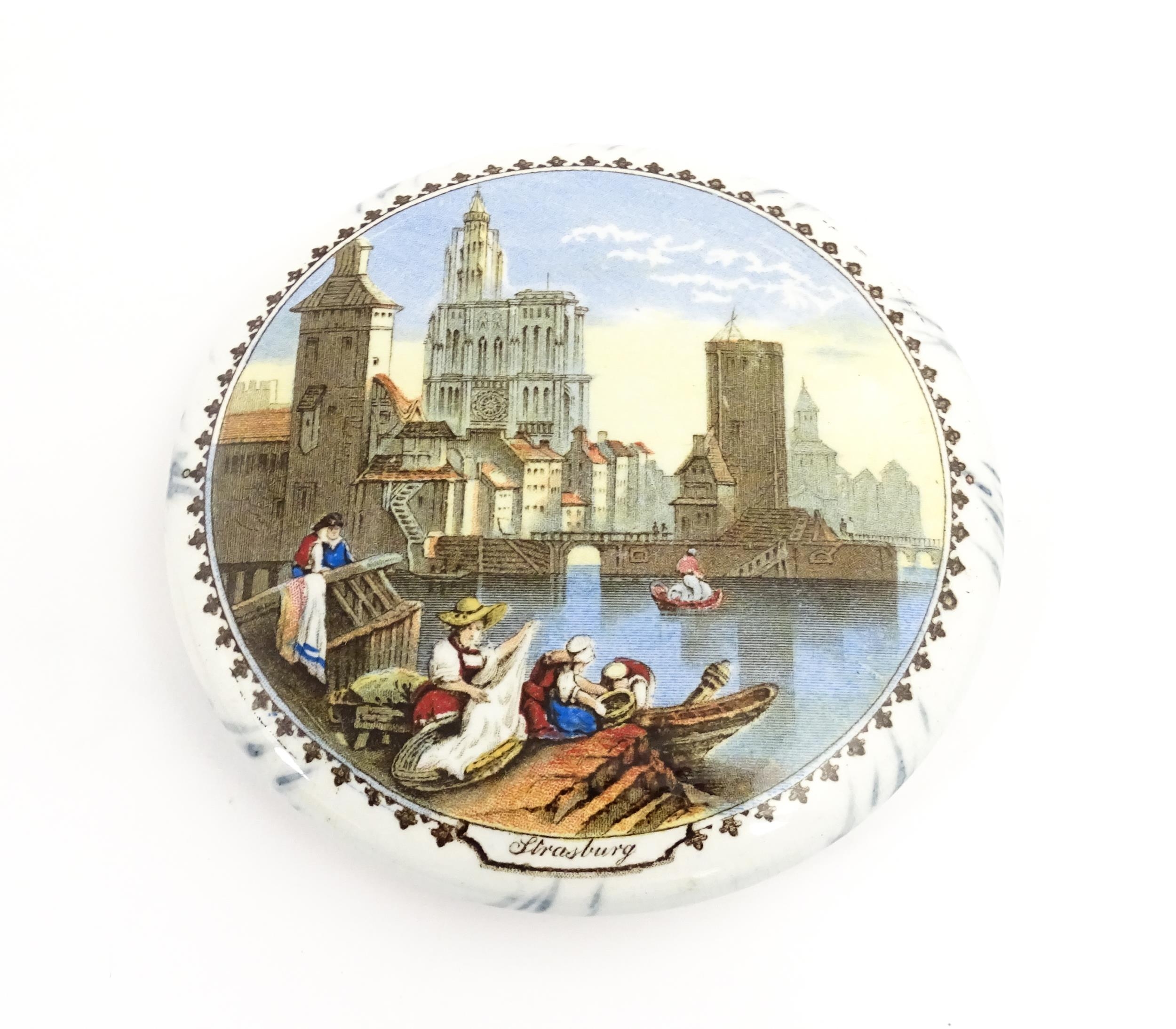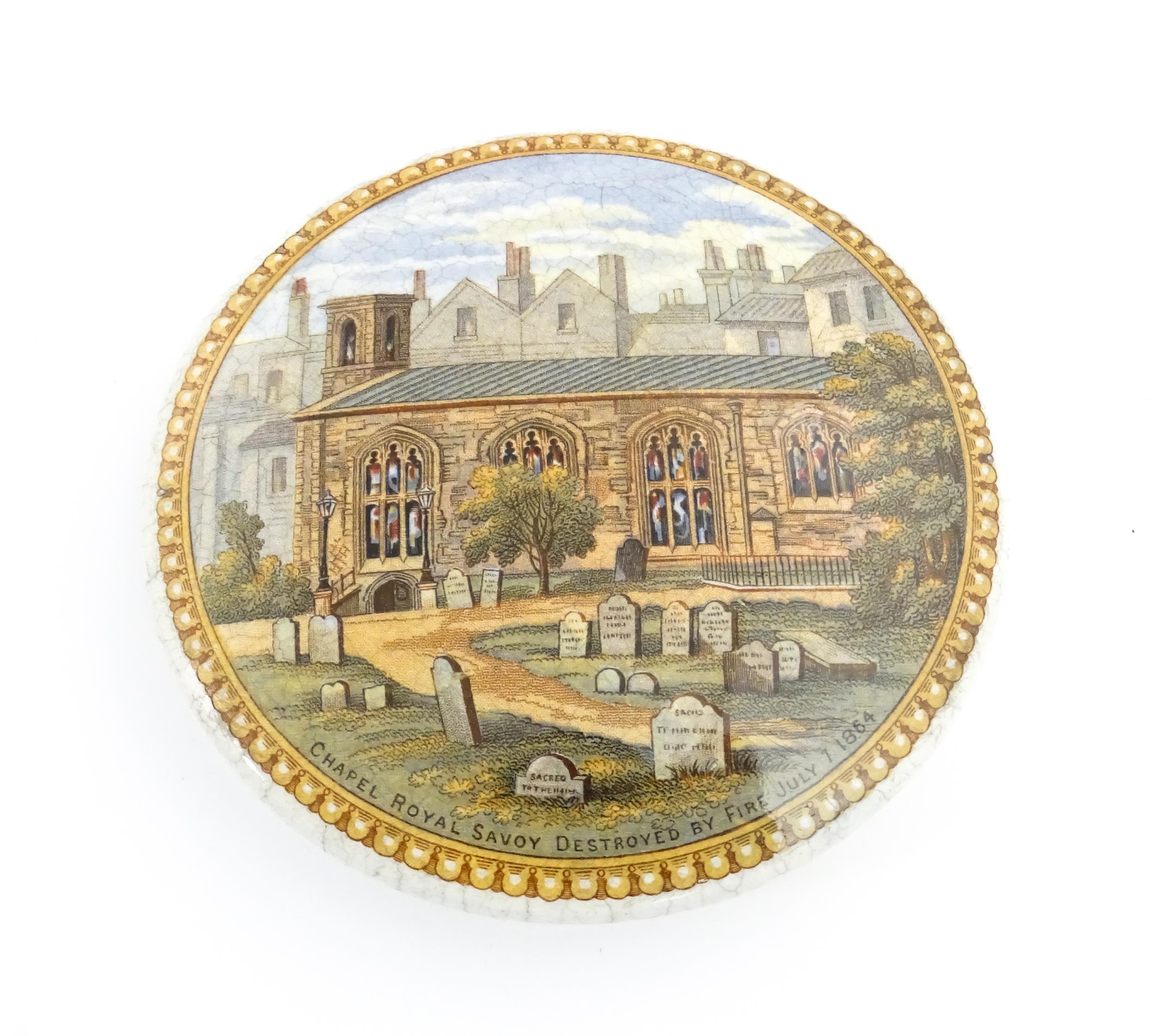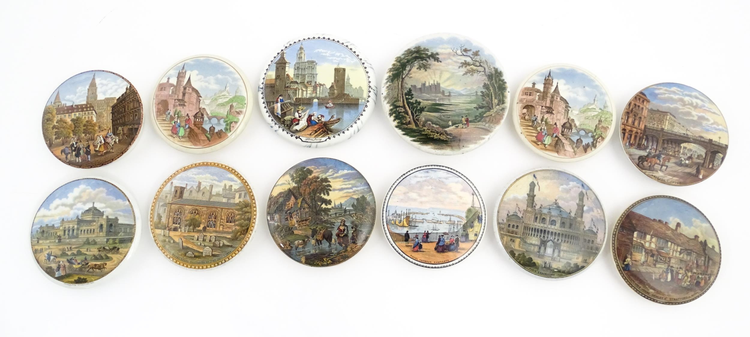 A quantity of Prattware pot lids to include Strasburg, Holborn Viaduct, Philadelphia Exhibition 1876, Royal Harbour Ramsgate, Chapel Royal Savoy Destroyed by Fire July 1864, Paris Exhibition 1878, Shakespeare's House Henley Street Stratford on Avon, etc. Largest approx. 5" (12)