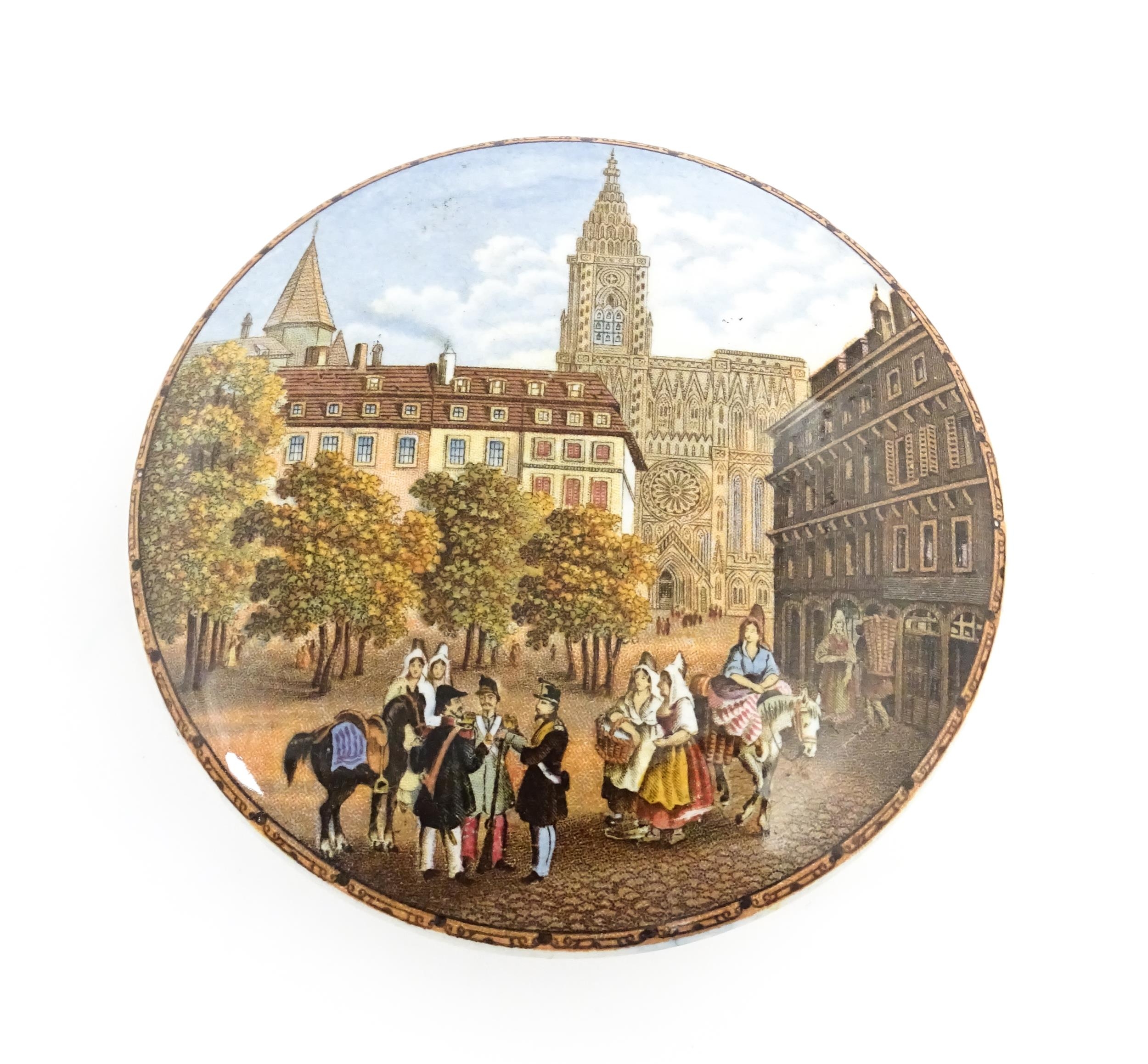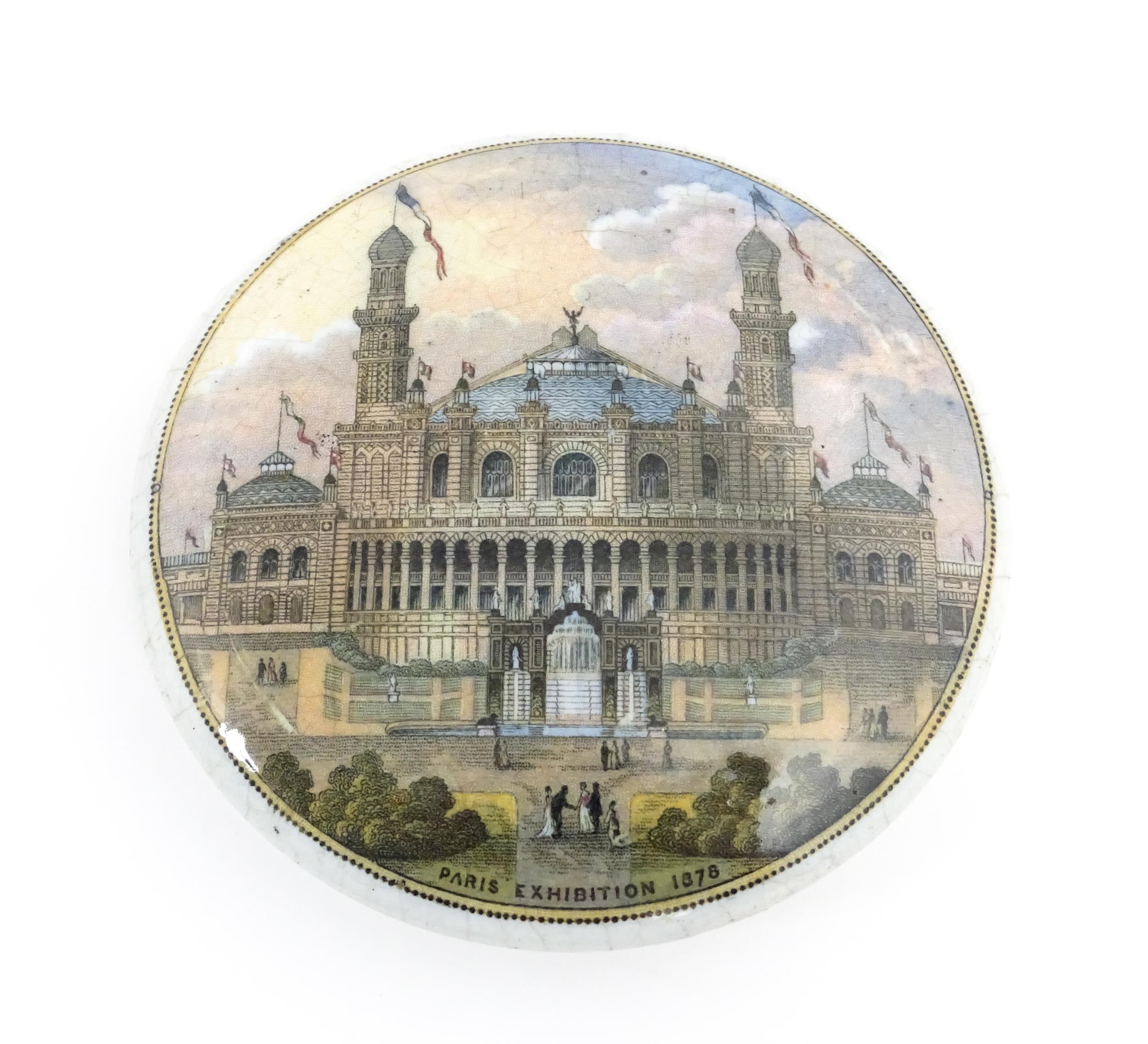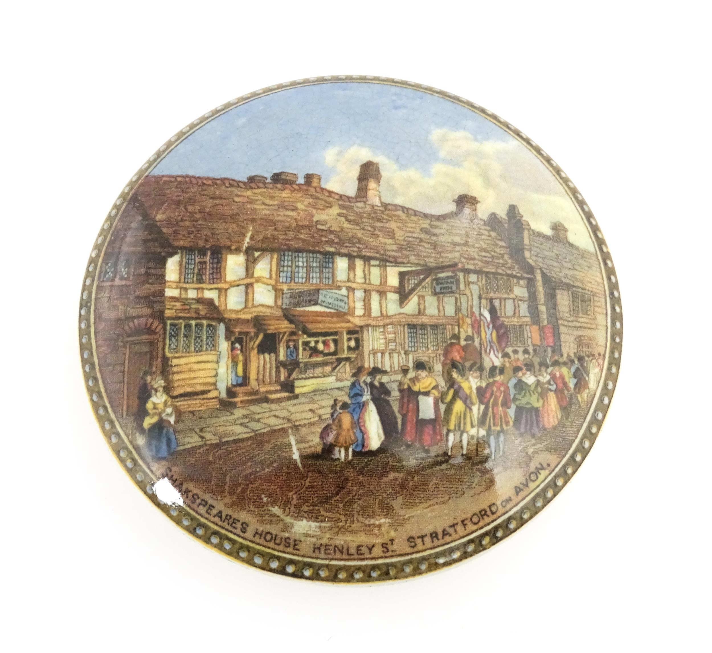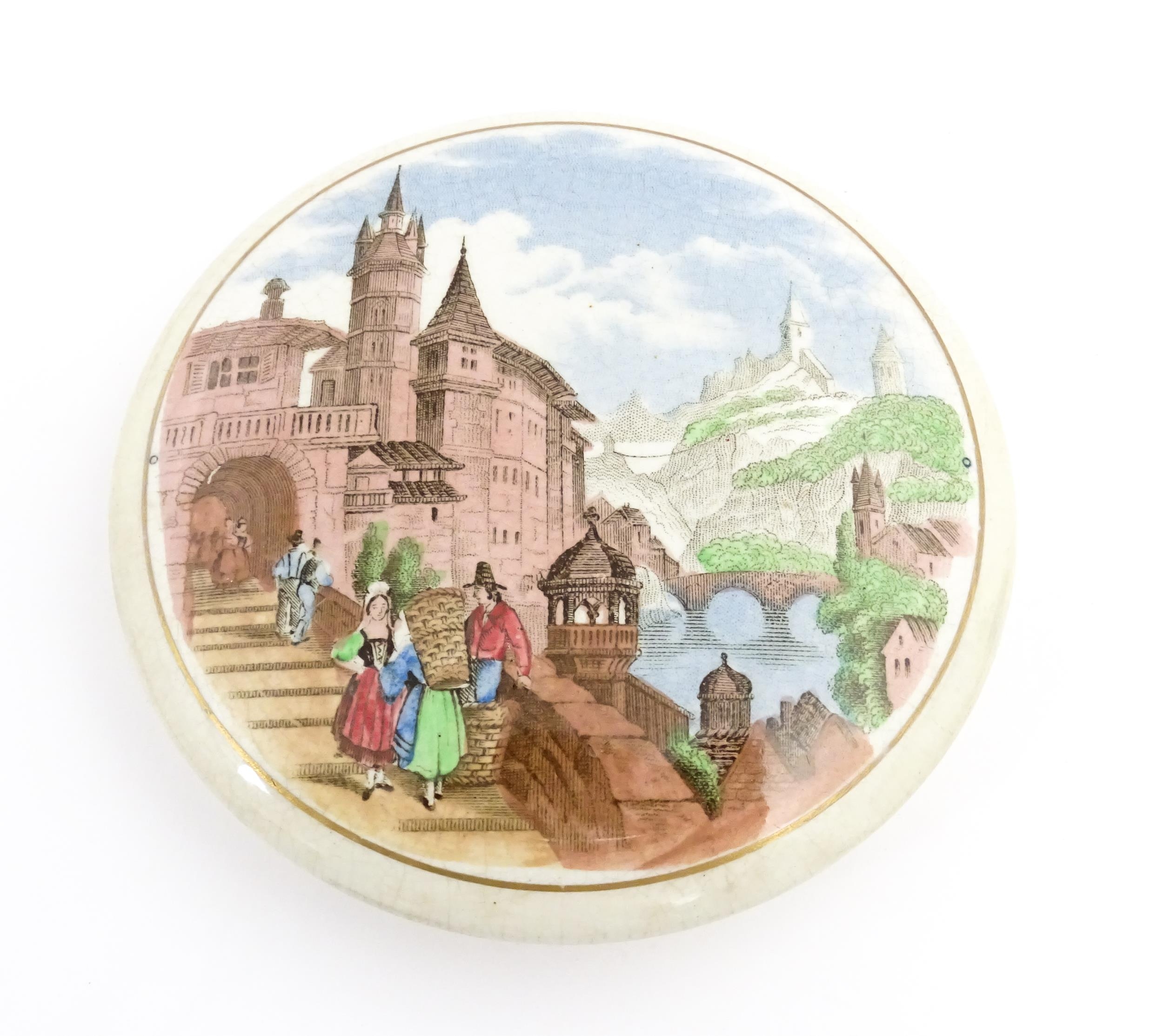 A quantity of Prattware pot lids to include Strasburg, Holborn Viaduct, Philadelphia Exhibition 1876, Royal Harbour Ramsgate, Chapel Royal Savoy Destroyed by Fire July 1864, Paris Exhibition 1878, Shakespeare's House Henley Street Stratford on Avon, etc. Largest approx. 5" (12)