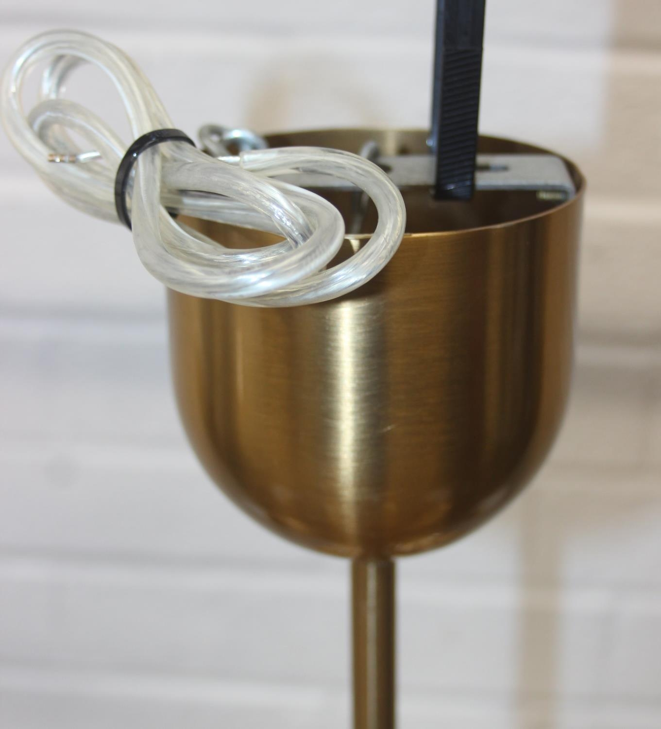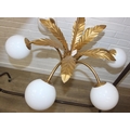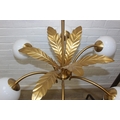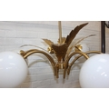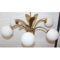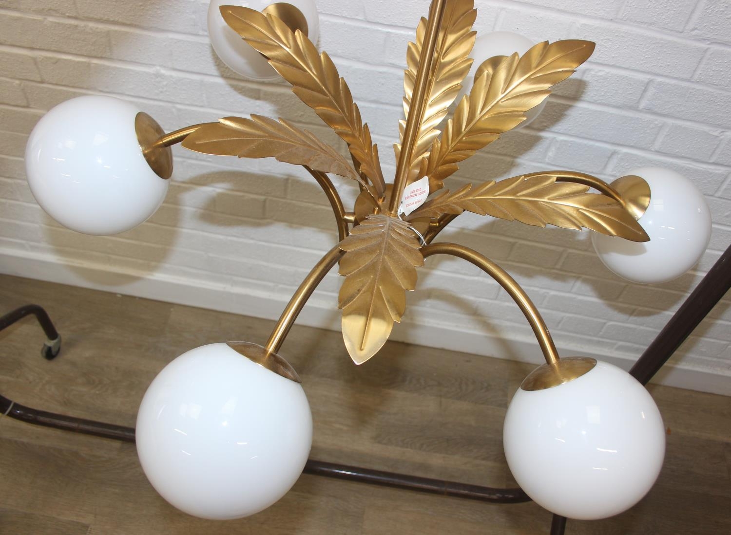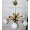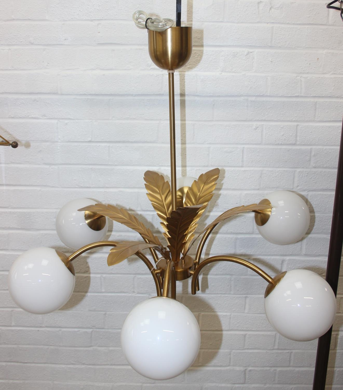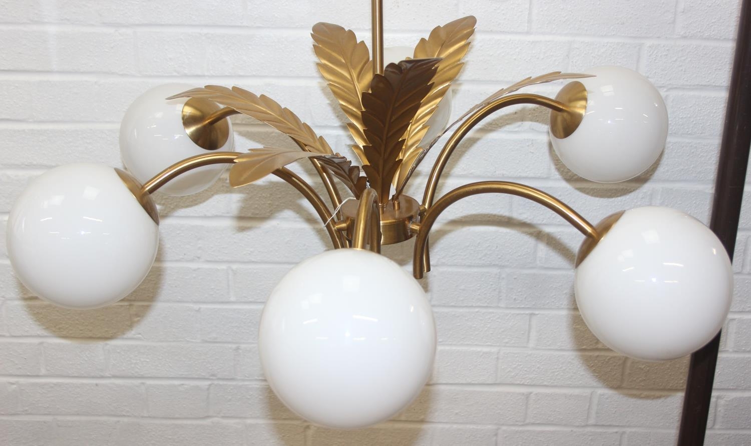 Six branch ceiling light manufactured by Anthropologie in the Hollywood Regency style, brushed brass effect with fern detail and white glass globes, 65cm wide x 65cm tall