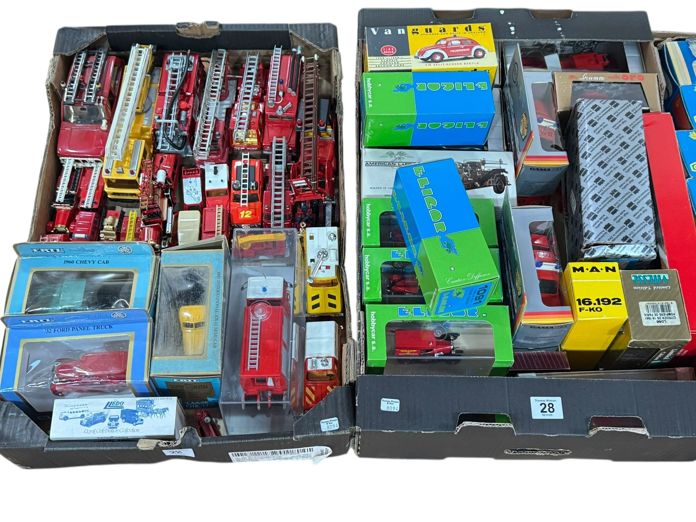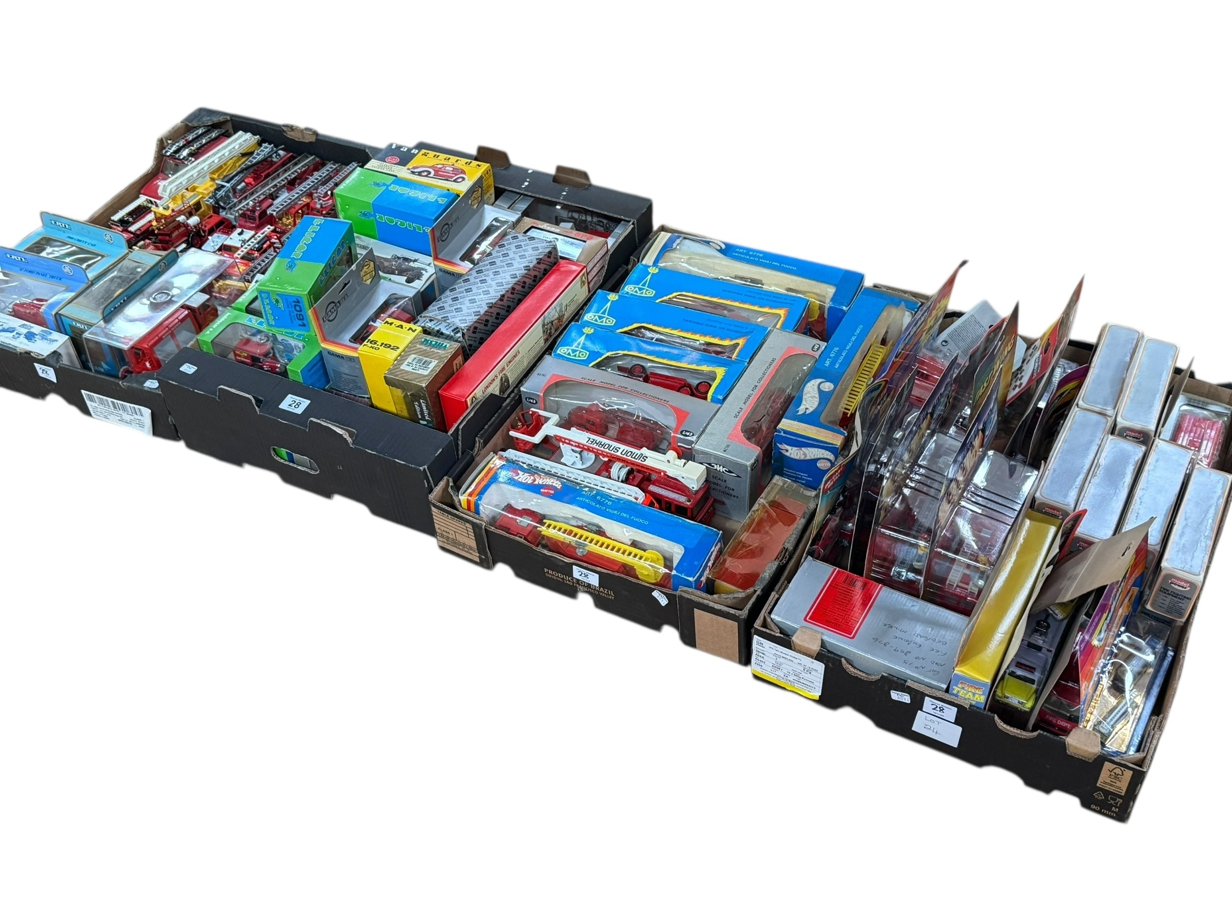 Four boxes of die-cast and model fire engines, etc.