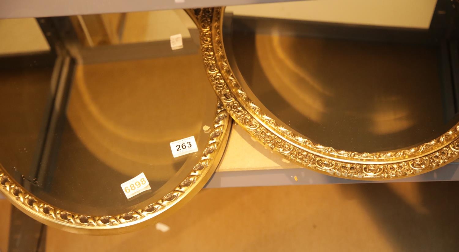 Two oval wall mirrors with bevelled glass and gold frames. This lot is not available for in-house P&P.