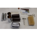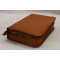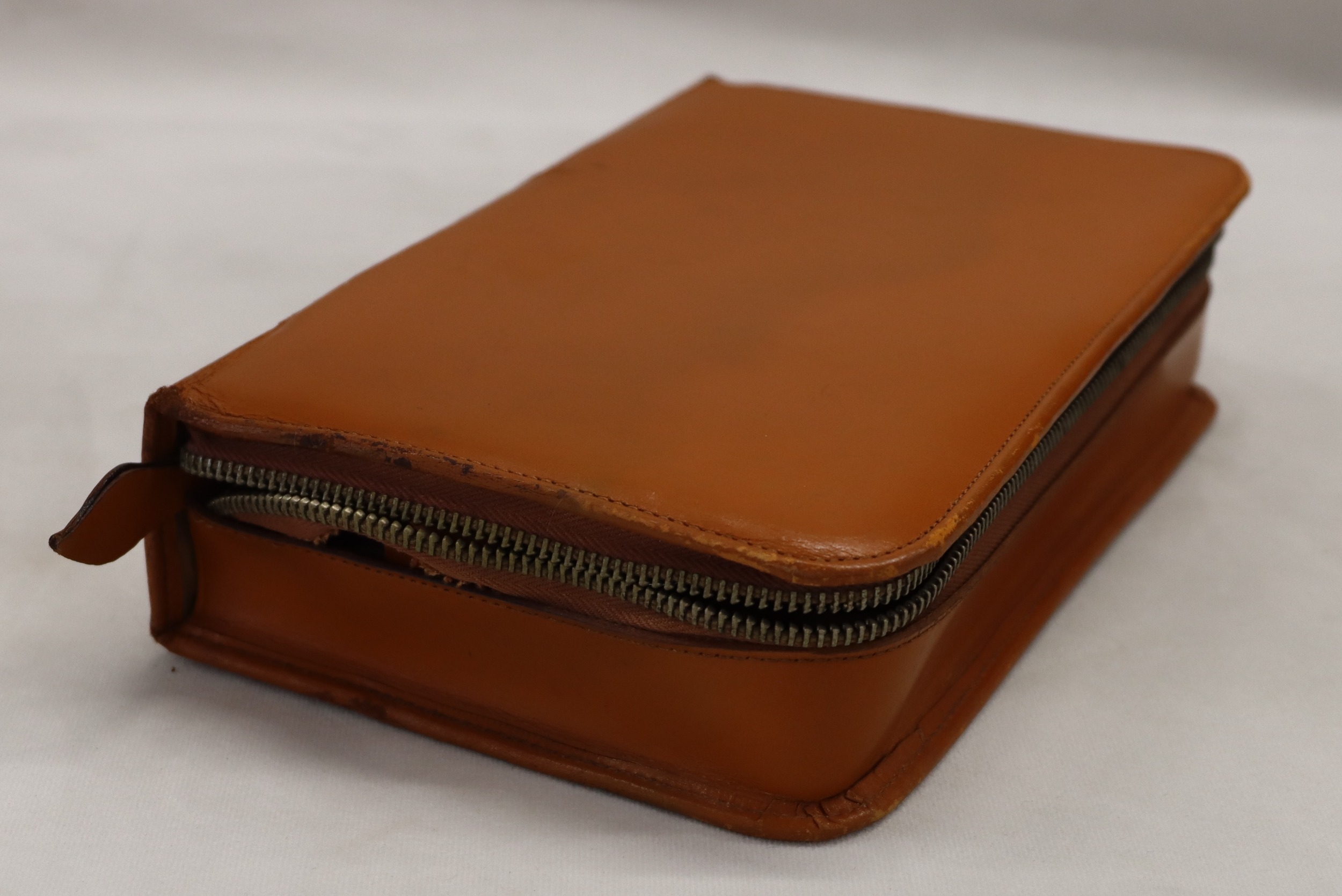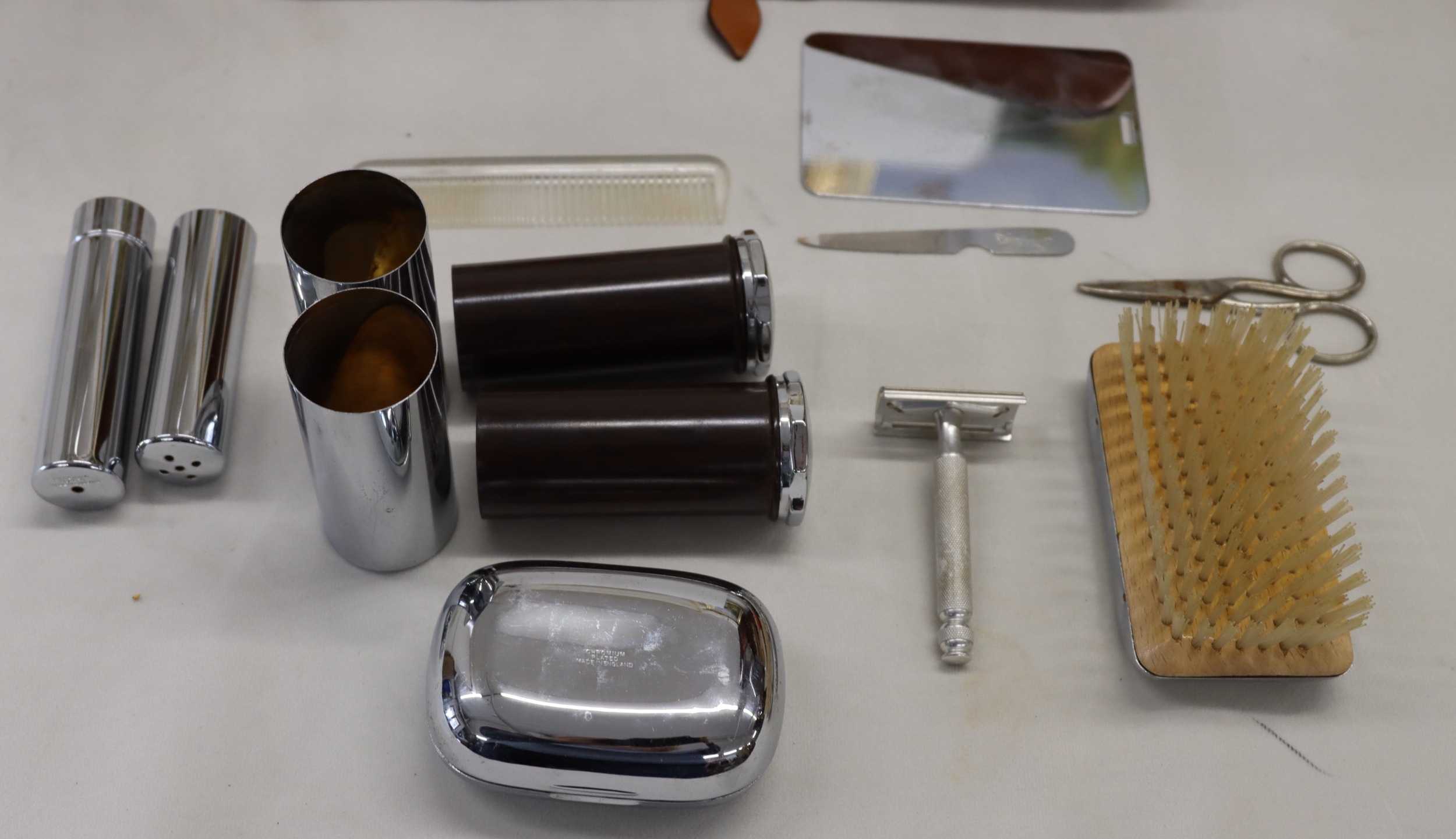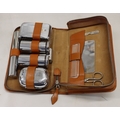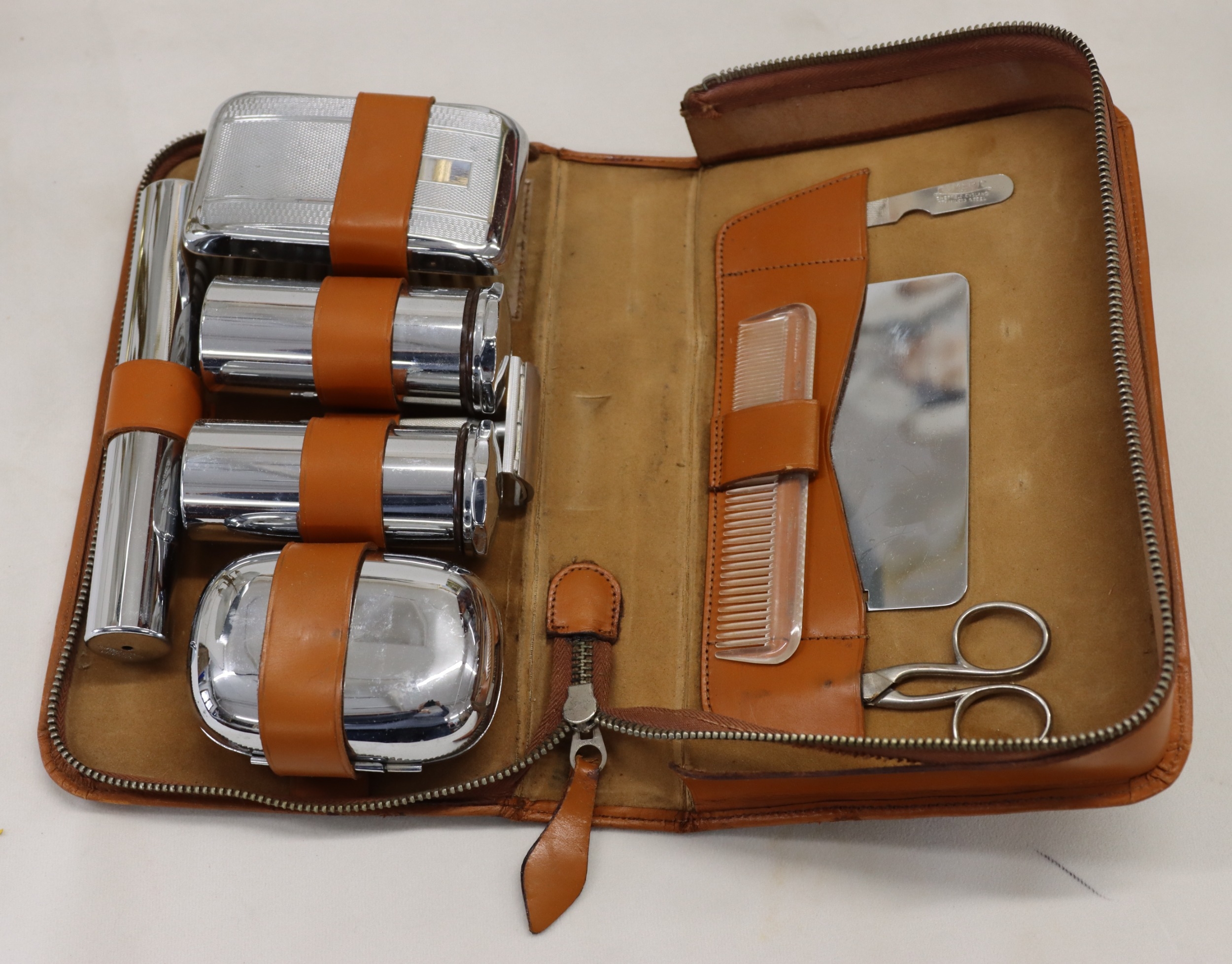 A 3-light lamp, 55.5cm high and a tan leather gentleman's travel vanity case with chromium plated containers (stitching to zip loose).