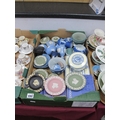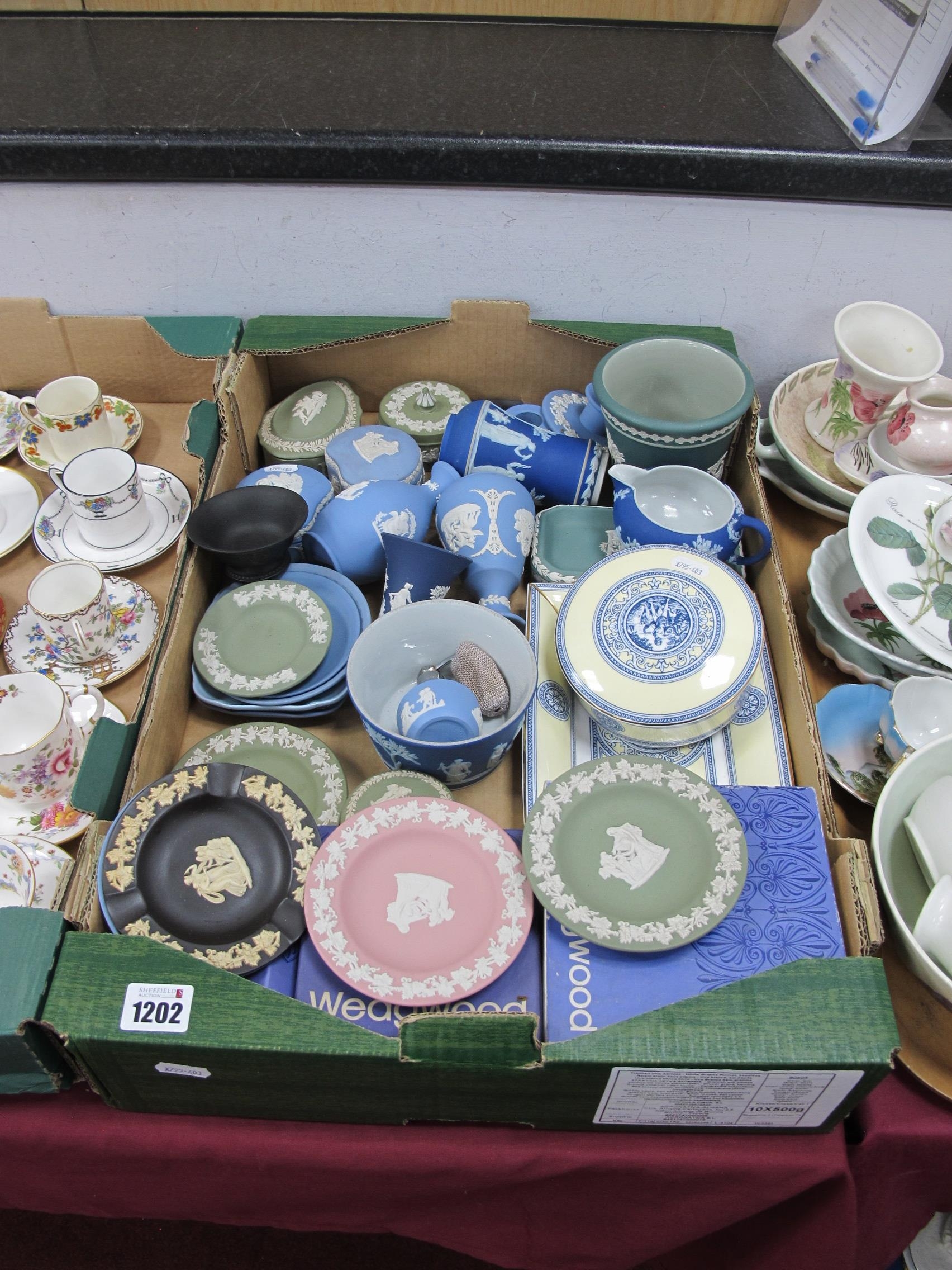 Wedgwood Jasperware, items to include vases, pin dishes, plates, lidded trinket boxes, in varying colours green, blue, black, pink, etc, with two pieces of Wedgwood inspired by a Robert Adam design for decorating a state room:- One Box.