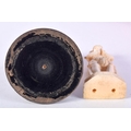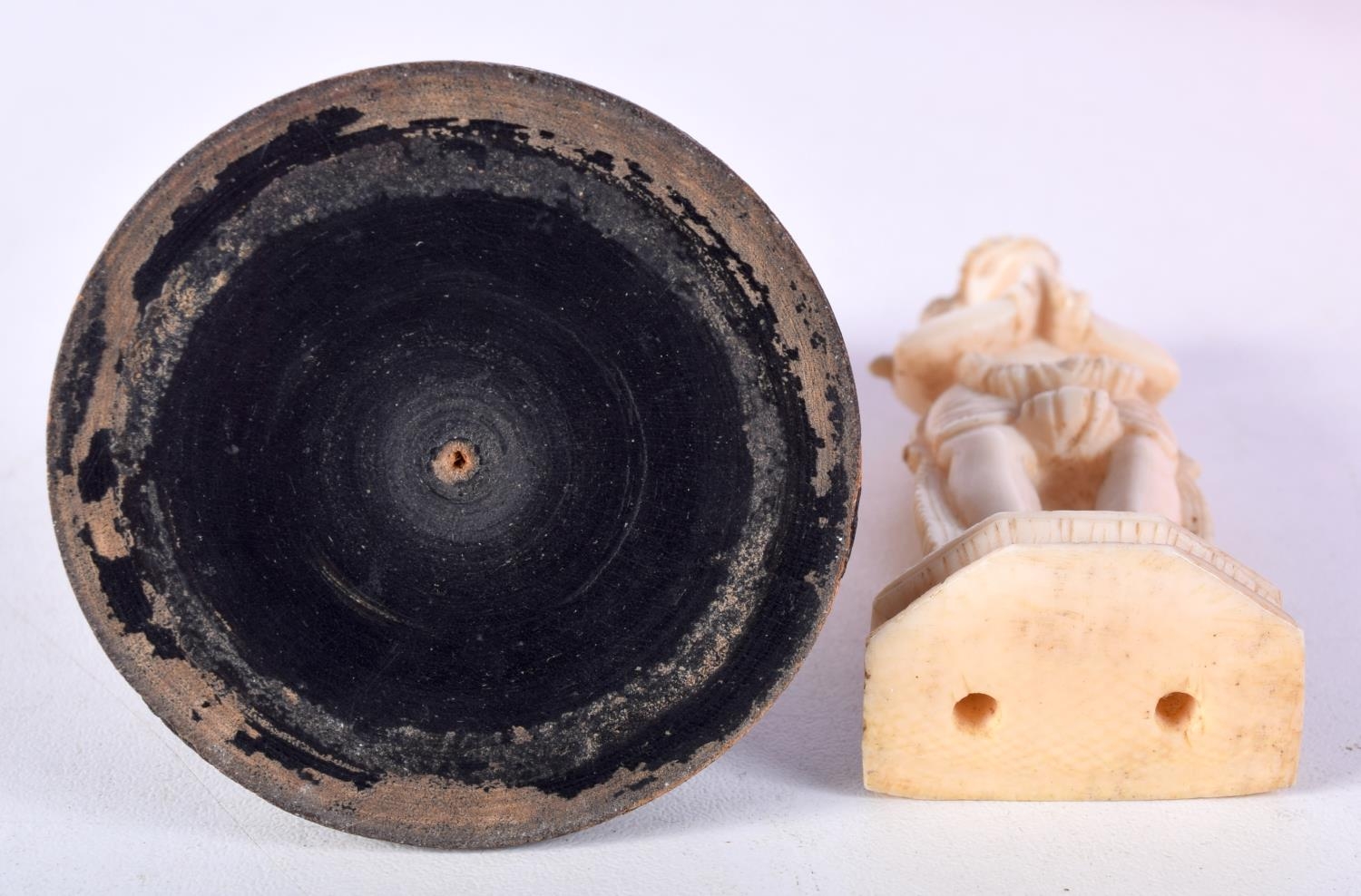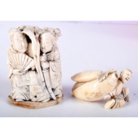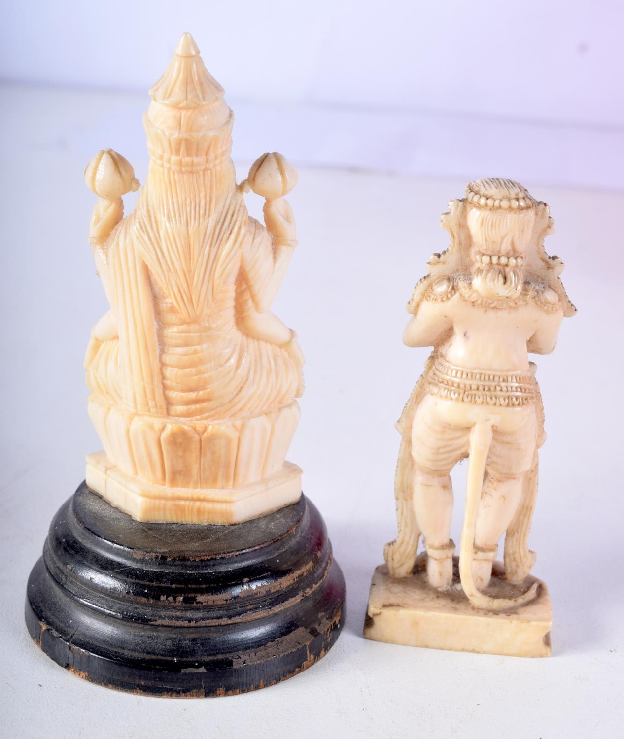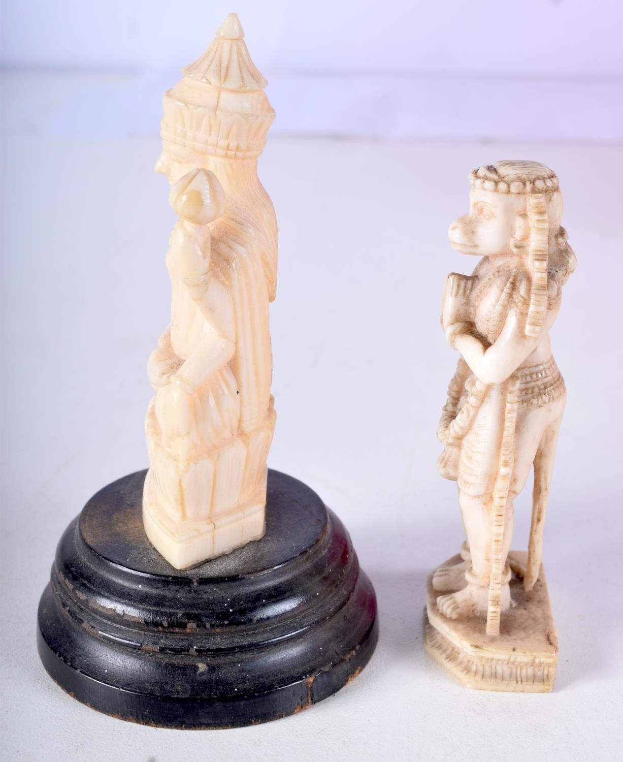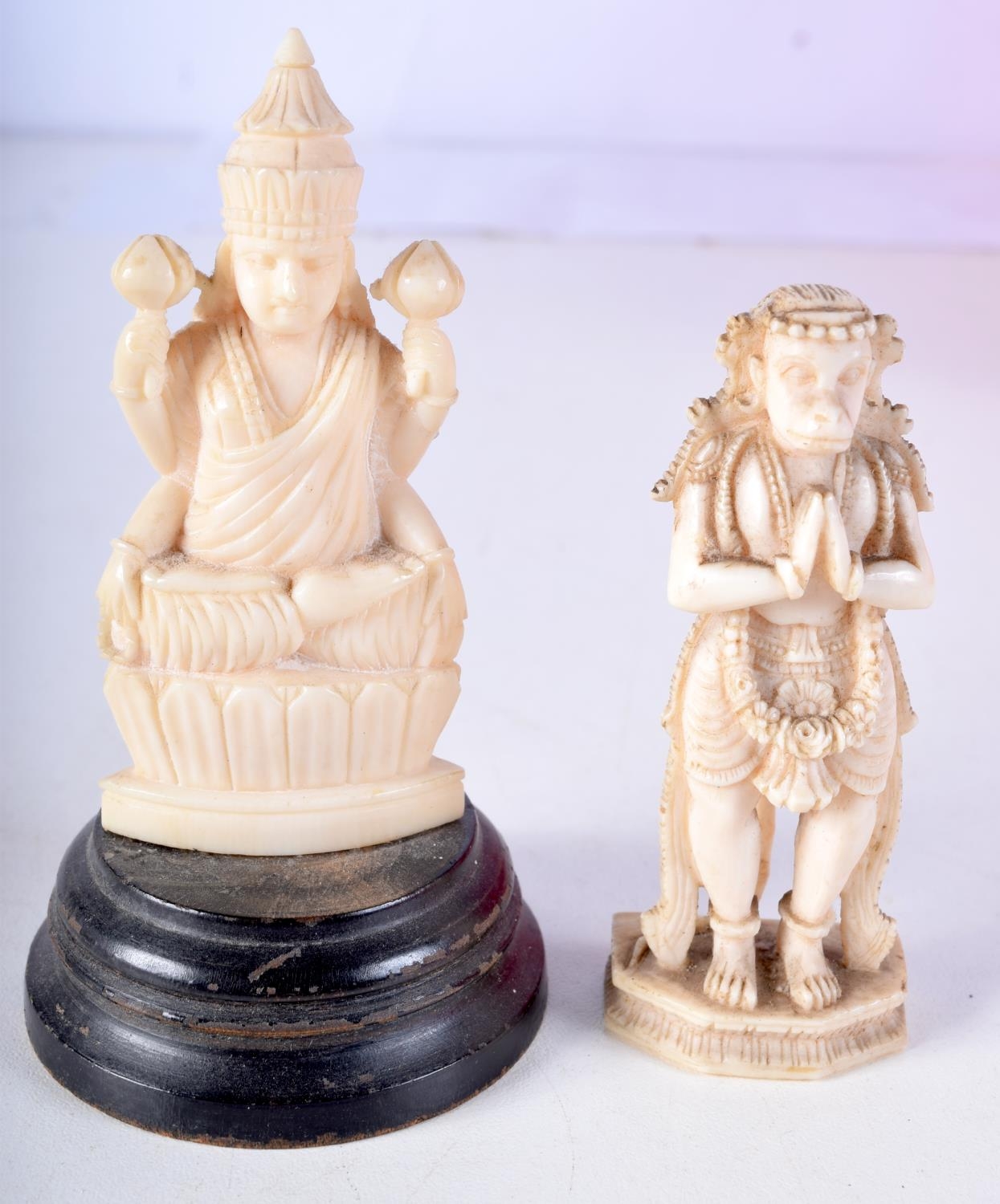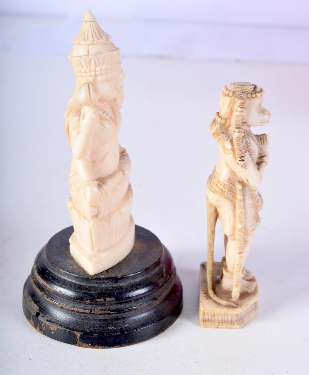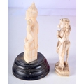 TWO 19TH CENTURY ANGLO INDIAN CARVED IVORY FIGURES each modelled in a buddhistic stance. Largest 11 cm high. (2)