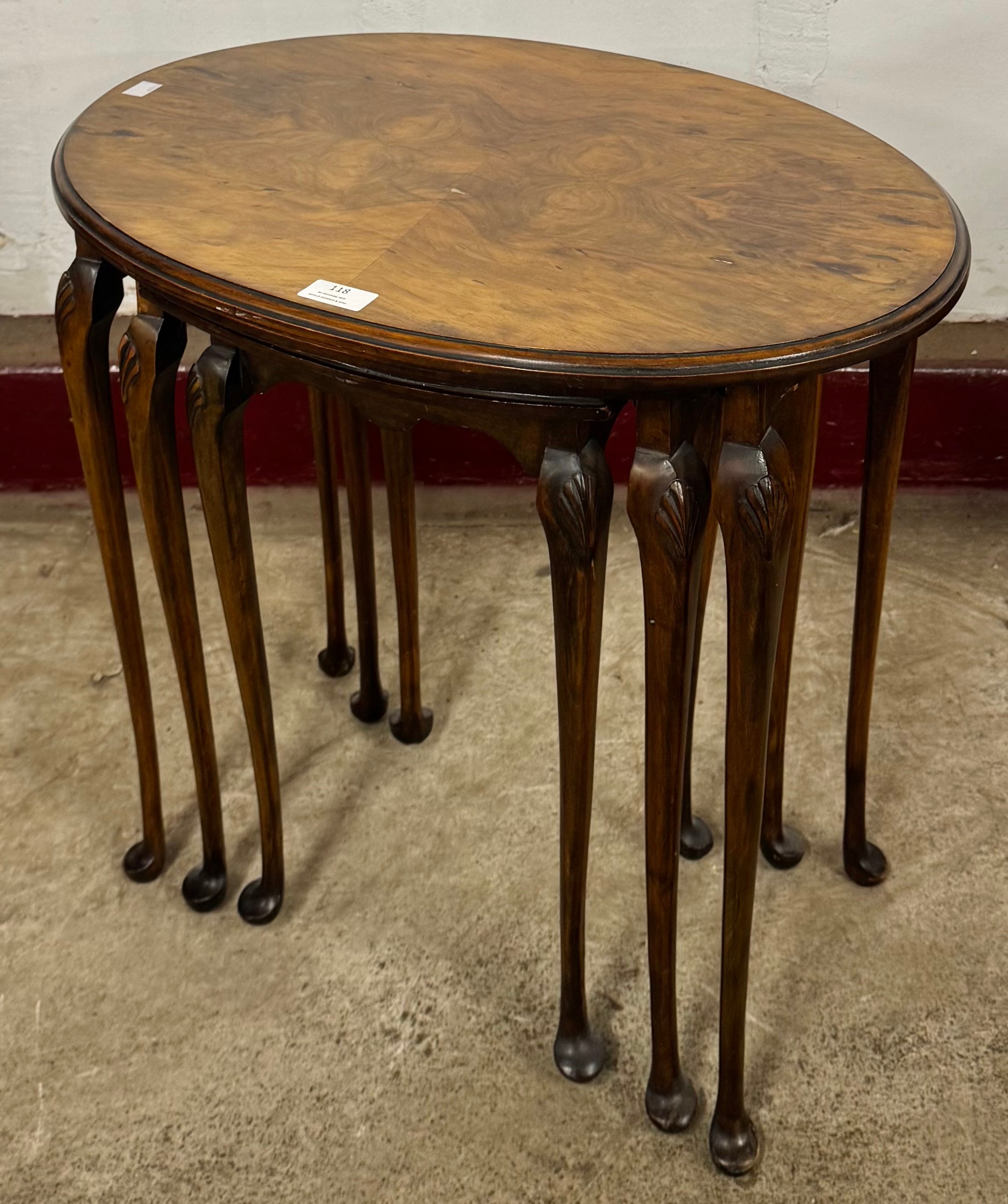 A Queen Anne style burr walnut oval nest of tables