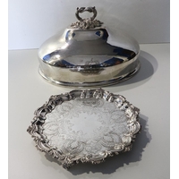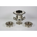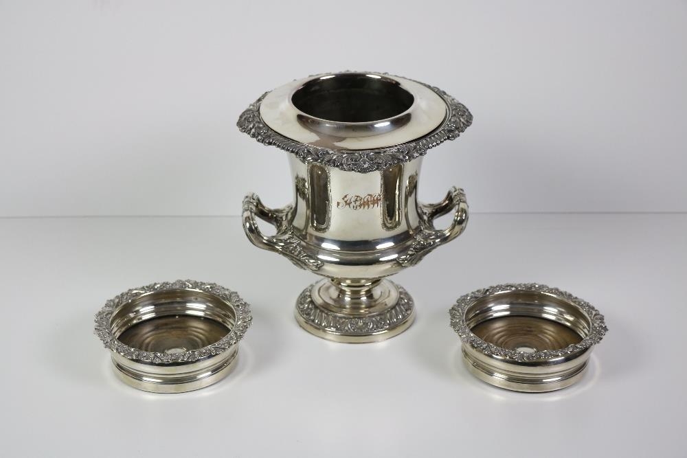 A good mid-19th Century heavy two handled Wine Cooler, with embossed gadroon and shell decoration, silver plated on copper, crested, approx. 27cms (10 1/2") high; and a pair of large silver plated Coasters. (3)