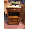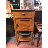 A French oak bedside cabinet, with marble inset top over drawer, open shelf and drawer -