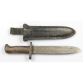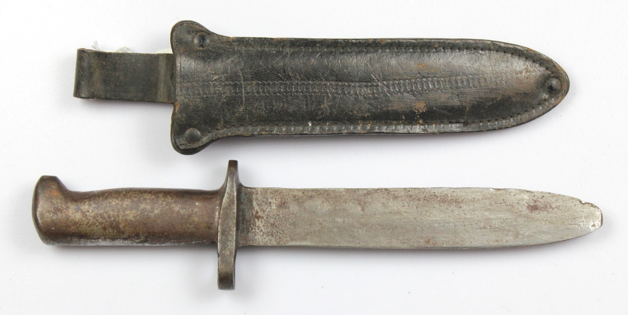 Bayonet: An exceptionally rare Remington Model no 13 bayonet for the Model 1913 Boy's Rifle, formally called the "Boy Scout Rifle." Only 1000 were manufactured (see R.D.C. Evans, page 225 & Janzens Notebook, page 238). Blade, 7", rounded at tip (to prevent boys from wounding each other when fencing). In its original stout leather scabbard with belt loop, in very good condition. The bayonet with light rust patina. Pommel spigot appears broken off.