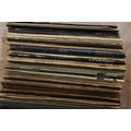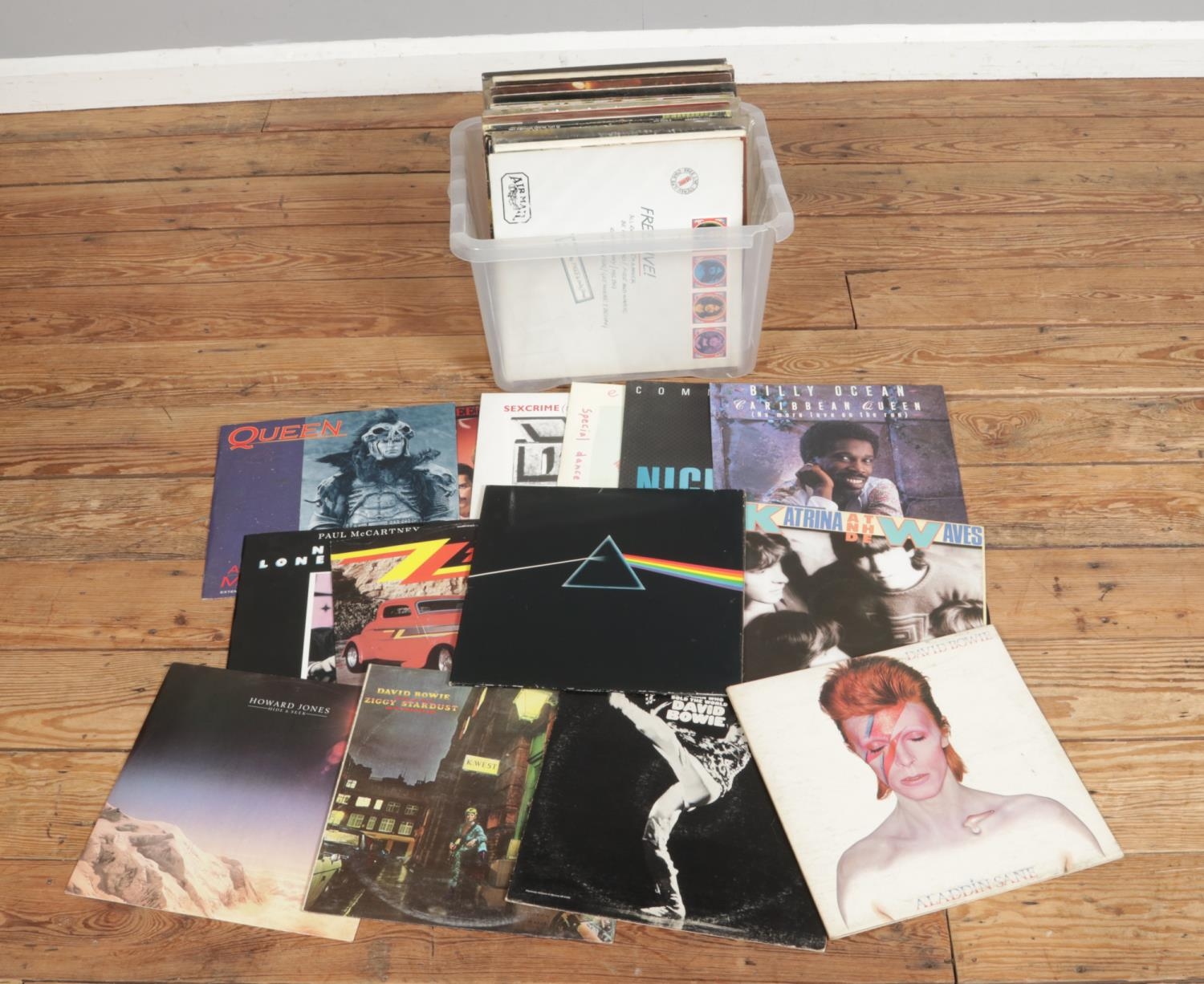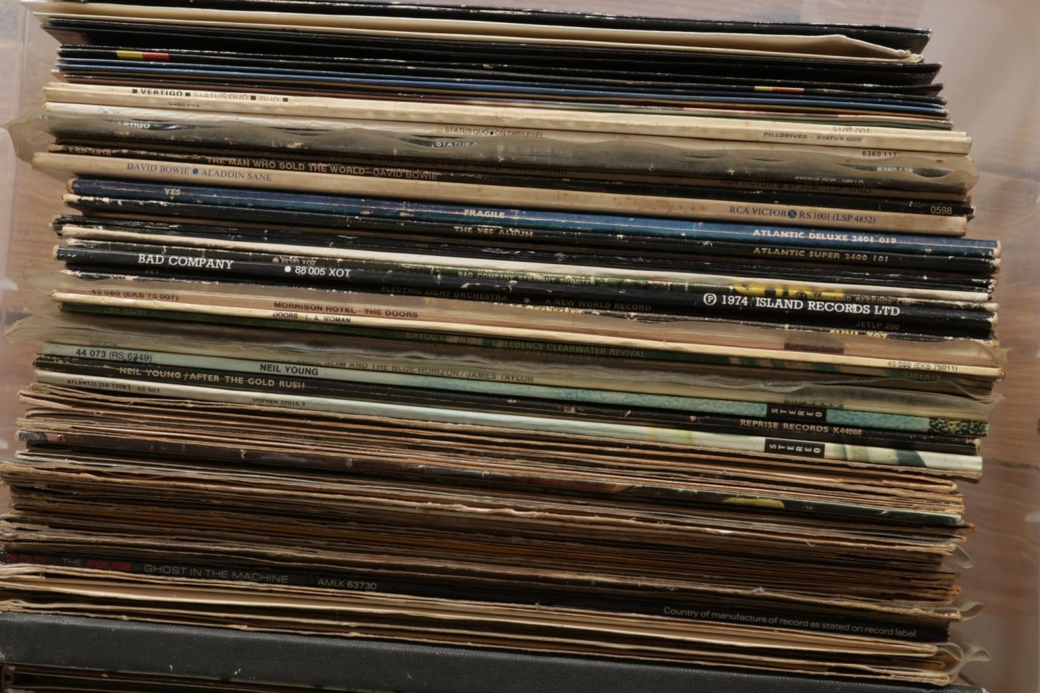 A box of records inlcuding Status Quo, David Bowie, Police, Clockwork Orange, Pink Floyd, George Harrison, The Who, The Doors, Jimi Hendrix, Moody Blues, Fleetwood Mac, Rod Stewart, ZZ tops etc