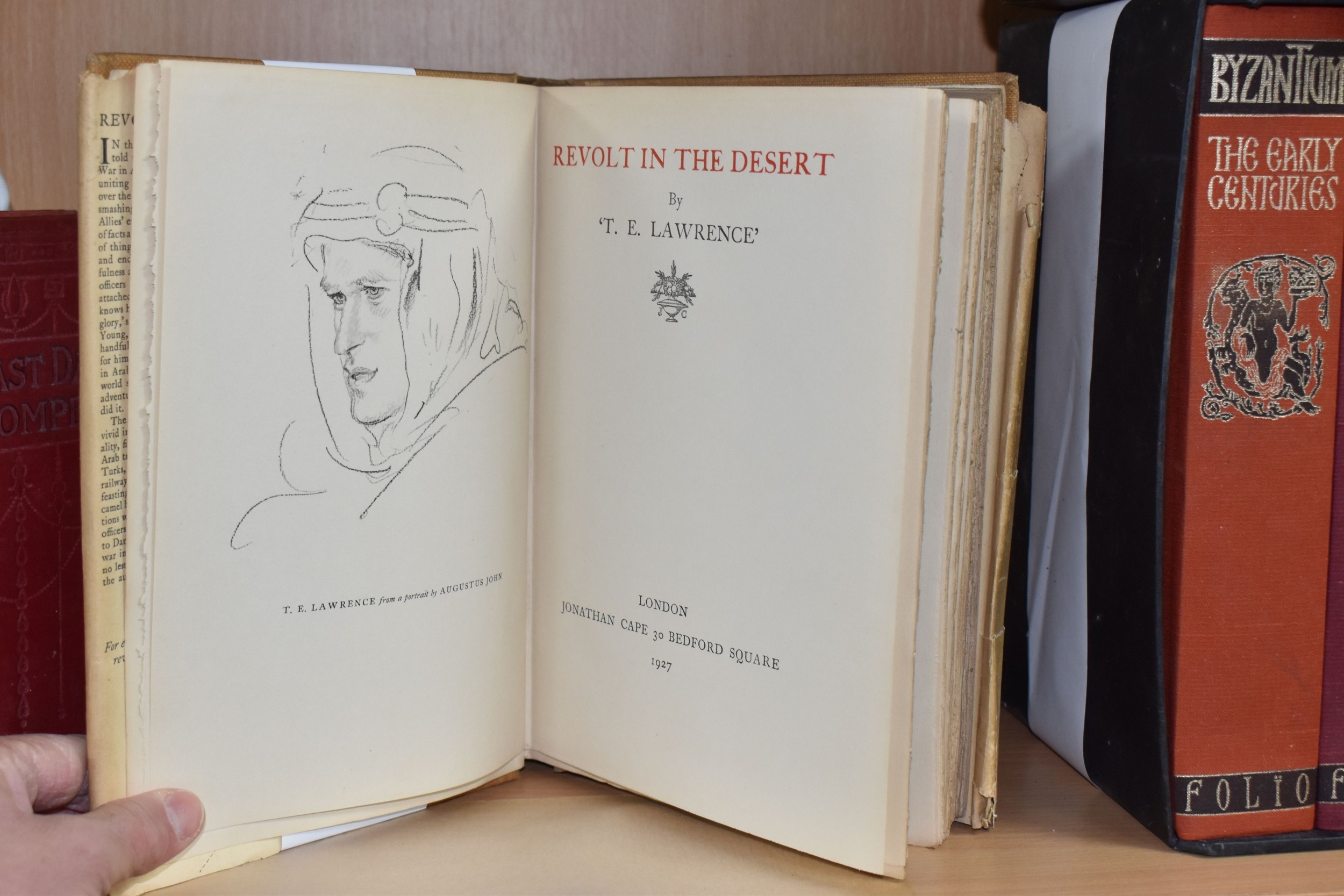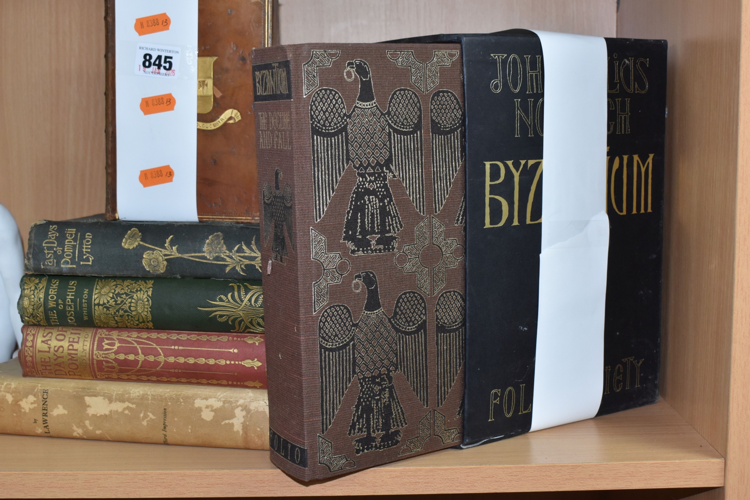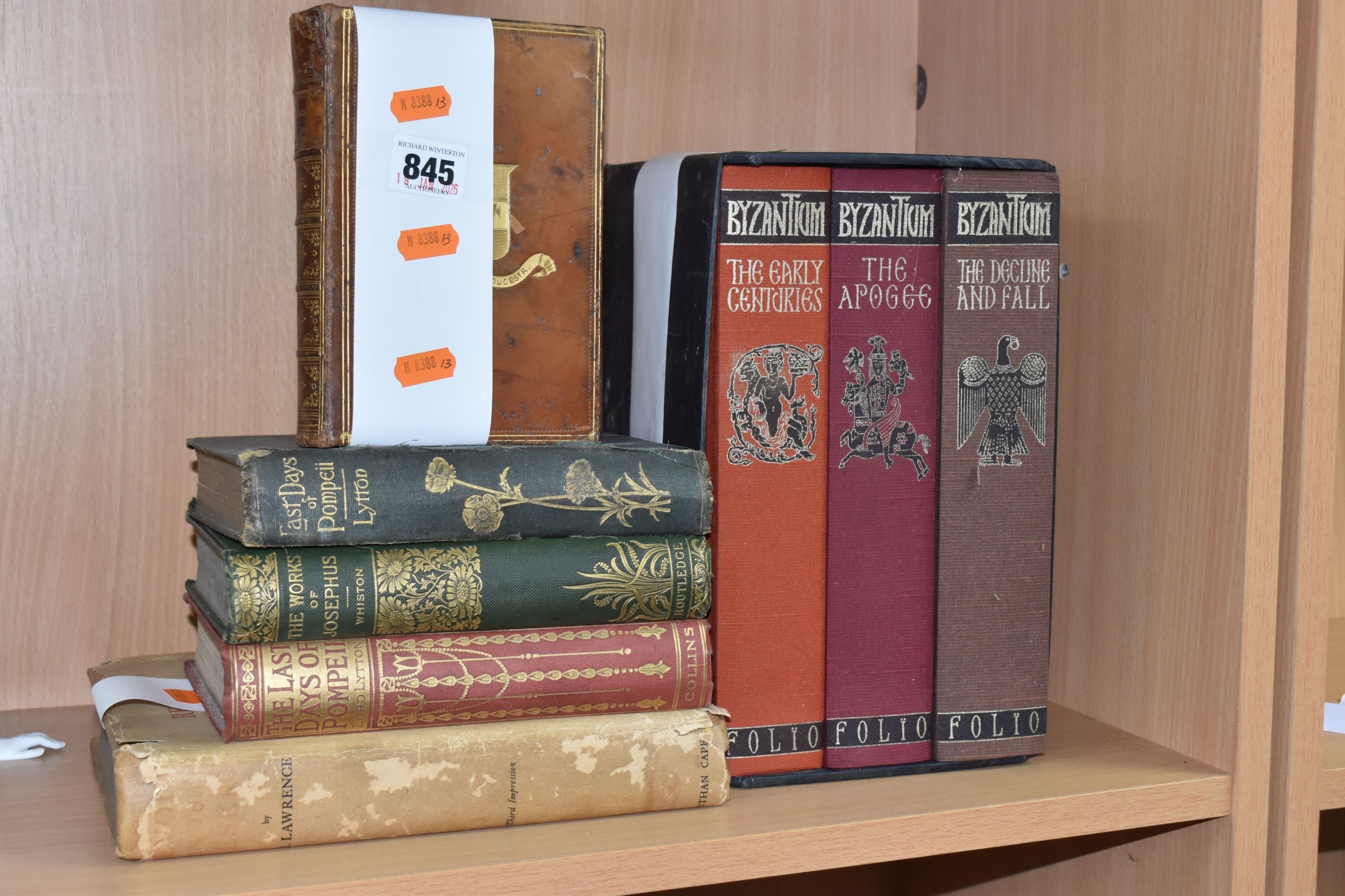 BOOKS, eight titles in hardback format comprising three FOLIO SOCIETY volumes of Byzantium; The Early Centuries, The Apogee and The Decline And Fall, Osborn: Rev. Henry S, The Holy Land Past And Present, Sketches OF Travel In Palestine, pub. Virtue And Co. 1808, Lytton: The Right Hon. Lord, The Last Days Of Pompeii, pub. The Walter Scott Publishing Co. 1884, Whiston; William, The Works Of Flavius Josephus, pub. George Routledge, Lytton; Lord, The Last Days Of Pompeii, pub. Collins' Clear-Type Press and Lawrence; T.E. Revolt In The Desert, pub. Jonathan Cape 1927