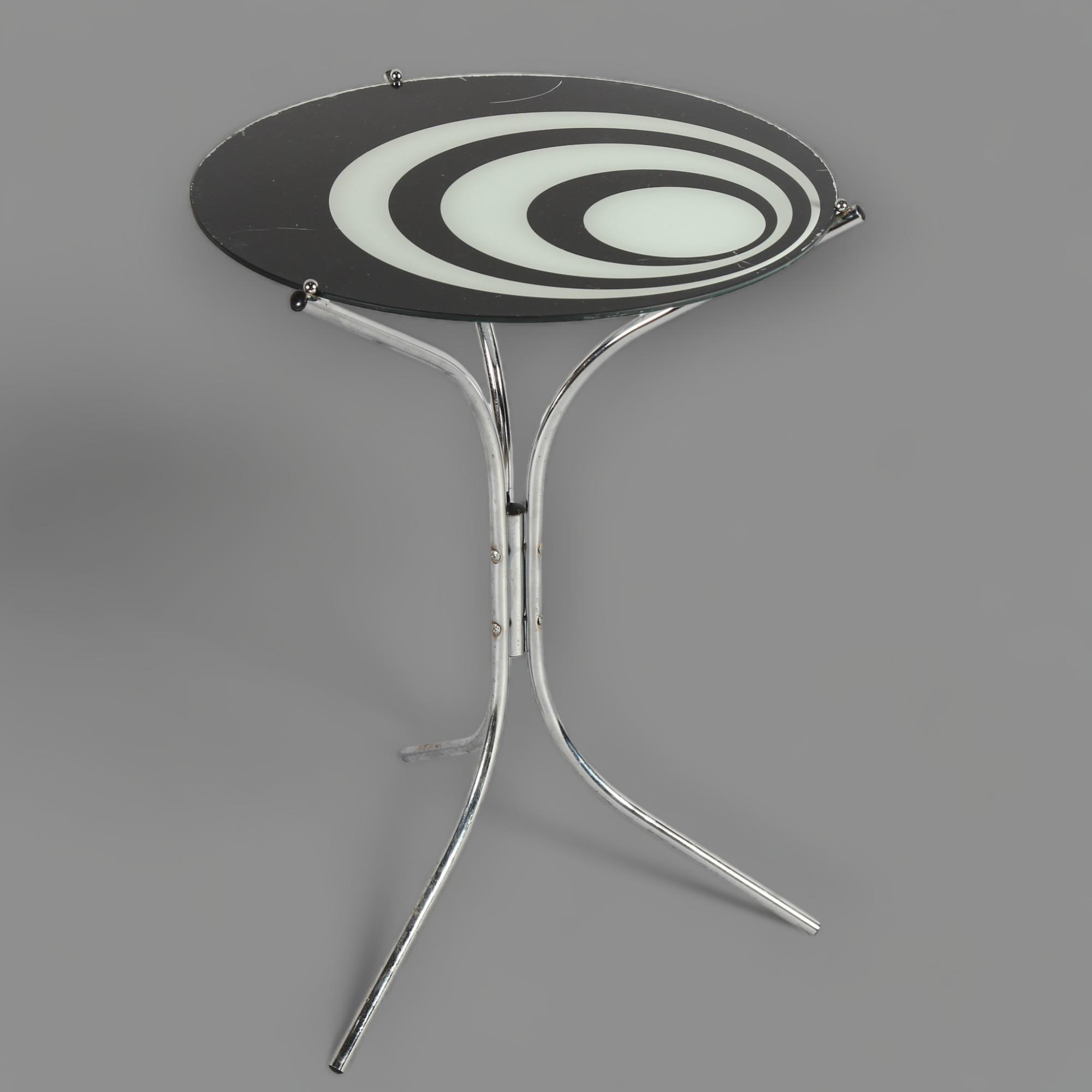 A 1960s' Op art side table, with aluminium frame and glass top, height 61cm, diameter 44cm