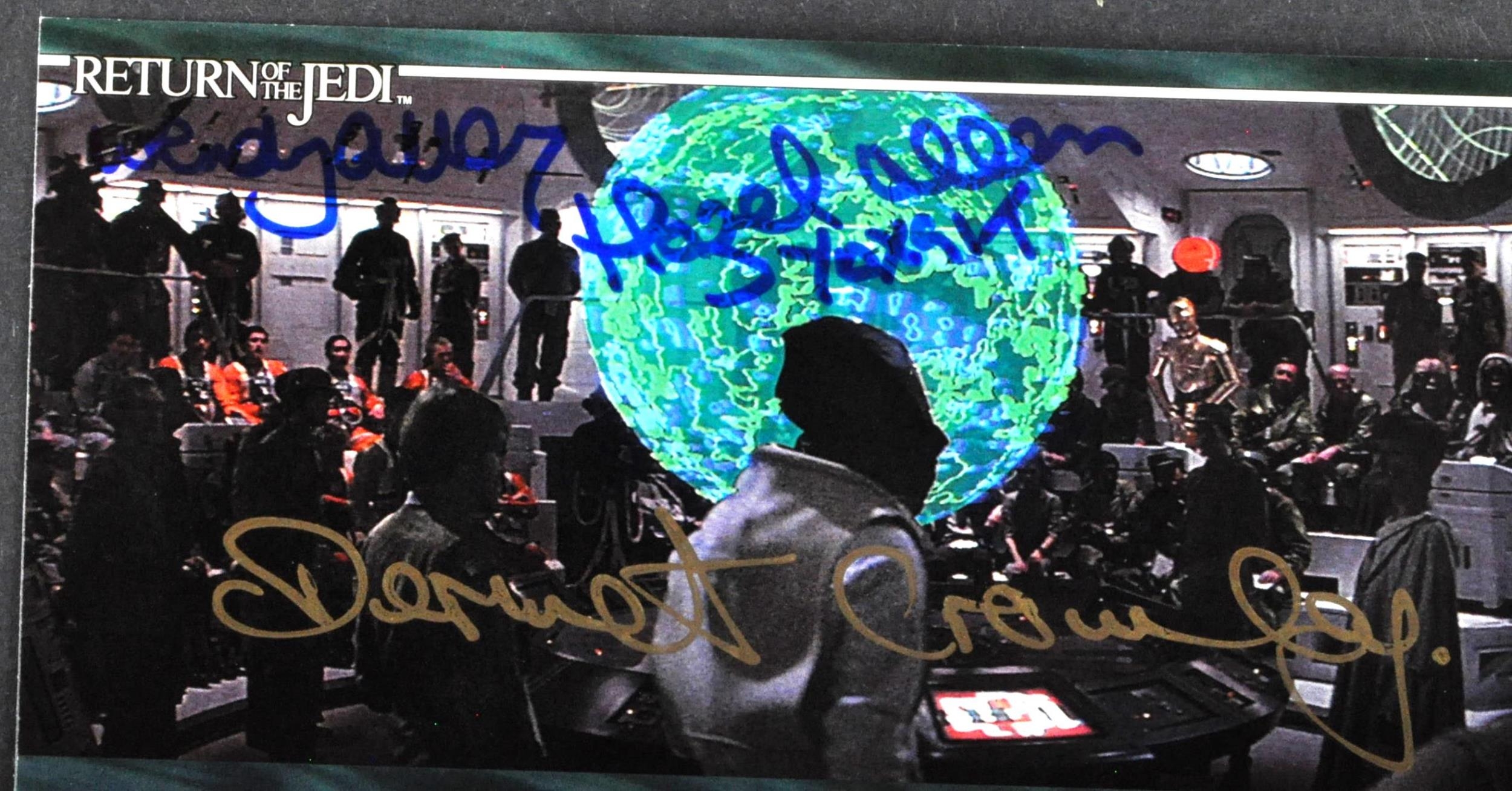 Star Wars - Return Of The Jedi - a Topps made Widevision trading card, triple-signed by x3 actors depicted on the card. Autographs include; Dermot Crowley (General Madine), Wendy Allen (Rebel Technician) and Hazel Allen (Rebel). All undedicated. Obtained personally by the vendor.