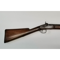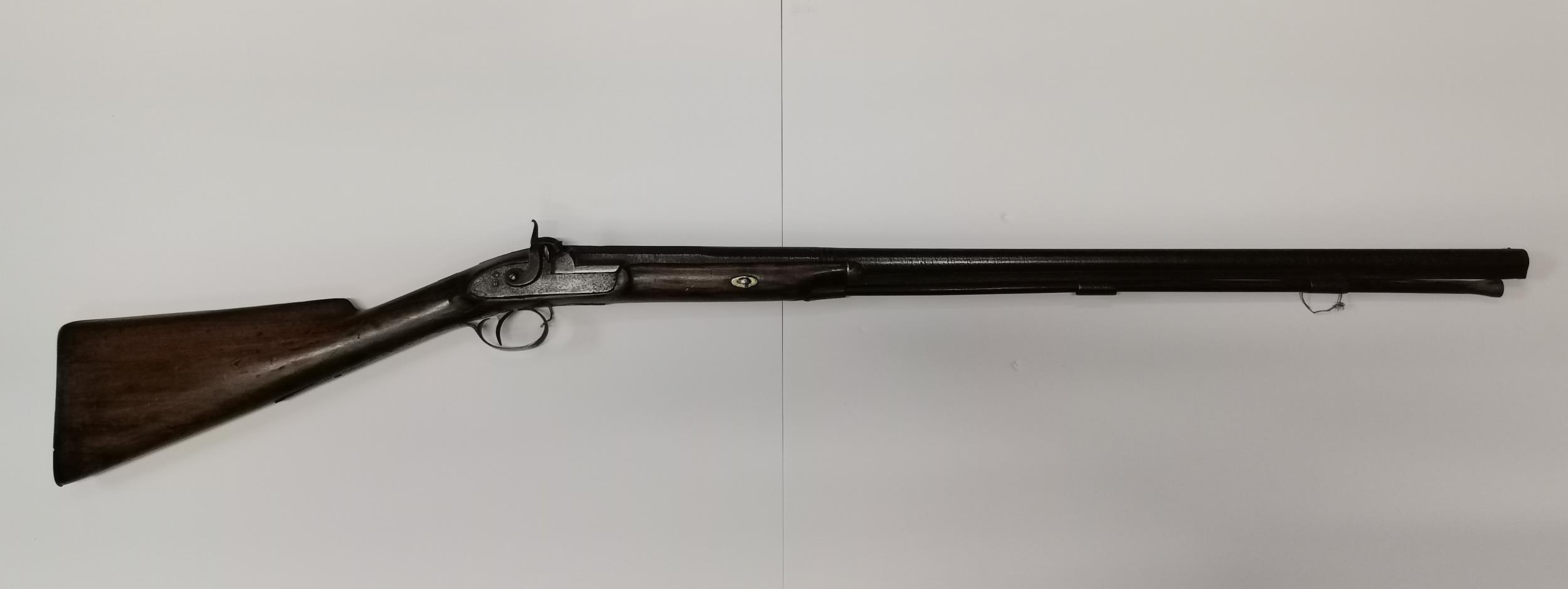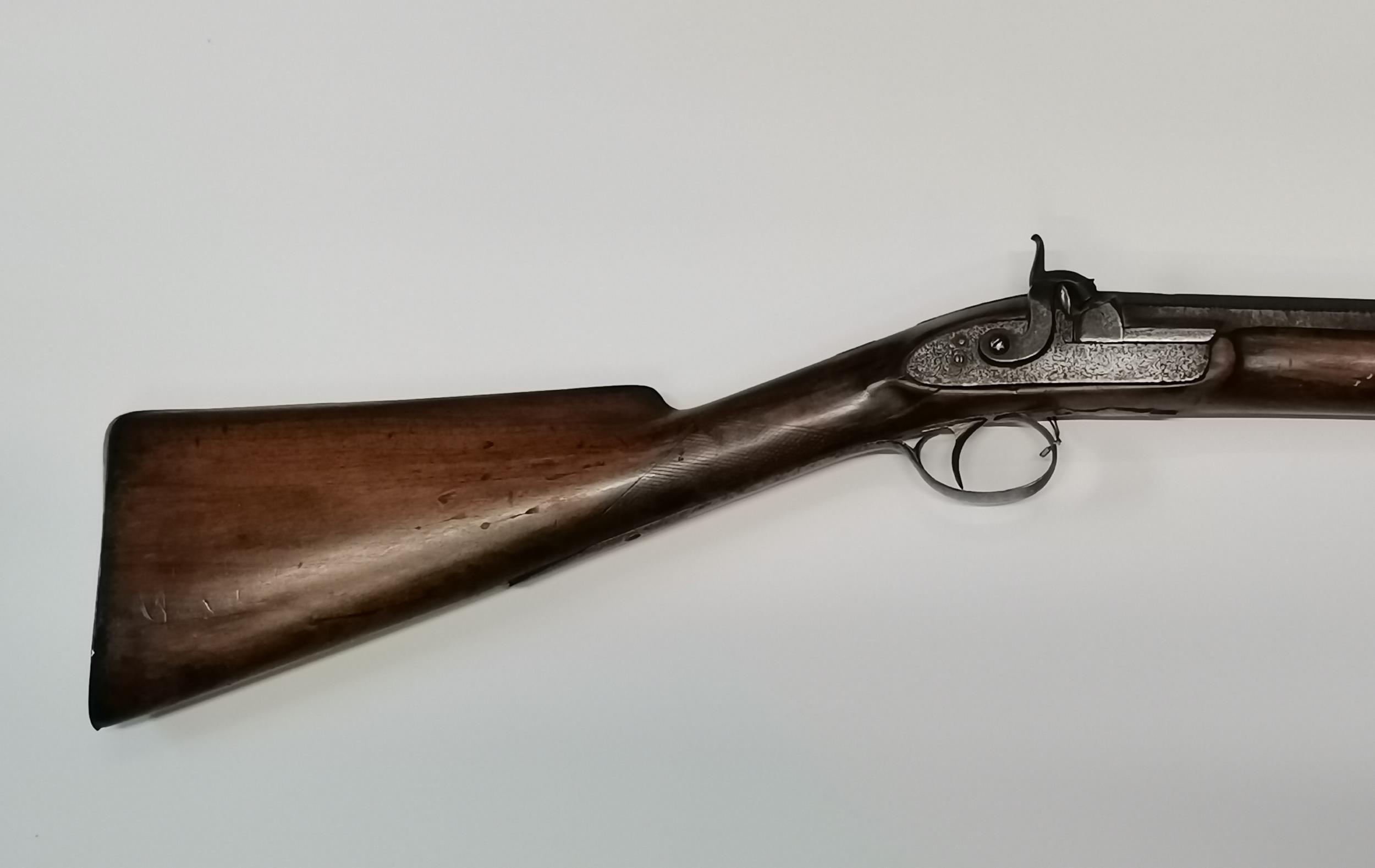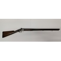 A muzzle loading percussion sporting gun, late 19th/early 20th Century, the 32-inch octagonal to round barrel with gilt-metal band at the breech, the walnut stock with chequered grip, the lockplate with scrolling foliate engraving, with steel furniture and vacant cartouche, the trigger guard with pineapple finial, with brass-tipped wooden ramrod, unsigned. 123cm long overall