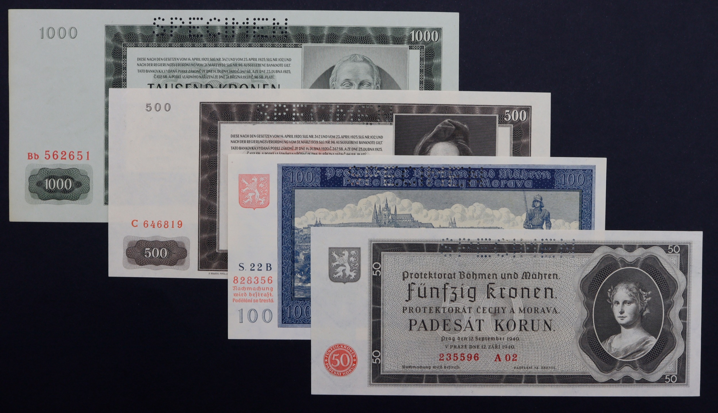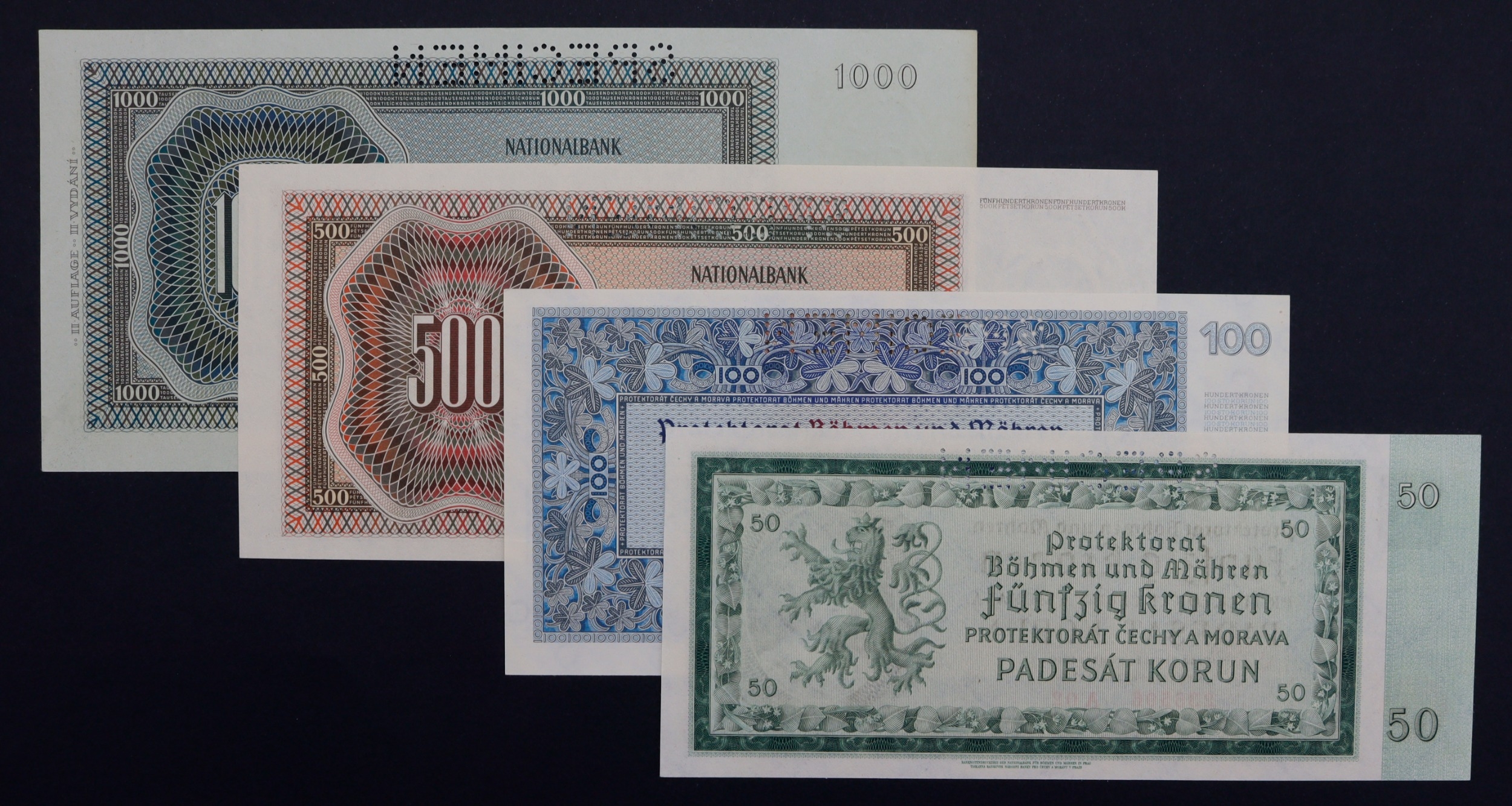 Bohemia & Moravia (4), 50 Korun SPECIMEN dated 12th September 1940, serial A02 235596 (BNB B105as, Pick5as), 100 Korun SPECIMEN dated 20th August 1940, serial S.22B 828356 (BNB B106as1, Pick6s), 500 Korun dated 1942, perforated SPECIMEN, serial C 464819 (BNB B201as, Pick11s), 1000 Korun dated 1942, II Auflage (2nd issue) perforated SPECIMEN, serial Bb 562651 (BNB B204s, Pick15s) all perforated 'SPECIMEN', all Uncirculated