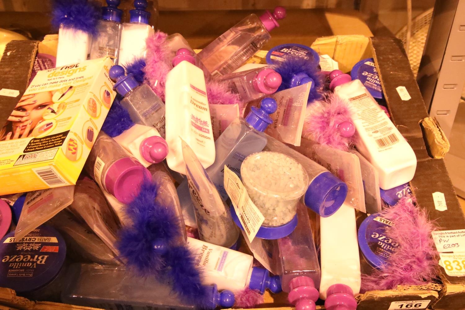 Box containing a large quantity of ladies bath crystals, body lotions, body scrubs etc. Not available for in-house P&P