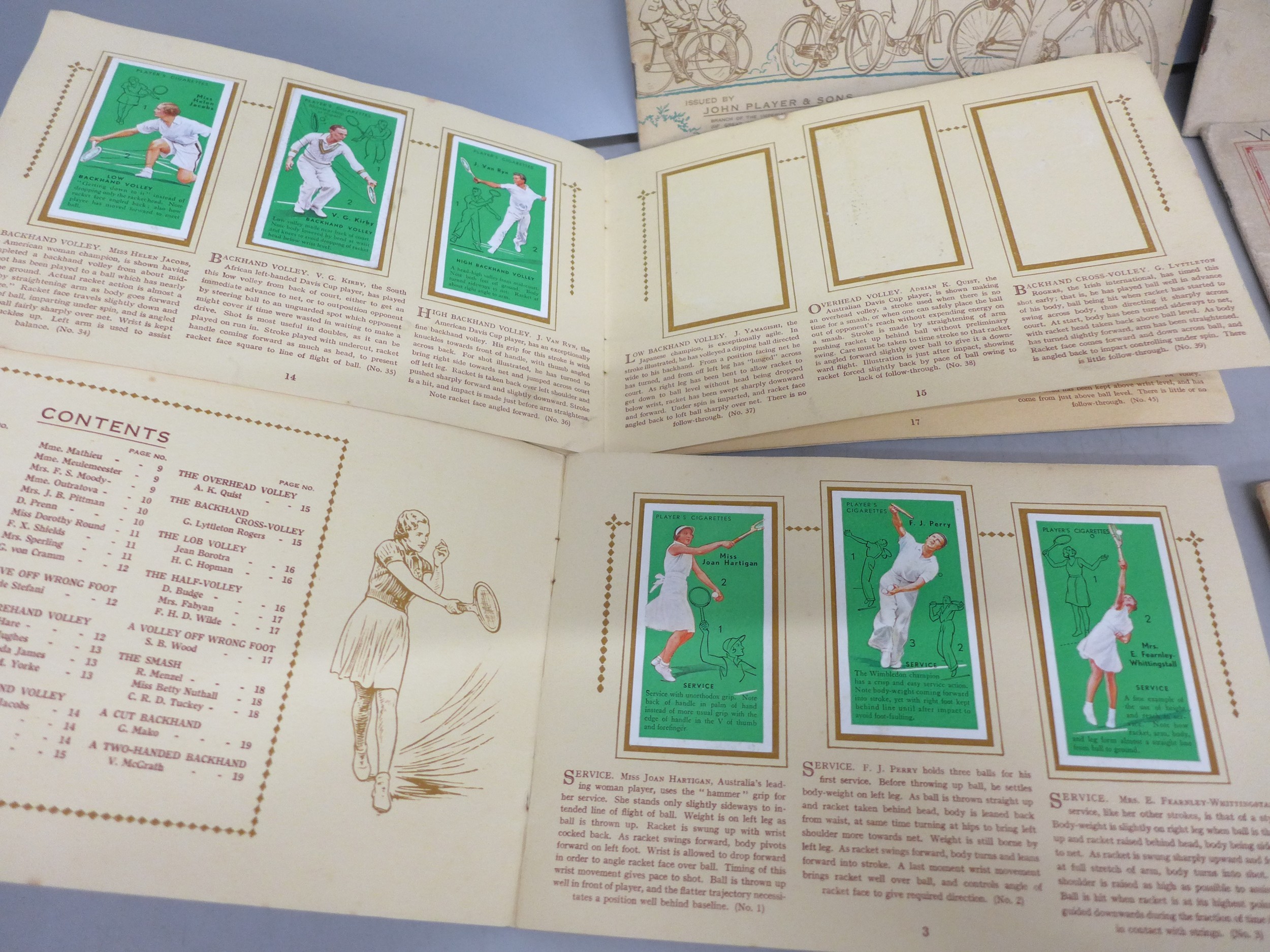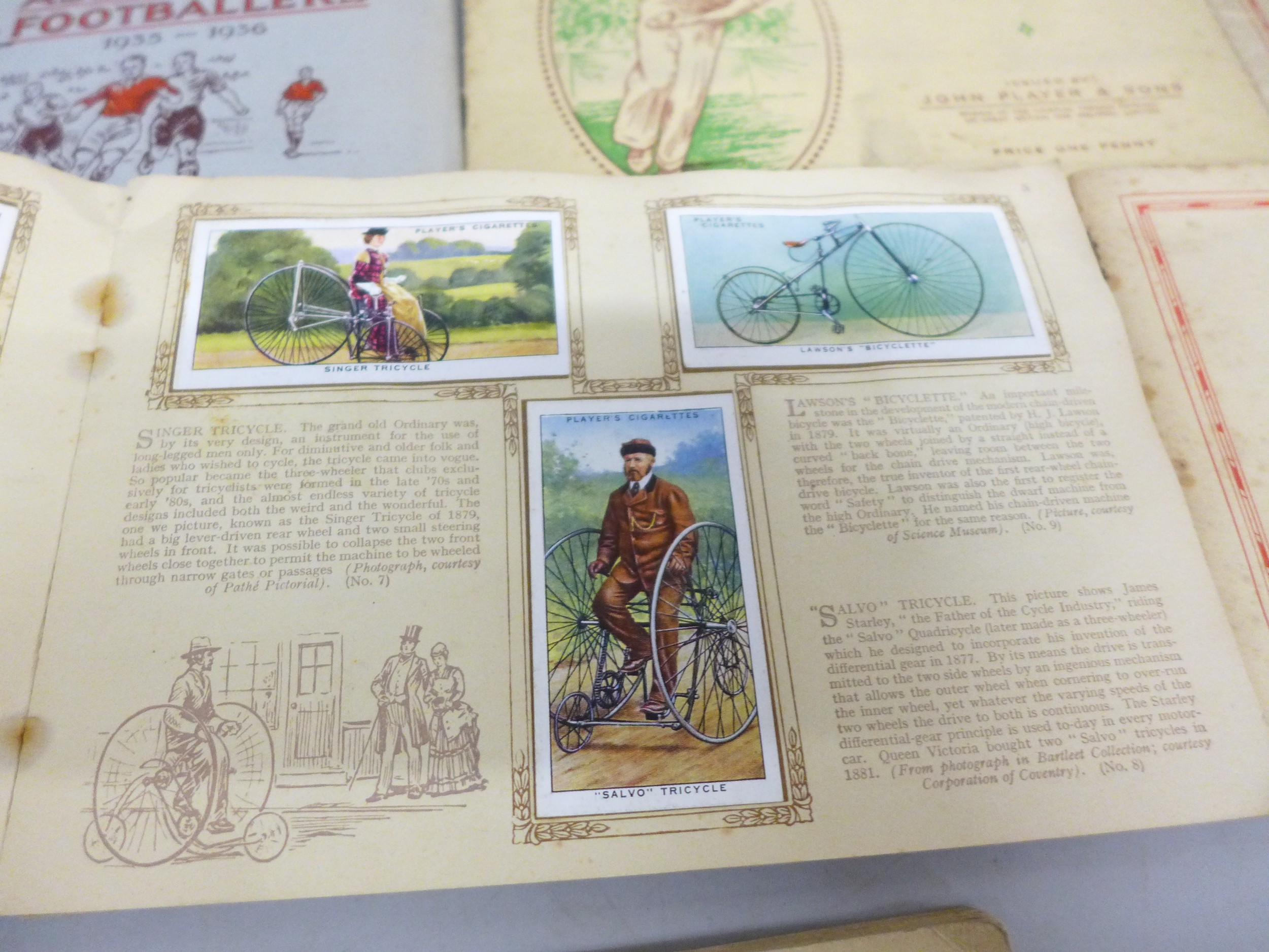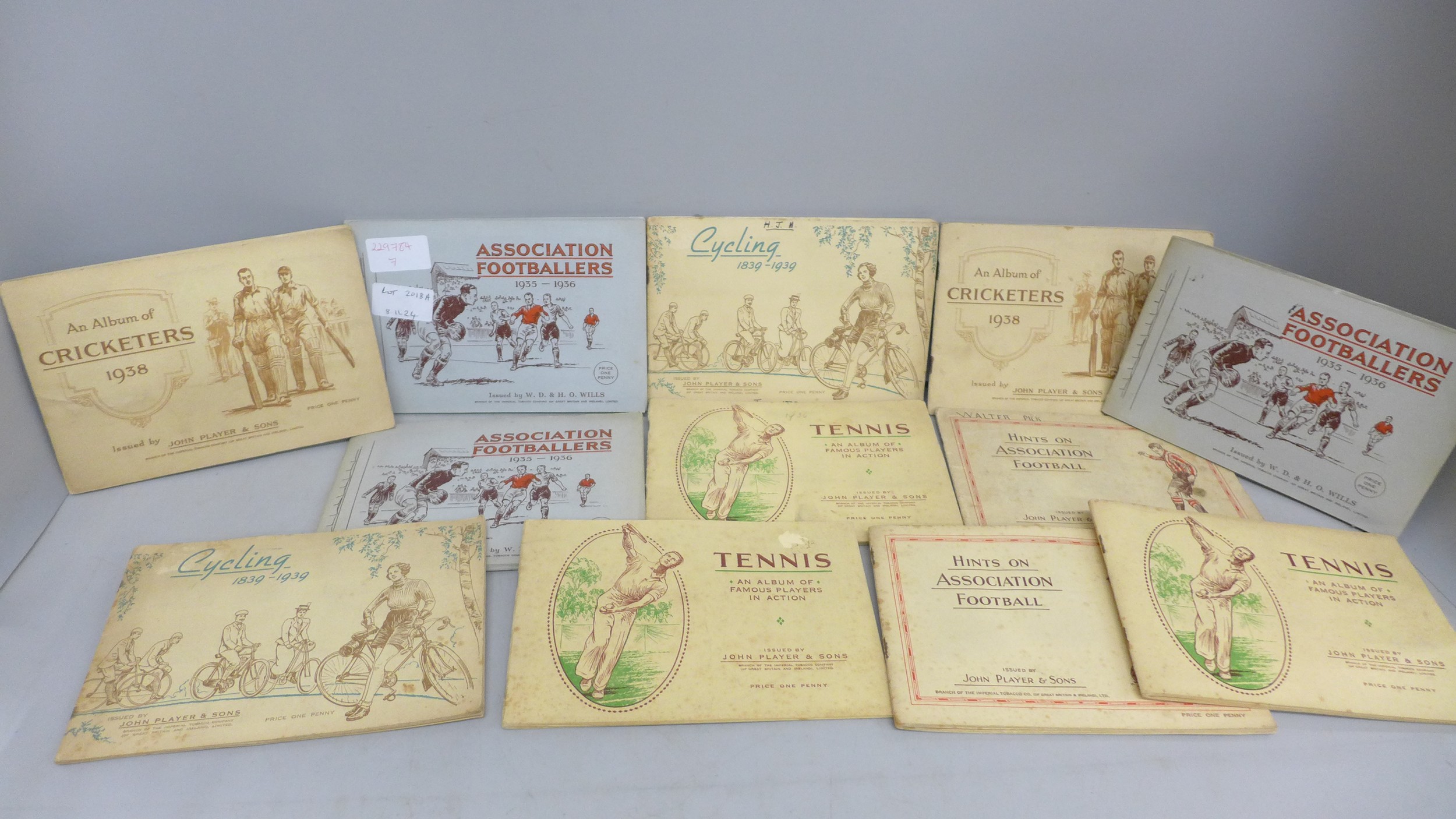 Collection of sporting related cigarette cards in albums to include Association Footballers 1935-1936, Cycling 1839-1939, Tennis, Album of Cricketers 1938, etc. From Wills and Player & Sons tobacco