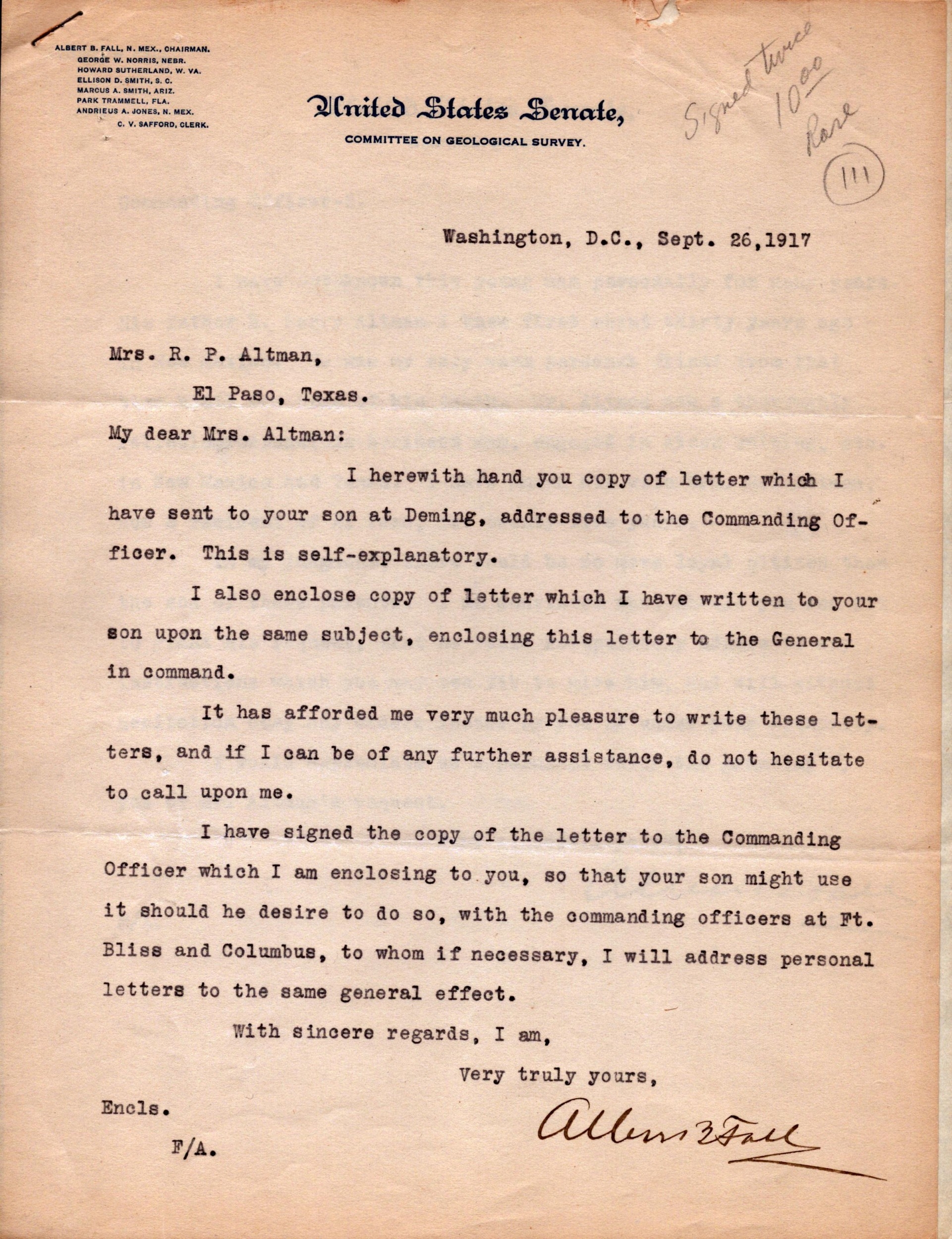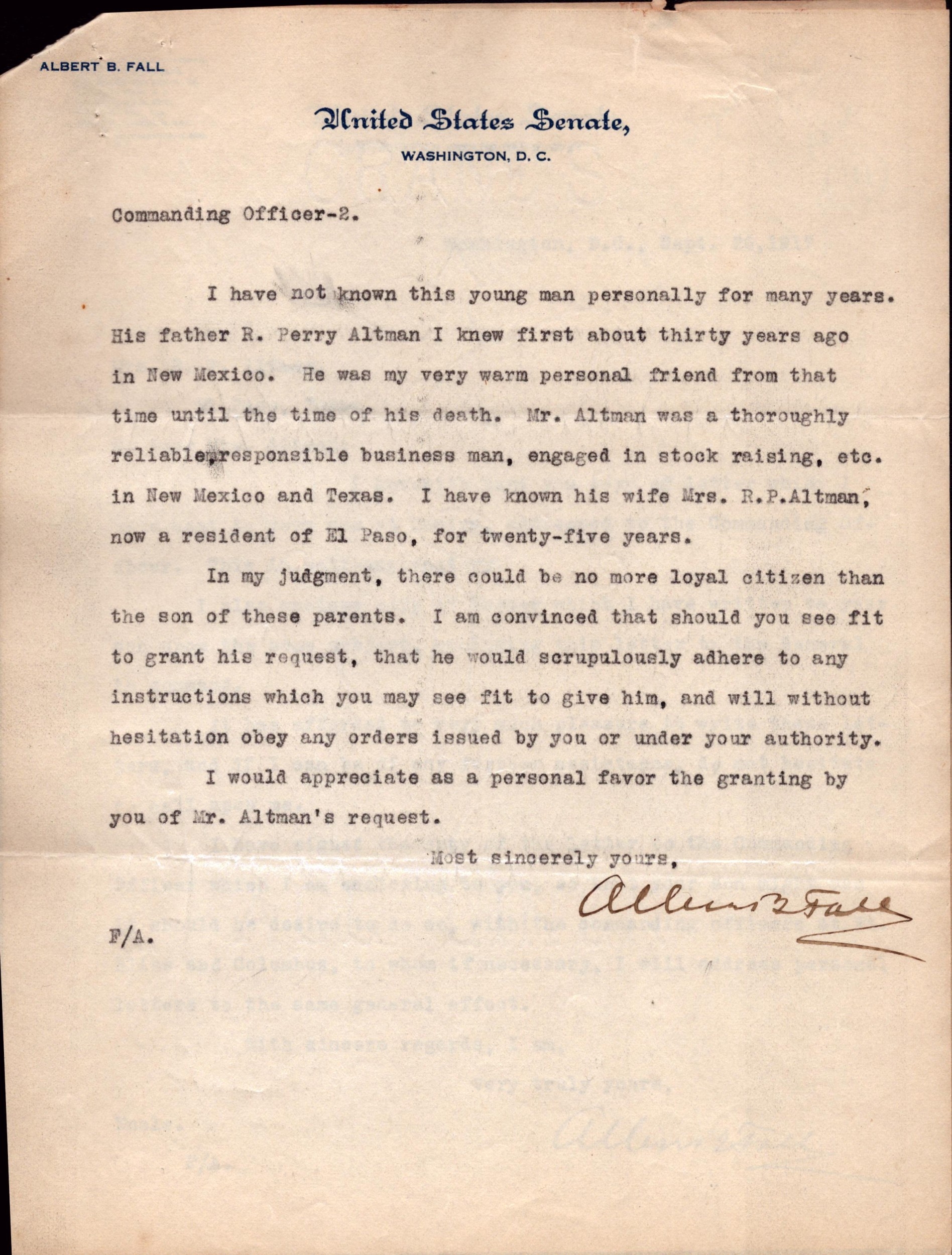 Albert Bacon Fall TLS. 2 Letters one addressed to Mrs P Altman and one to a Commanding Officer, letters are affixed with a staple. (November 26, 1861 November 30, 1944) was a United States senator from New Mexico and Secretary of the Interior under President Warren G. Harding who became infamous for his involvement in the Teapot Dome scandal; he was the only person convicted as a result of the affair. As a captain in the United States Army, he supported a military invasion of Mexico in 1916 as a means of ending Pancho Villa's raids.