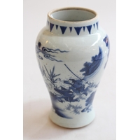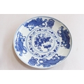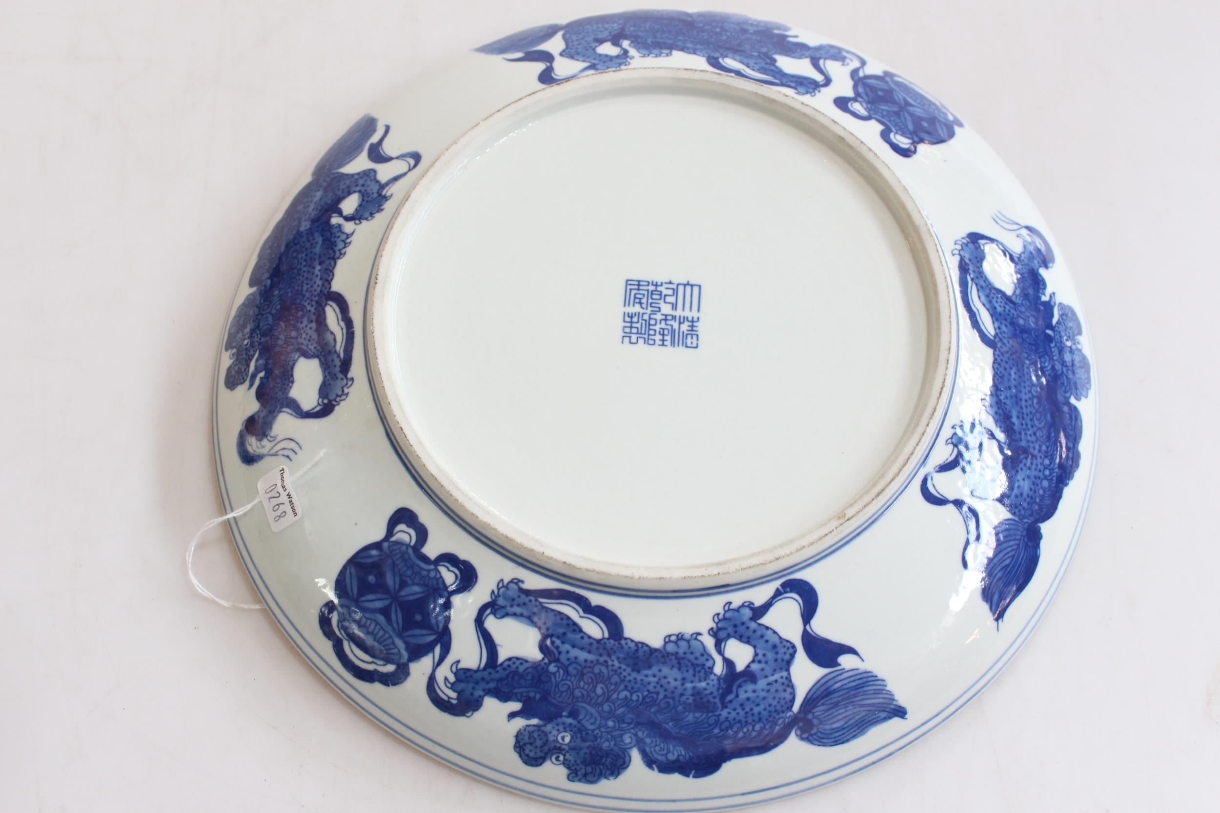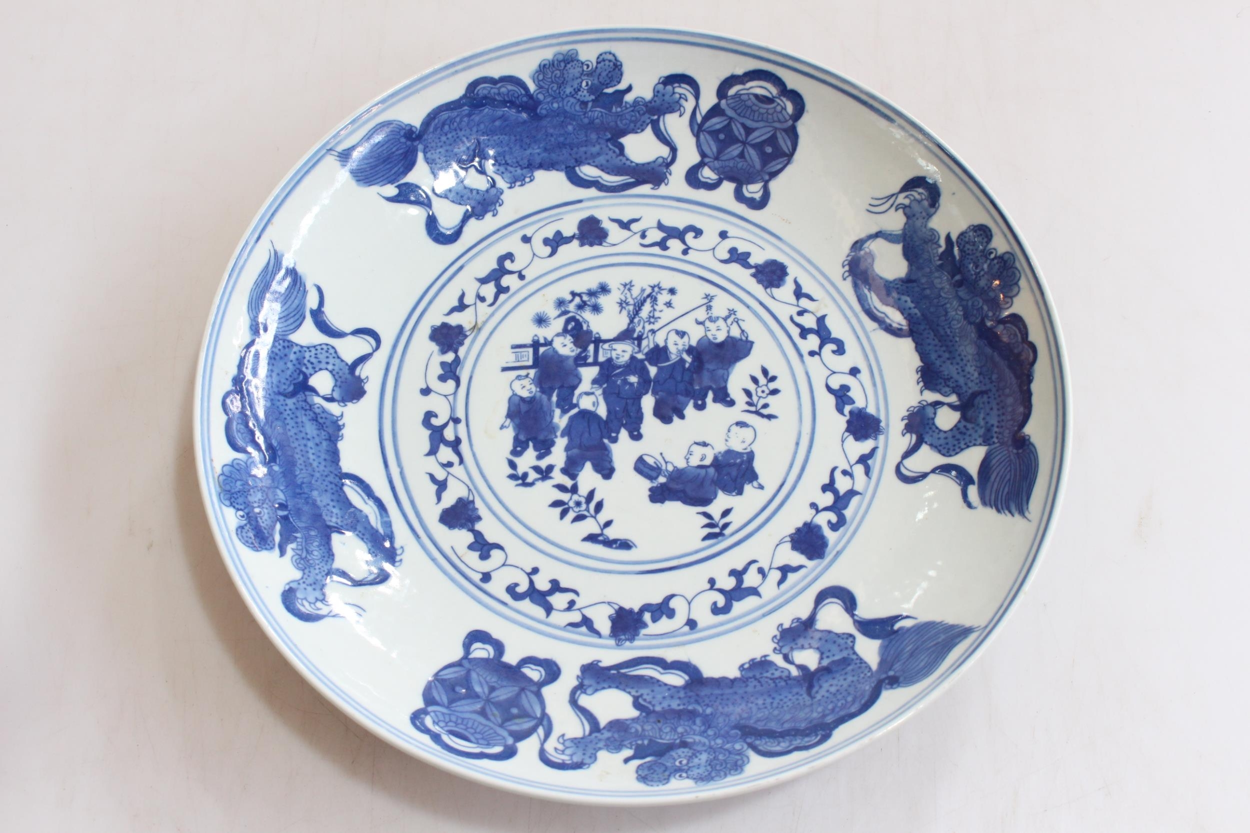 Chinese blue and white saucer dish, decorated with children and dragon border, 29cm diameter.