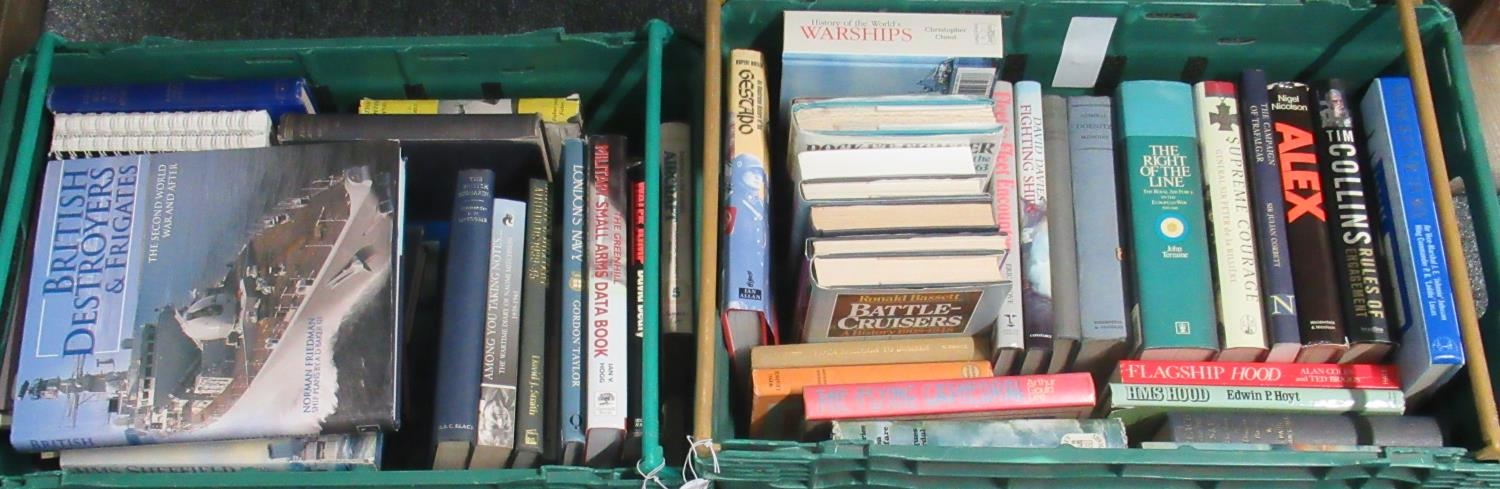 Two boxes of largely military hardback books to include: 'History of the World's War Ships' by Christopher Chant, 'Supreme Courage' by General Peter de la Billiere, first edition of 'From Balloon to Bomber' by W. M. F. Burbidge, published in 1946, Tim Collins 'Rules of Engagement', 'The British Submarine' by Commander F W Lipscomb published in 1954 but reprinted with corrections version, first edition of 'Fabulous Admirals and Some Navy Fragments' compiled by Commander Jeffrey L Lowis printed in 1957, 'HMS Sheffield The Life and Times of Old Shiny' by Ronald Bassett, first edition of 'British Fighter Planes' by C G Gray published by Faber & Faber, etc. (2)