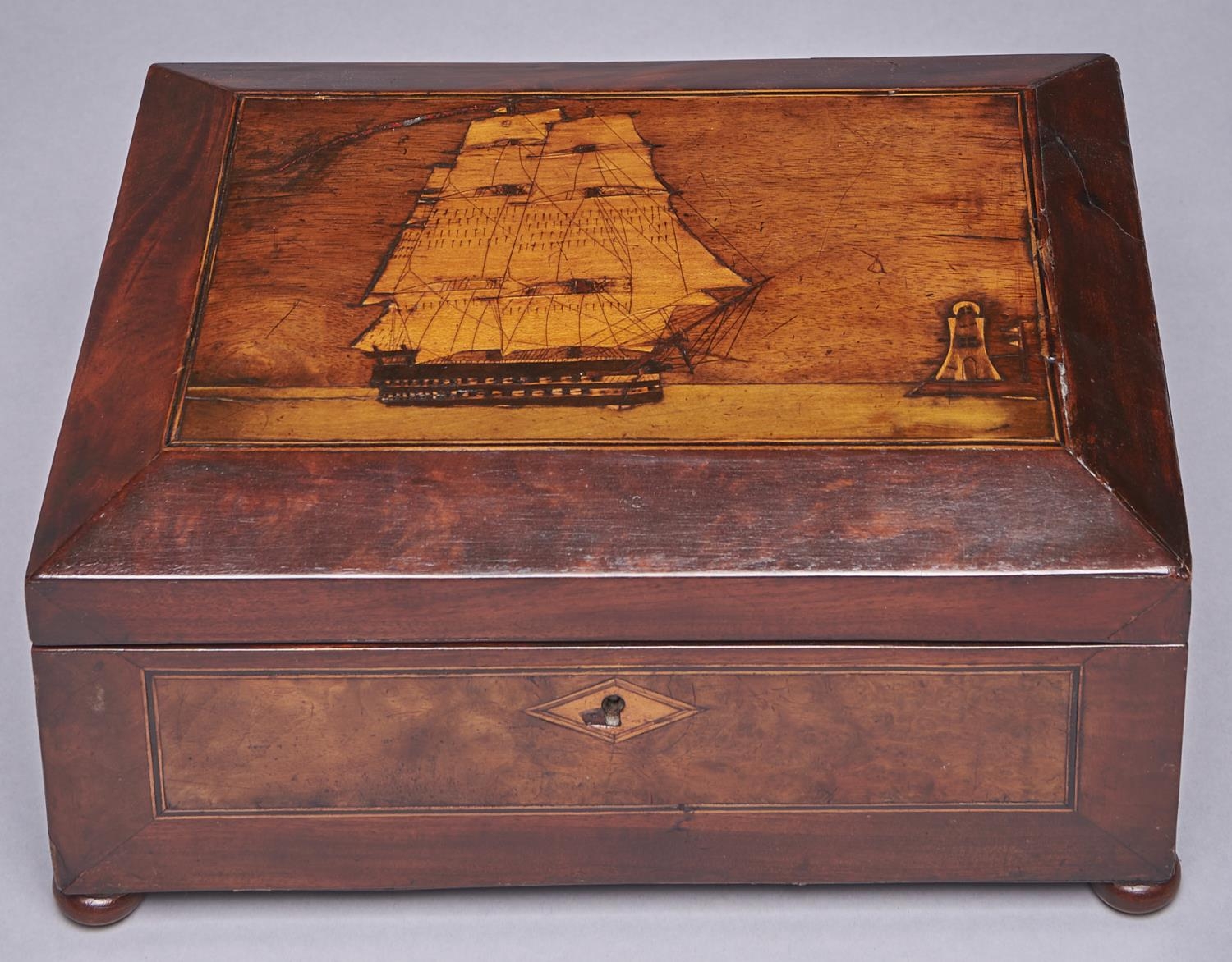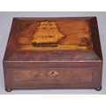 A sailor's mahogany, walnut, inlaid and penwork decorated workbox, late 19th c, the lid with a ship and lighthouse, the interior with a tray and lidded compartments, 28cm l