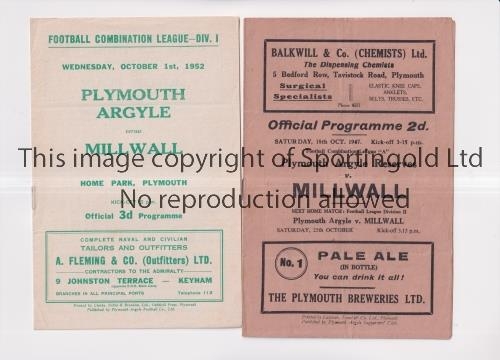 PLYMOUTH ARGYLE RESERVES V MILLWALL RESERVES Two programmes for Reserve team matches at Plymouth 18/10/1947 and 1/10/1952. Generally good