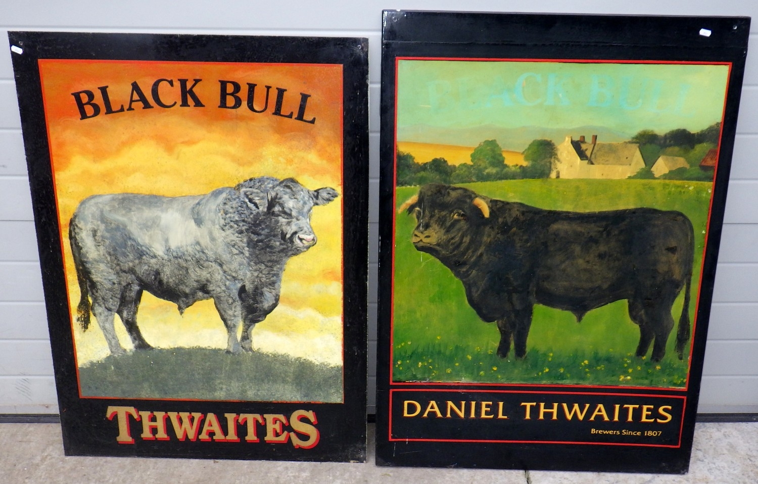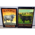 Two Thwaites, "Black Bull" single sided pub signs, largest 85cm x 120cm, this missing lettering