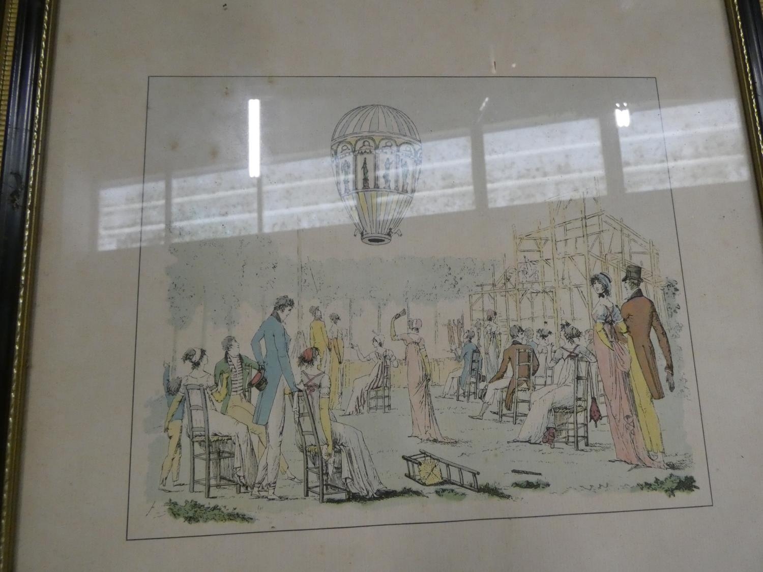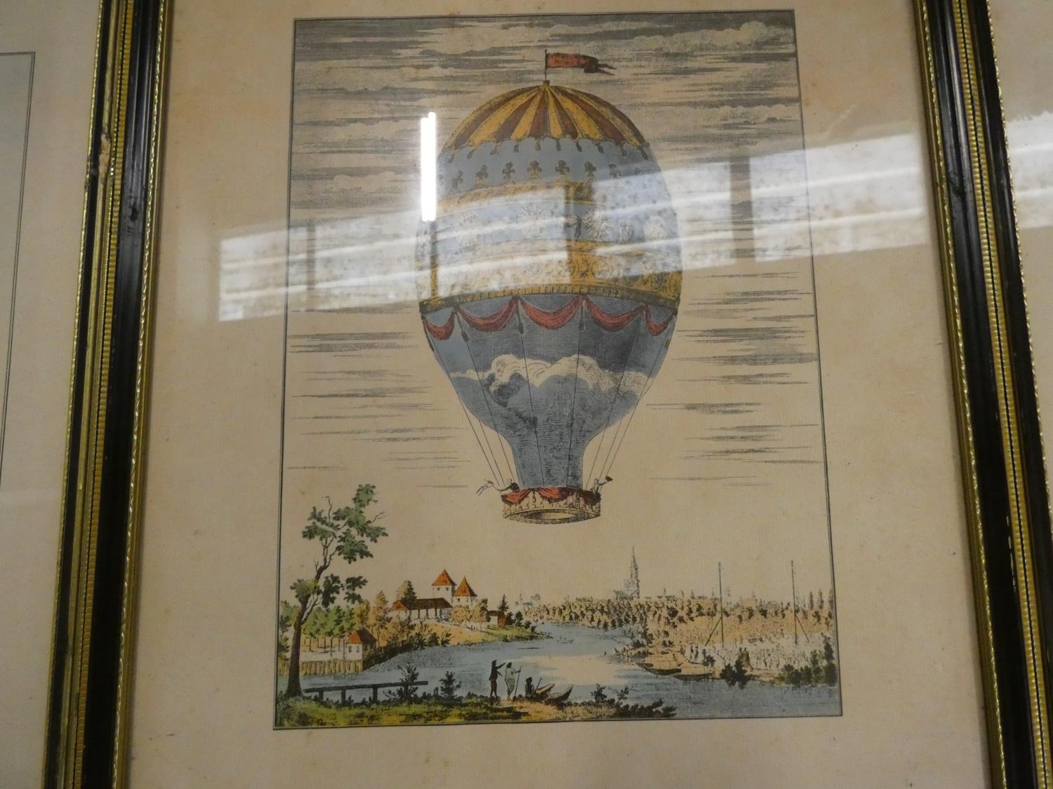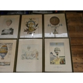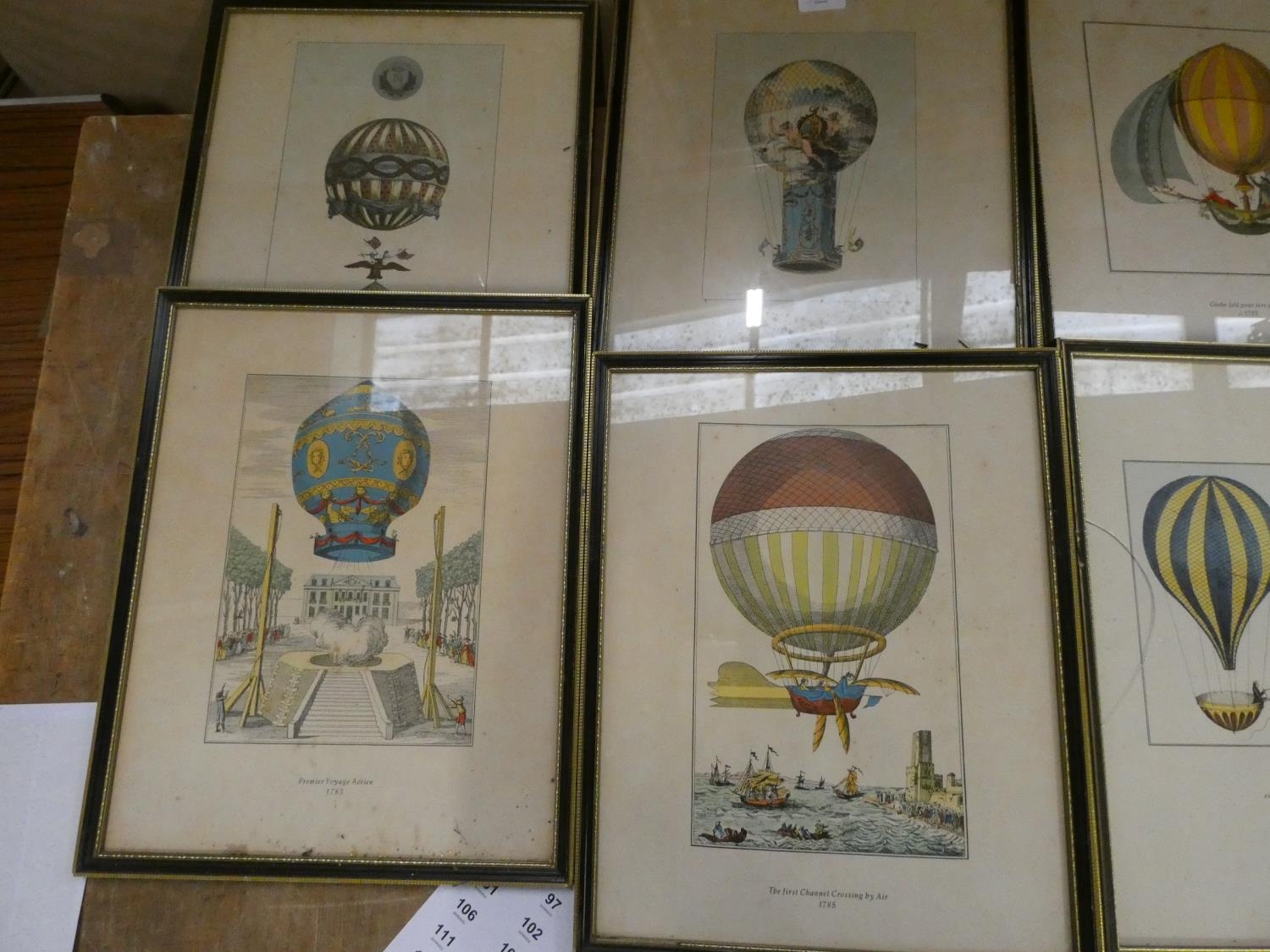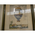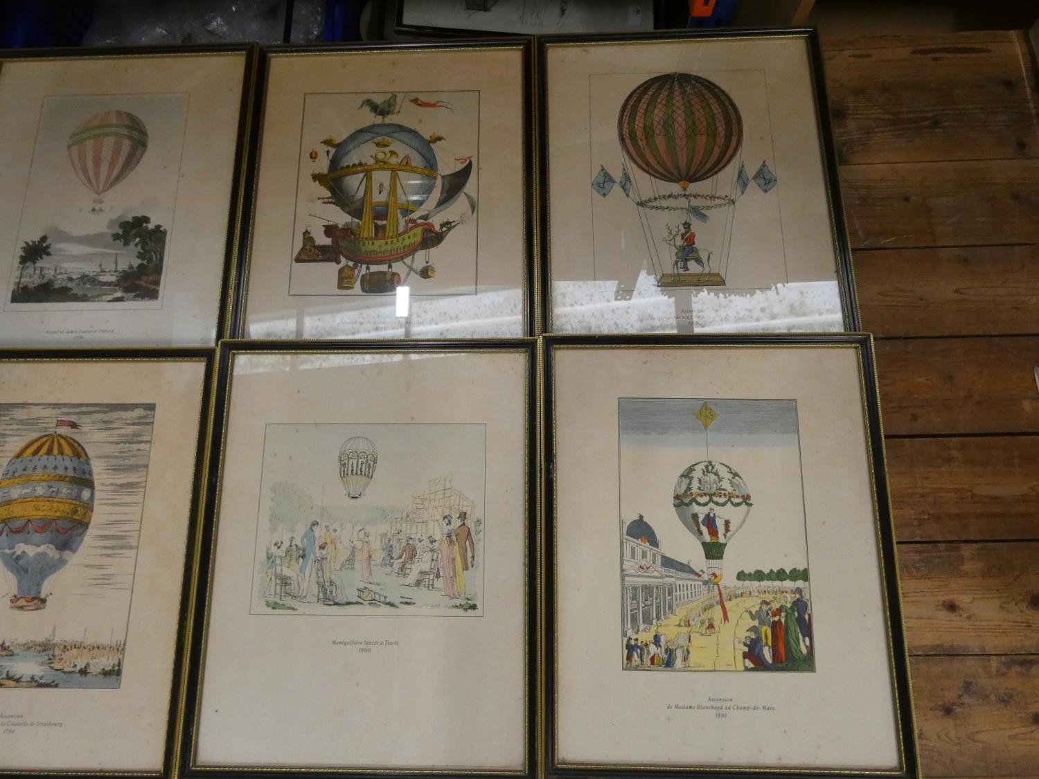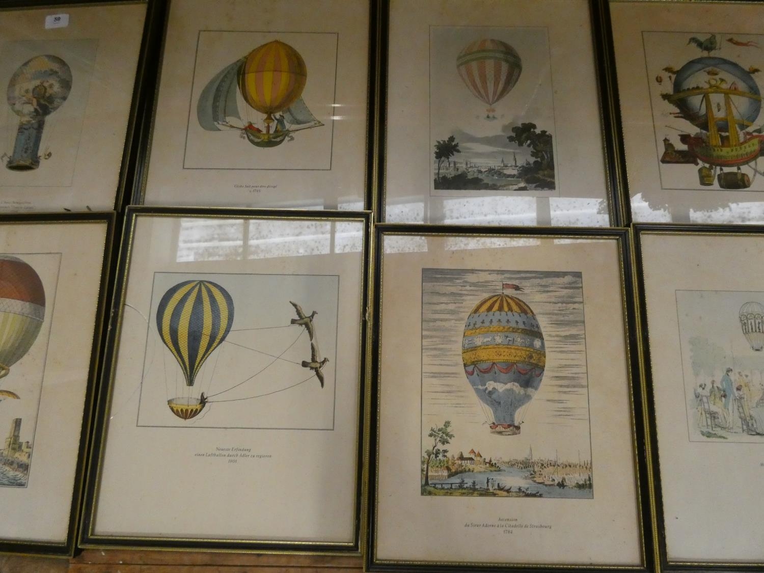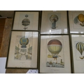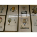 Set of twelve antique Hot Air Balloon prints framed, one with damaged glass.