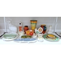 Collection of Poole Pottery, Beleek, Carltonware and other items, including a Poole pottery oviform gemstone pattern vase, moulded marks, initialled A, 16.8cm high, a Delphis green, orange and blue geometric-pattern shaped oblong dish and two small plates in the Delphis pattern in orange, a Shelley flared conical harmony dripware flower vase in orange, green and yellow on stepped foot, a Shelley shaped square plate and a shell-shaped dish, two Carltonware flower moulded green ground oval dishes, a Carltonware cockerel money box, a cat money box and a beefeater money box, a West German cylindrical vase moulded with geometric ornament enriched in mottled red and oranges and other items