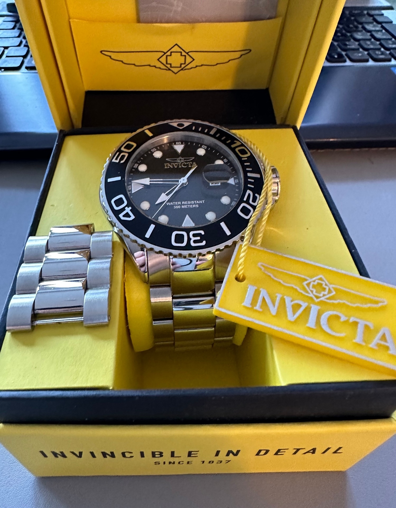 INVICTA Grand Diver heavy mens watch, 300m, spare links, boxed with tag, black face, stainless steel bracelet