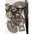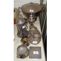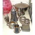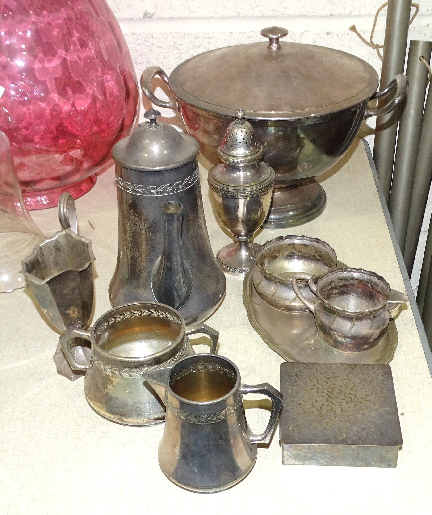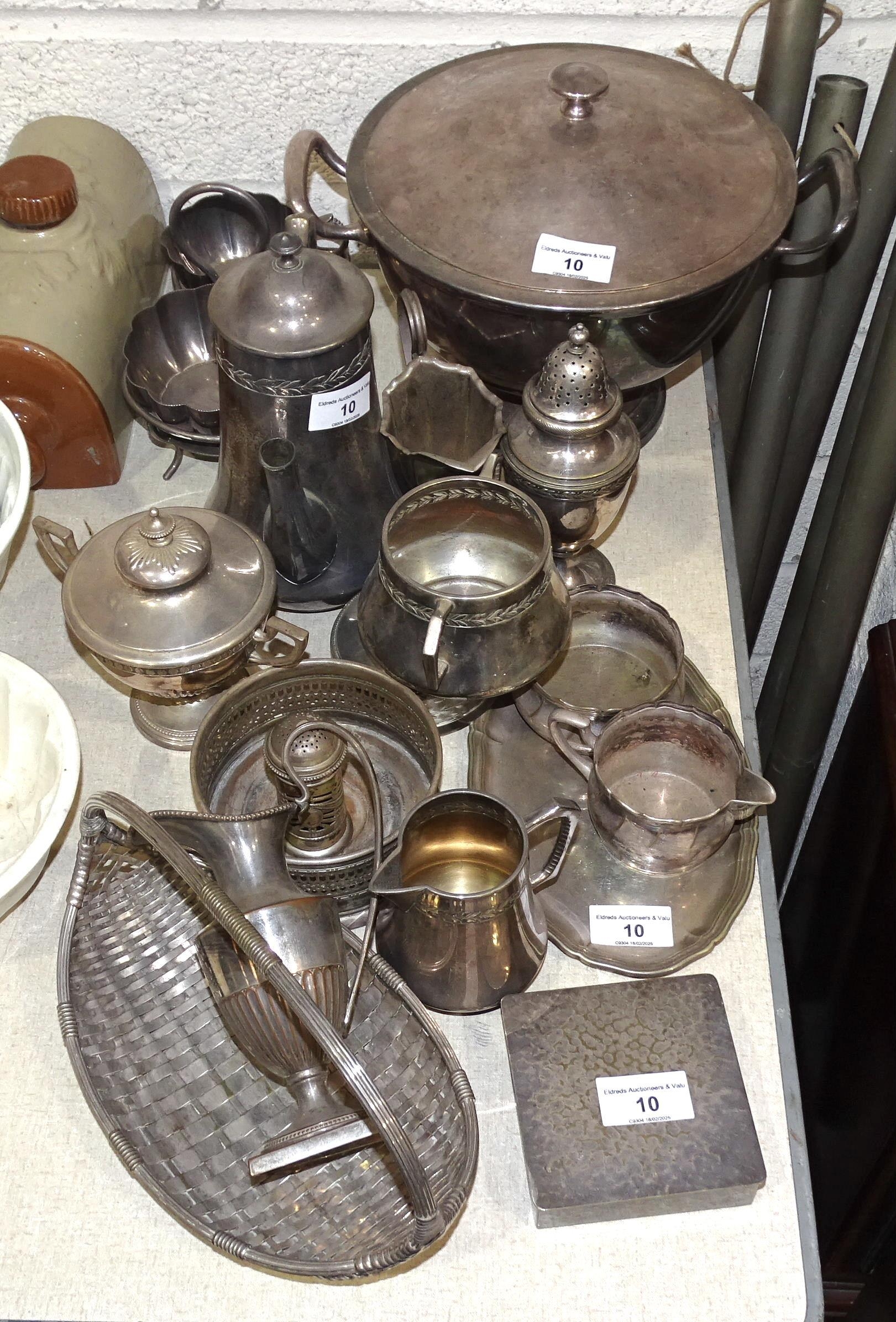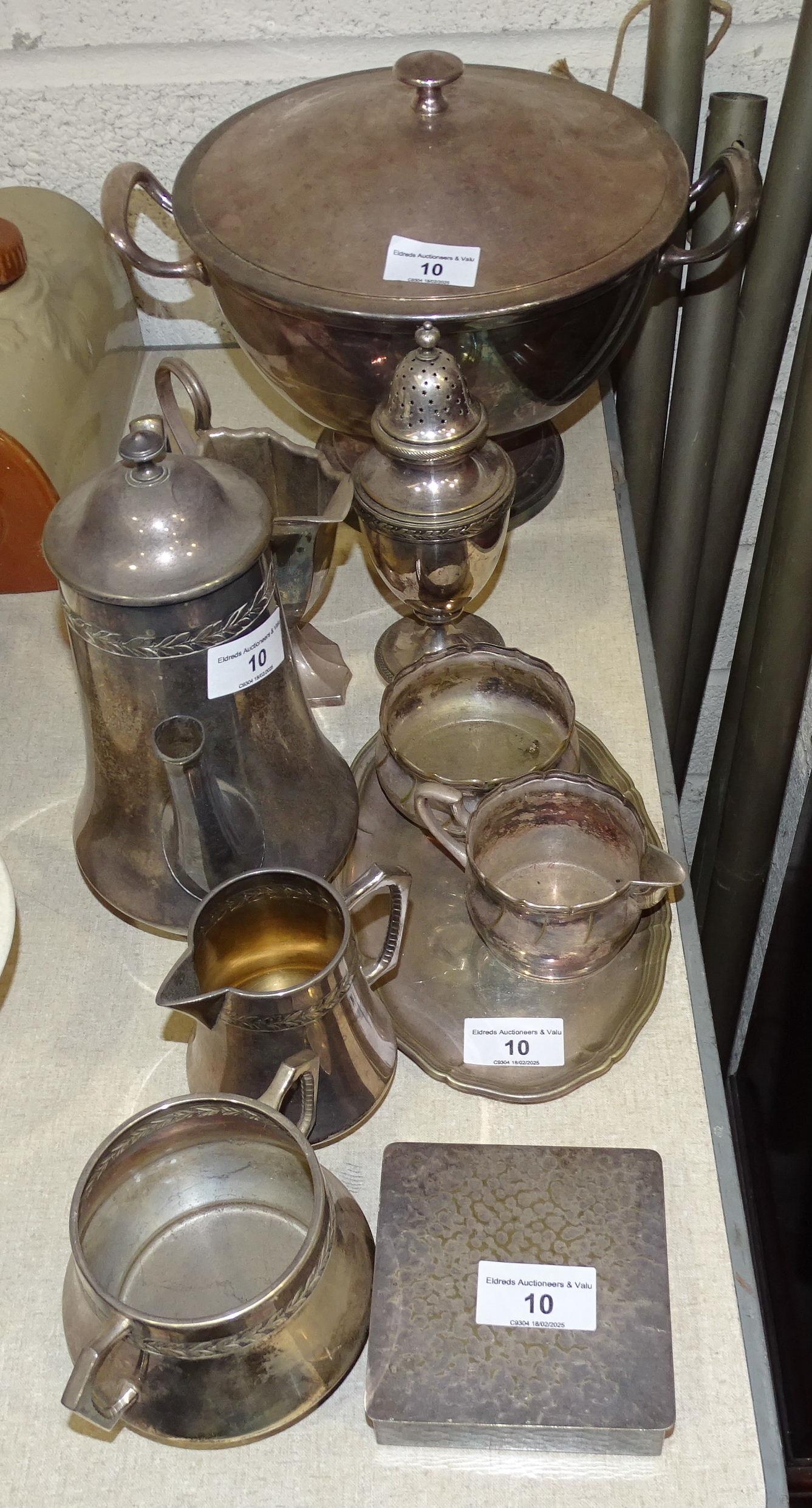A WMF plated two-handled bowl and cover, 30cm wide, 21cm high, a WMF sugar castor, 18cm high, a plated cream jug, sugar basin, small oval tray and box.