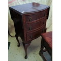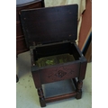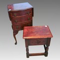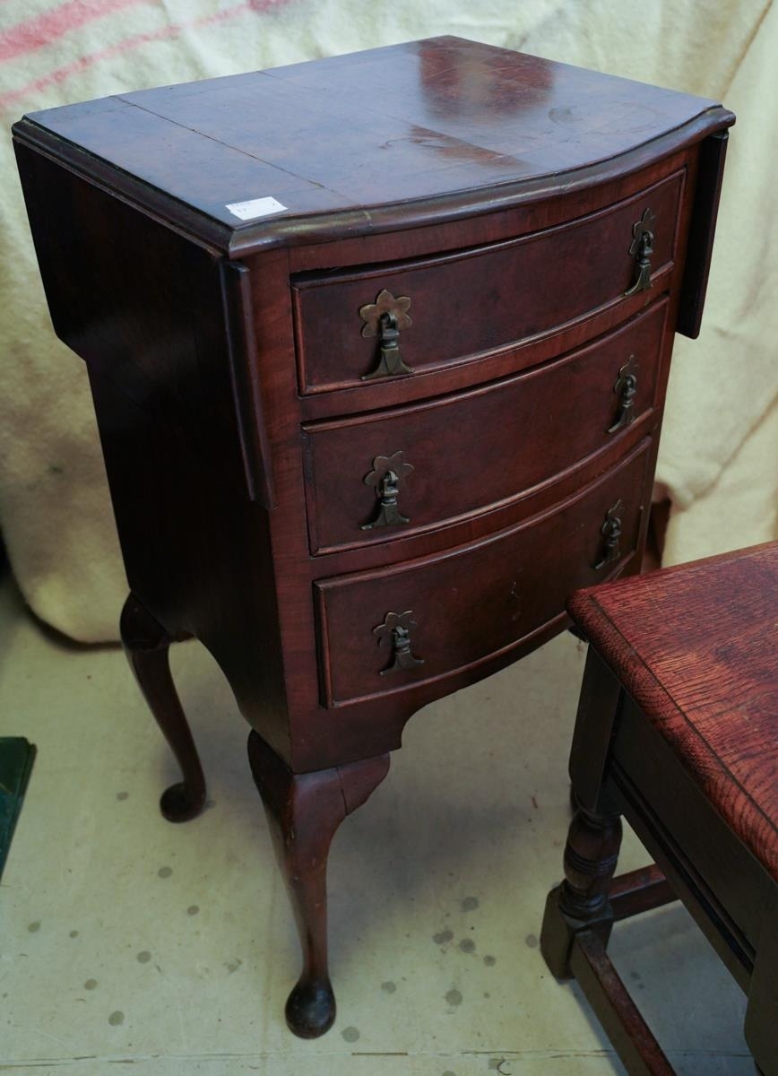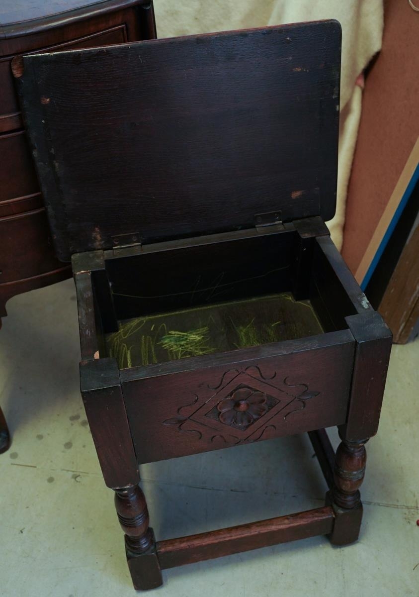 A reproduction oak stool seat, boxed seat, hinged top, carved detail to front, turned legs and plain stretchers, approx. 45 tall, 40 x 27 cm at the top together with a mid 20th century walnut veneered bedside table with drop flaps to sides and bow front and 3 draws. closed width 40 cm approx.