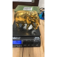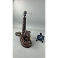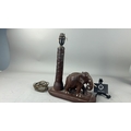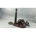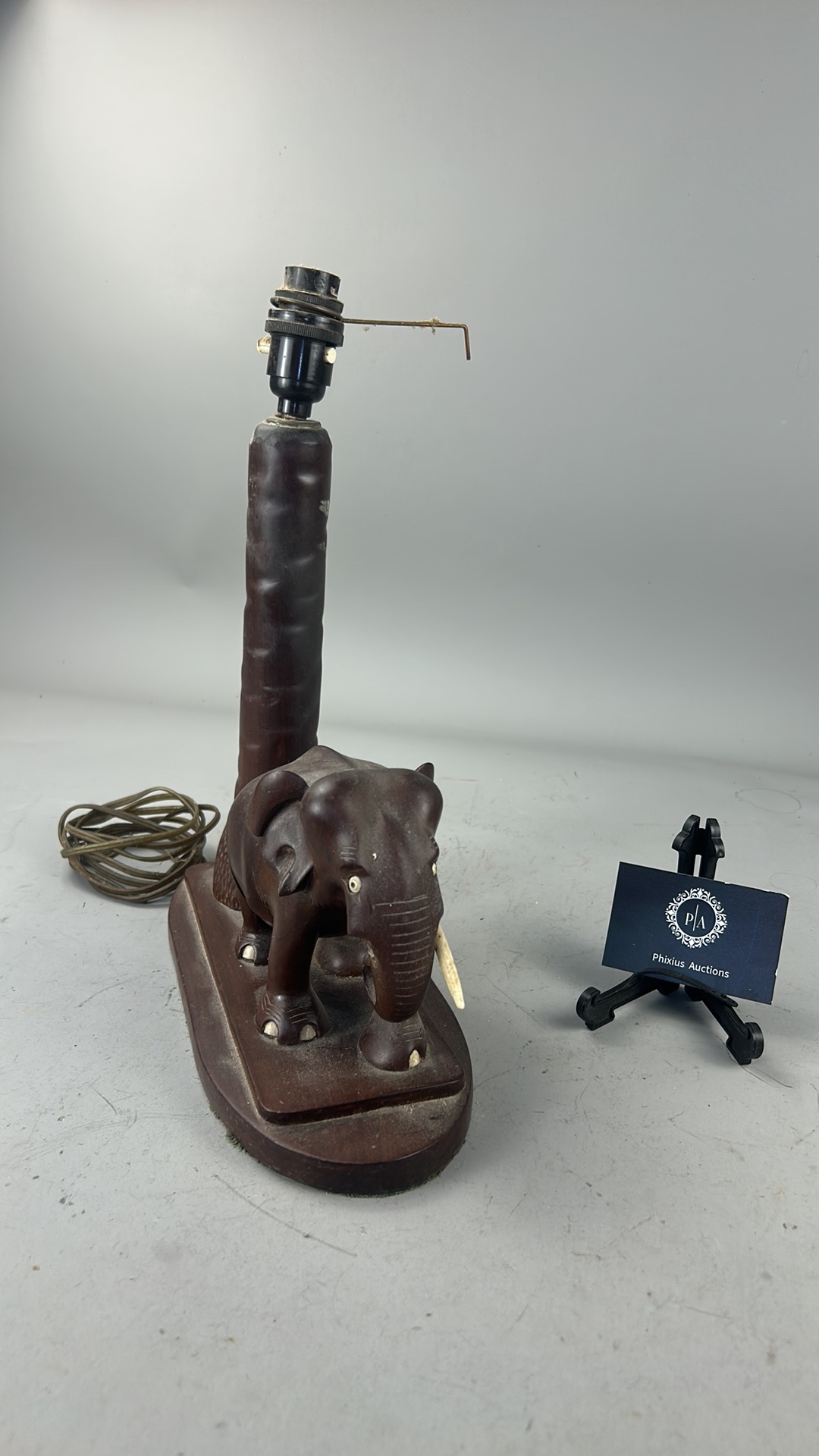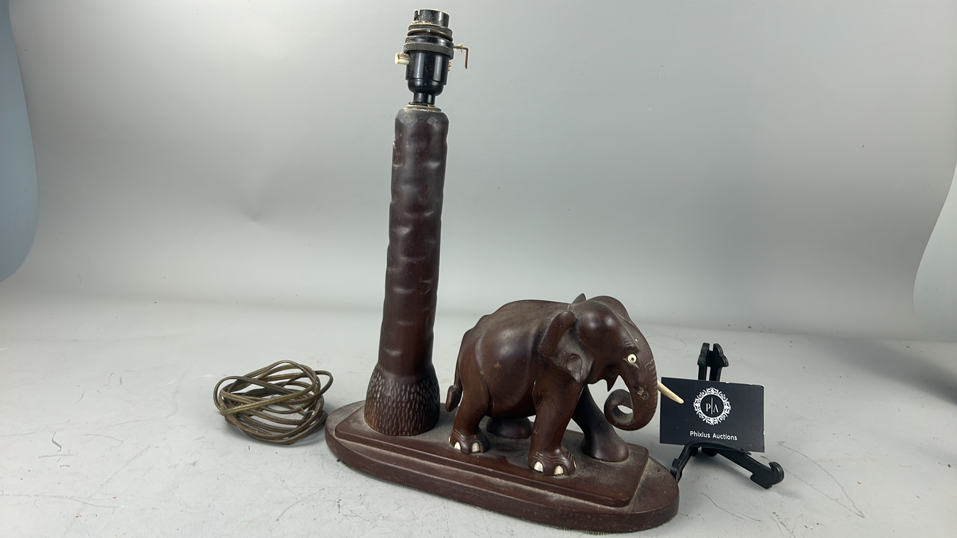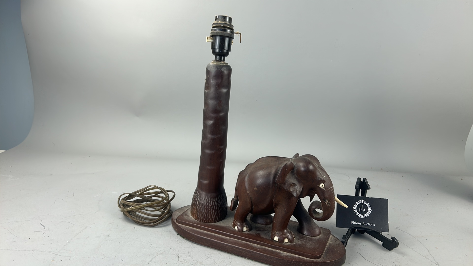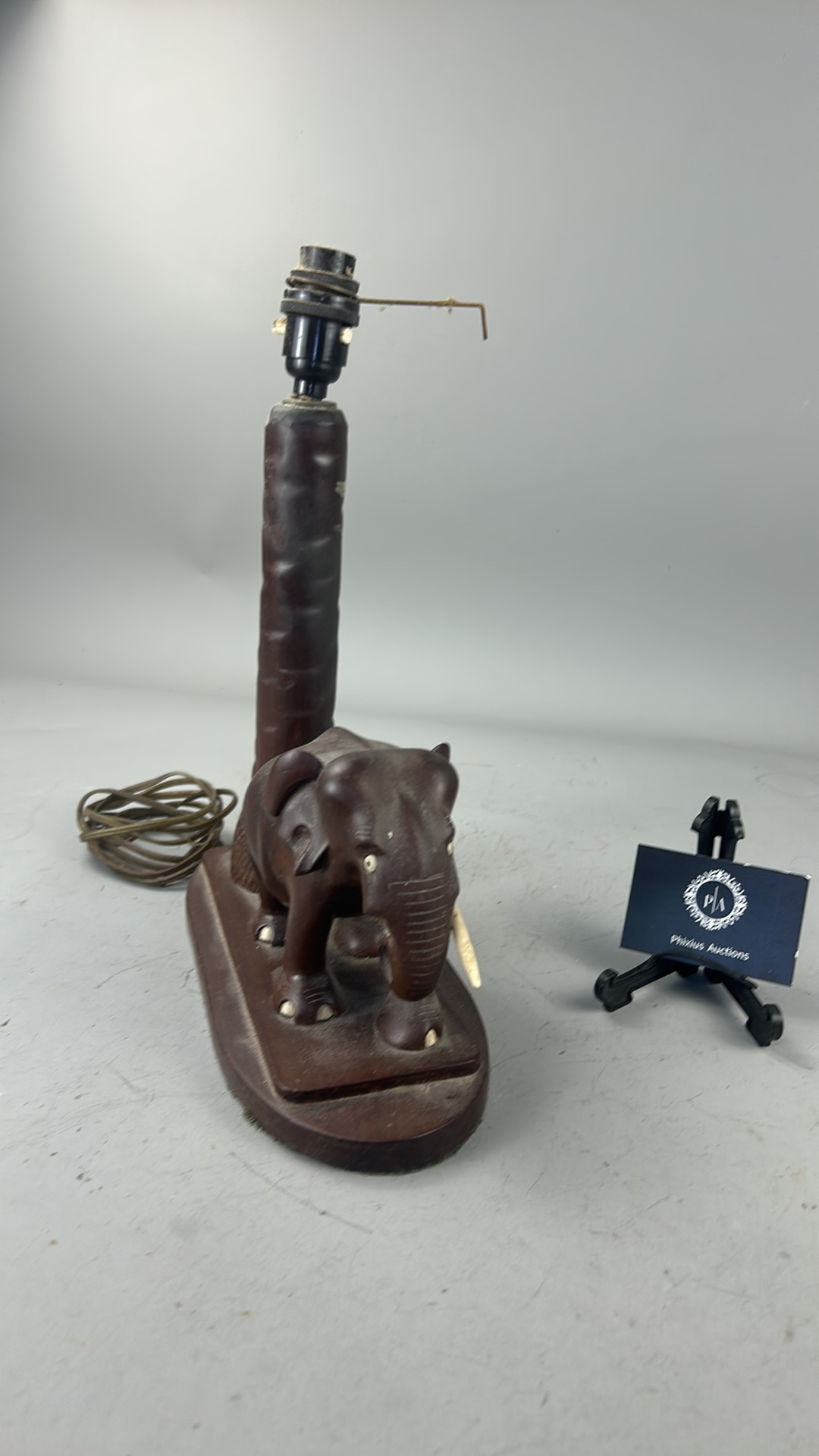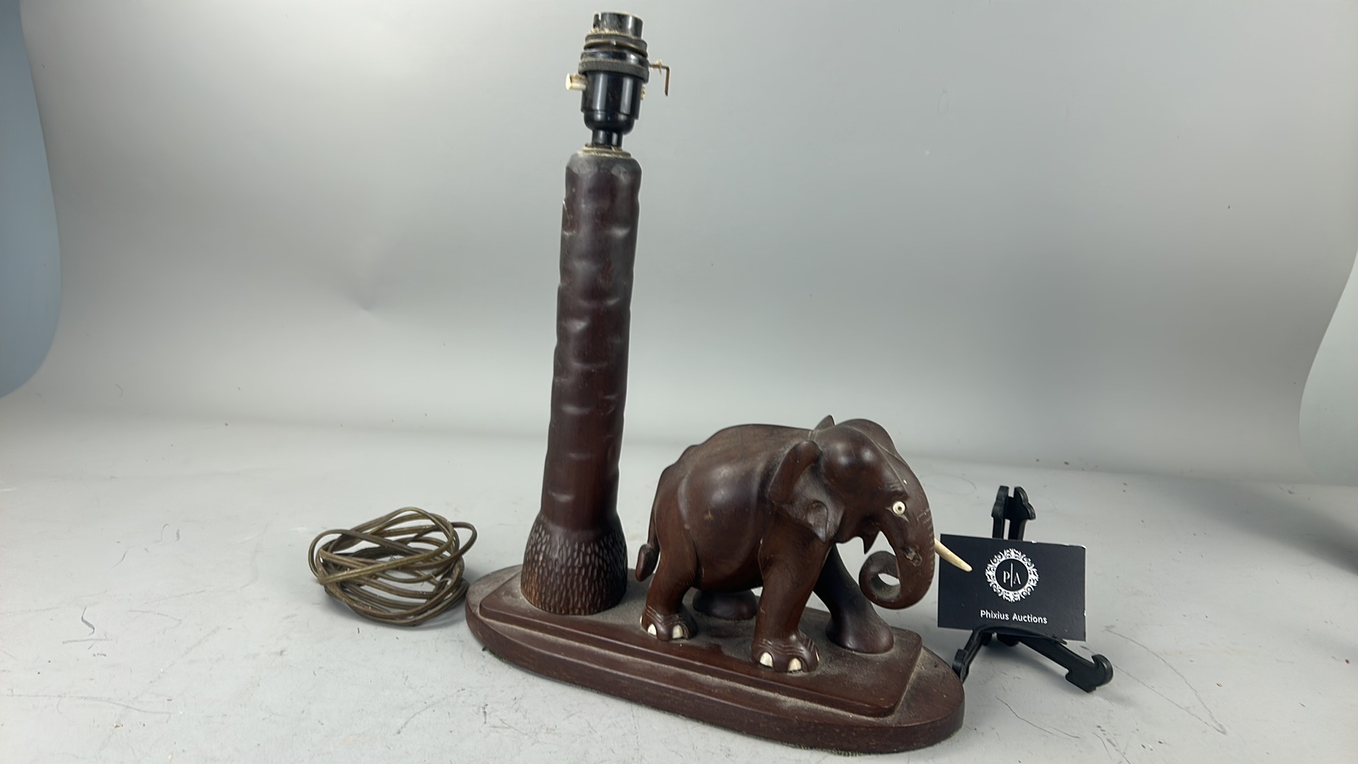 Carved hardwood table lamp base featuring an elephant with inlaid eyes and small tusks beside a palm-tree form column, on shaped plinth, fitted with single bulb holder.