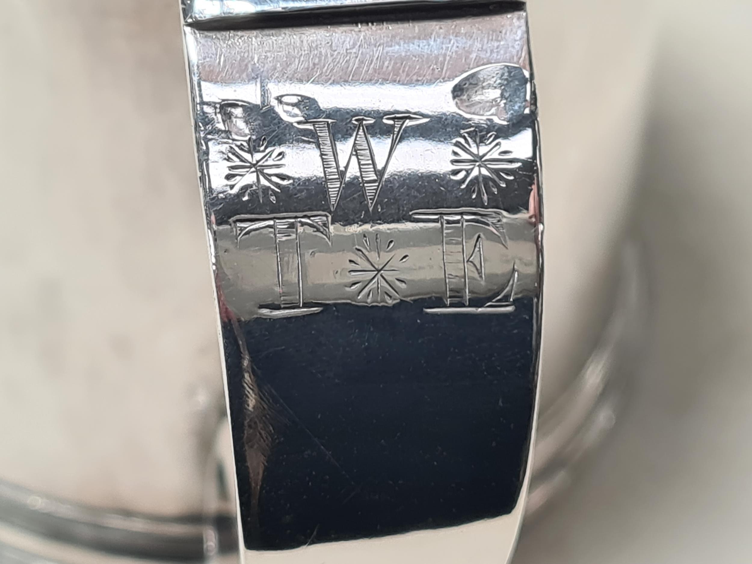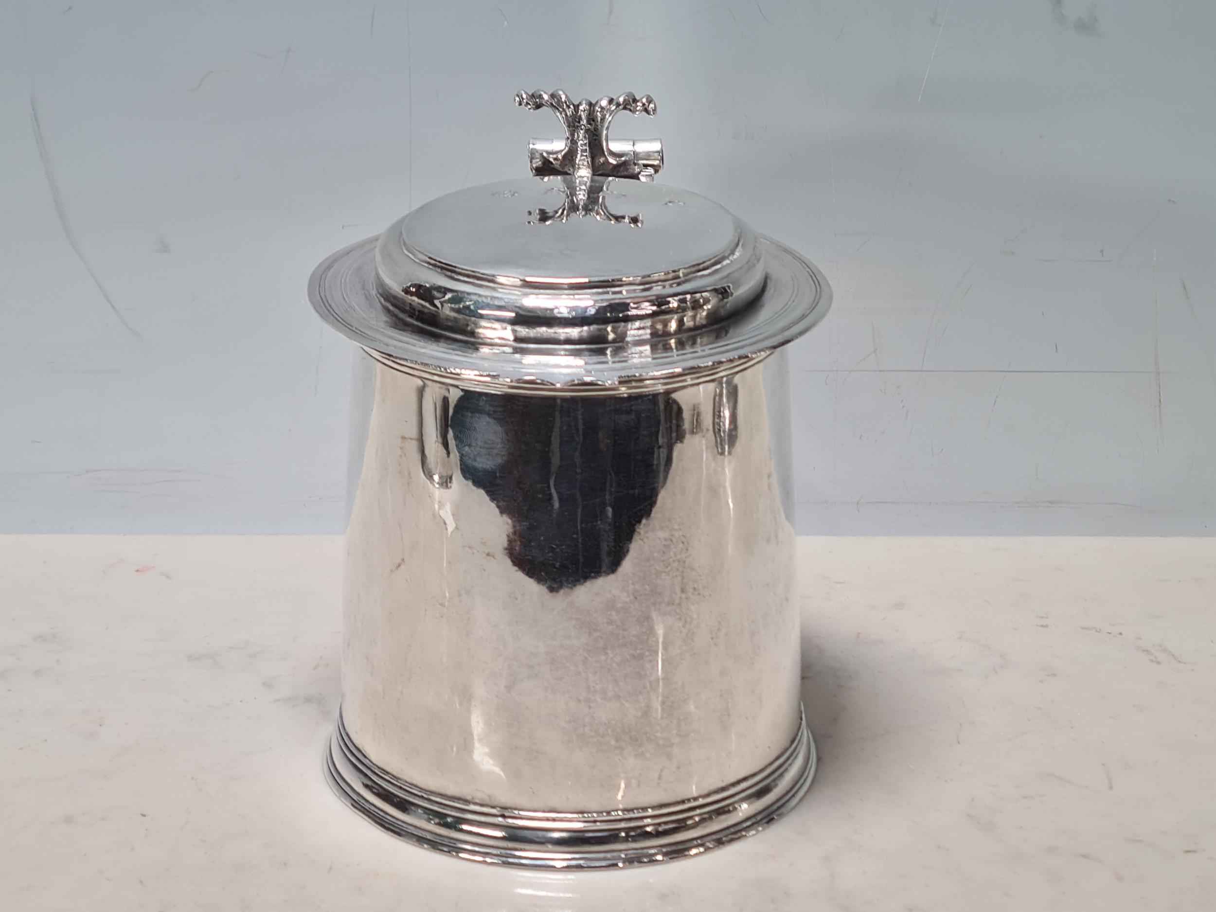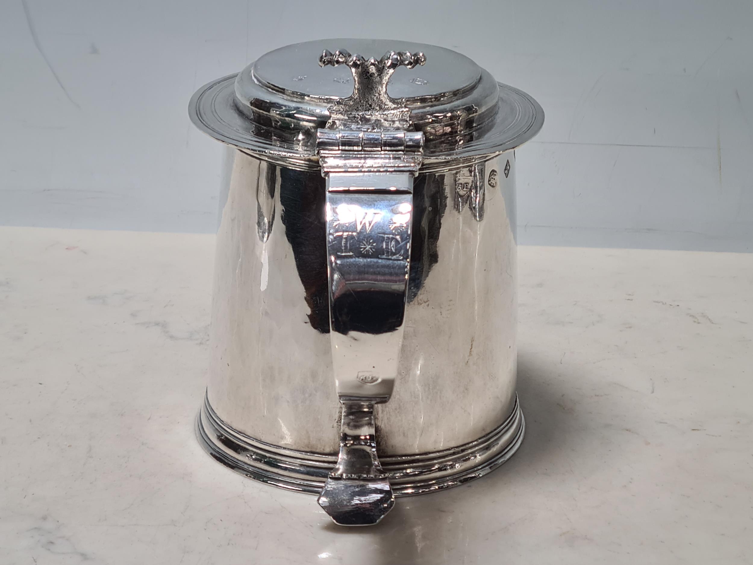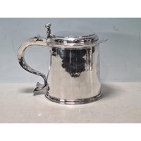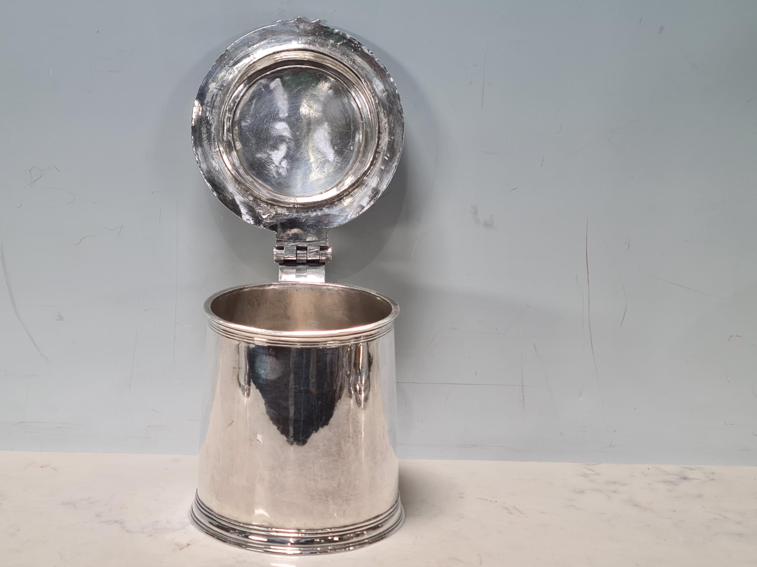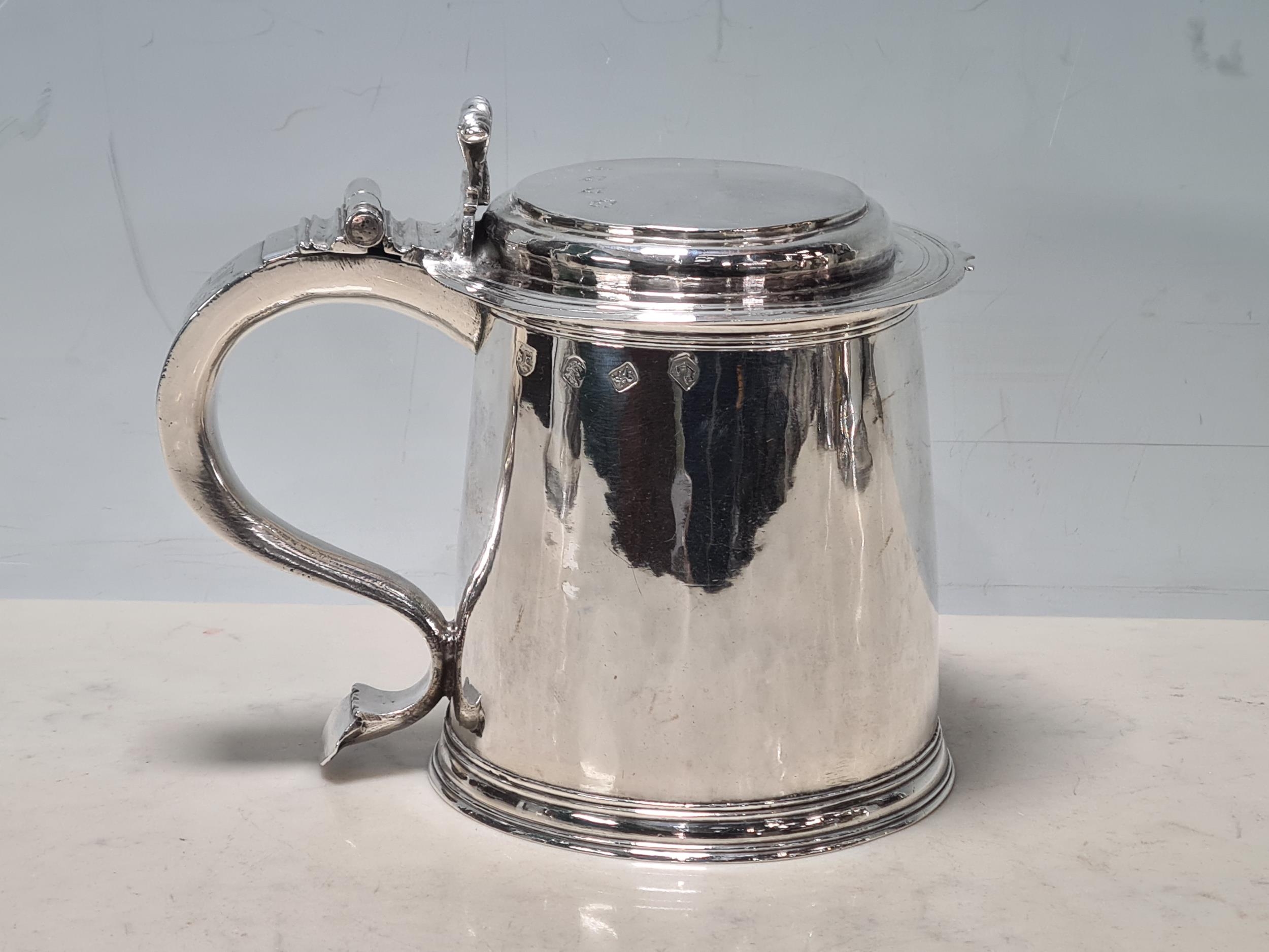 A Charles 11 silver plain lidded Tankard with double scroll thumb piece, flat section lid, London 1682, maker: S.E, 5 3/4in high, 620gms