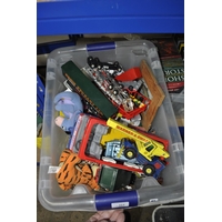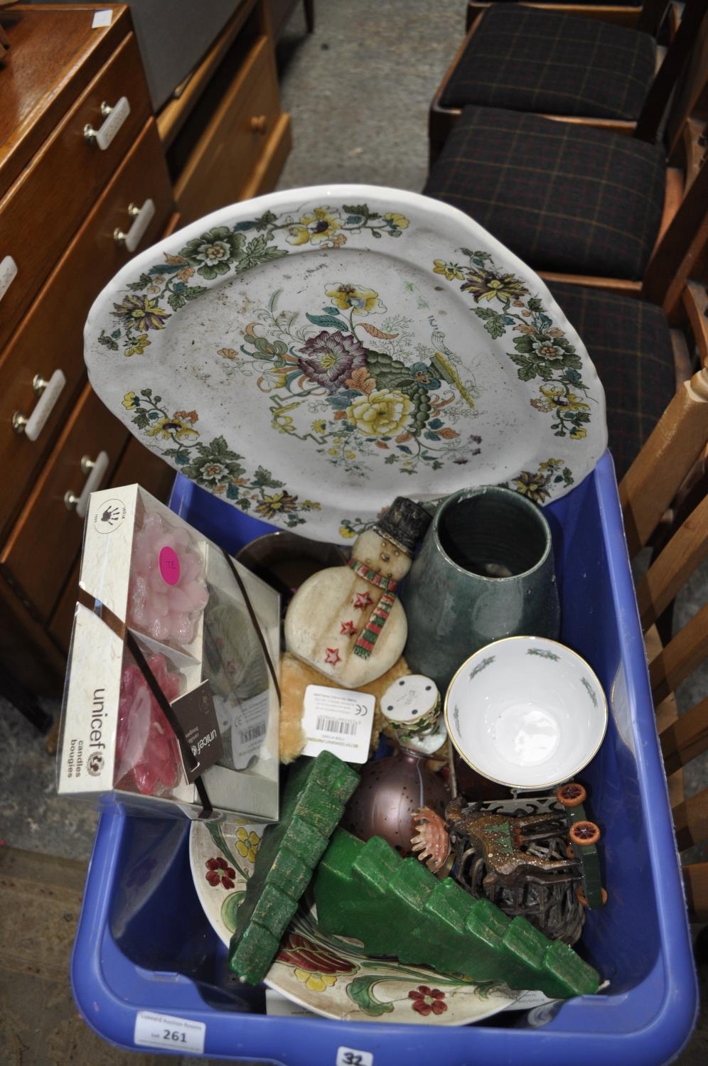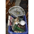 BOX OF ASSORTED TOYS, CHINAWARE AND PLATTERS